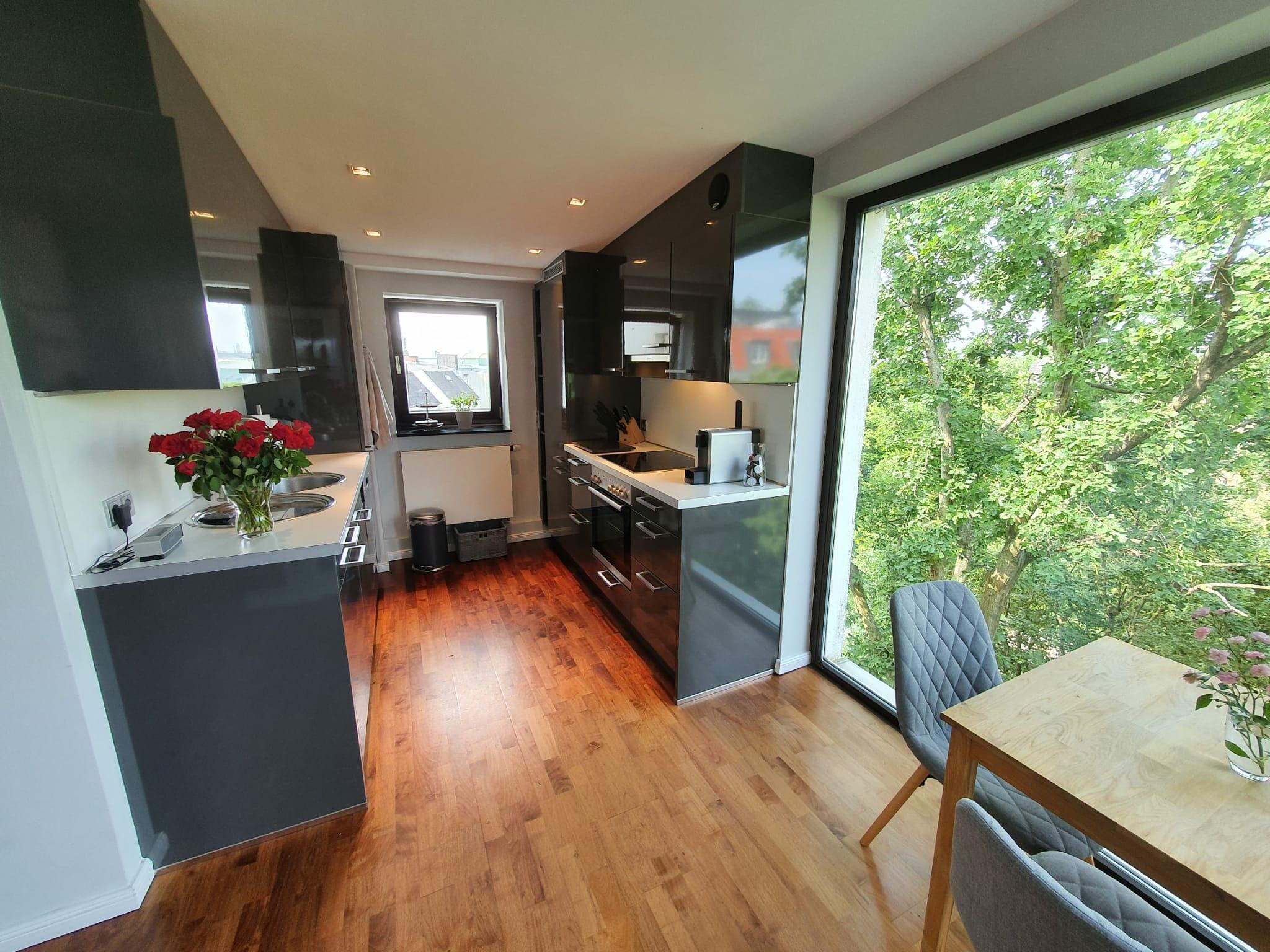 Diese Penthouse-Wohnung wurde nachträglich in den Dachstuhl eines schönen Altbaugebäudes in einem ruhigen Wohnviertel in Hamburg-Eimsbüttel gebaut. Sie verfügt über eine moderne Einrichtung und Gestaltung, besitzt aber trotzdem einige Altbauelemente, wie beispielsweise belgische Heizkörper aus dem 19. Jahrhundert mit aufwendiger Verzierung und alte, massive Türen mit verzierten Beschlägen. Die Inneneinrichtung verfolgt einen rustikalen Industriestil, der durch hochwertigen dunklen Parkettboden unterstützt wird. In der Wohnung sind viele Pflanzen, die mit ihren Grüntönen das Ambiente aufleben lassen. Die maßgefertigte Küche ist ebenfalls modern und hochwertig in anthrazitfarbener Hochglanzoptik. Das Highlight der Wohnung sind die 3 großen Panoramafenster im Eingangs-, Küchen- und Essbereich, die große Loggia mit Balkon, Dachfenster in Wohnzimmer und Bad mit viel Lichteinlass, sowie der Kamin im Wohnzimmer.