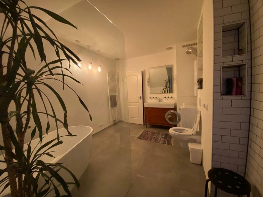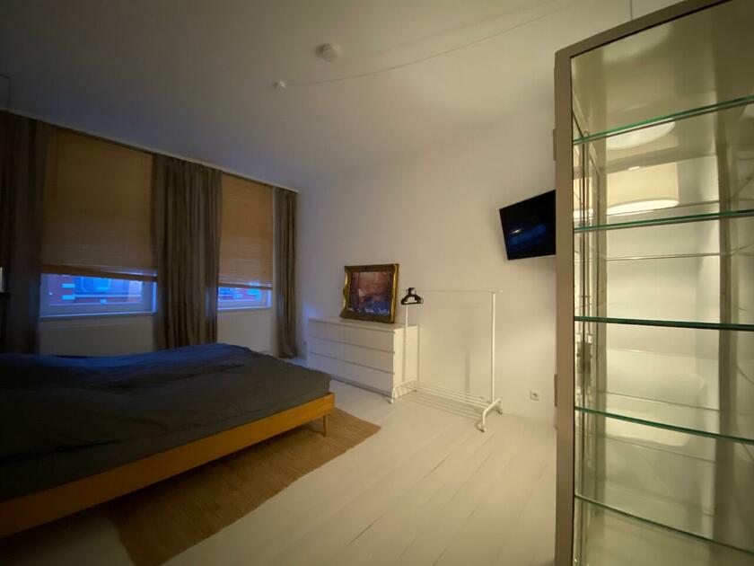 Die Schlafzimmer sind voll möbliert, mit Designklassikern ausgestattet und mit Jalousien und schweren Vorhängen komplett abdunkelbar. Das Bad ist modern und mit einer großen und bodengleichen Dusche und freistehender Design-Badewanne ausgestattet. Der Bodenbelag besteht aus grauen Steinfliesen, die Wände sind weiß gestrichen bzw. im Duschbereich mit weißen Metro-Fliesen gefliest.