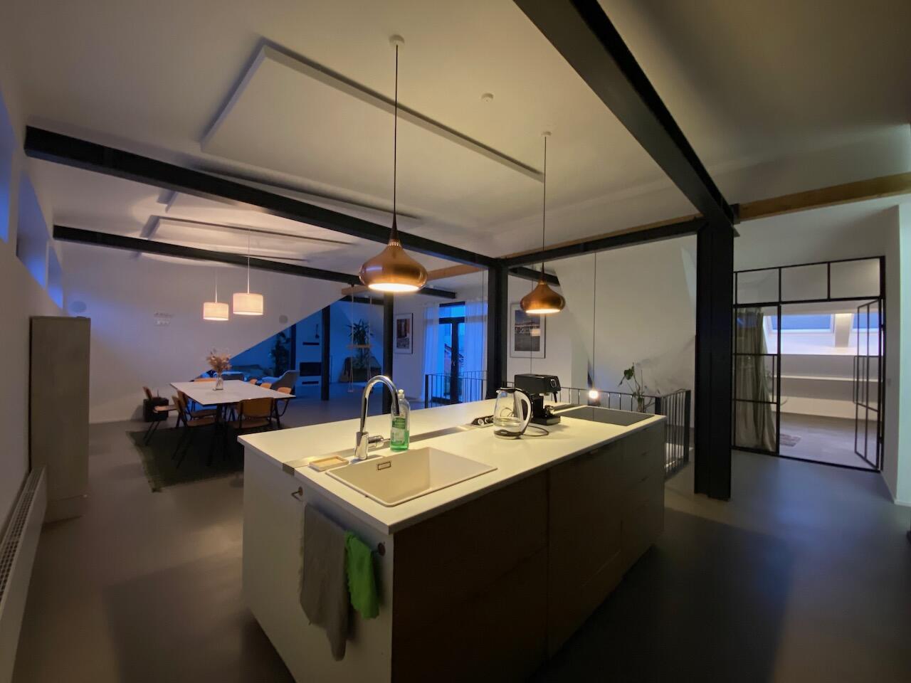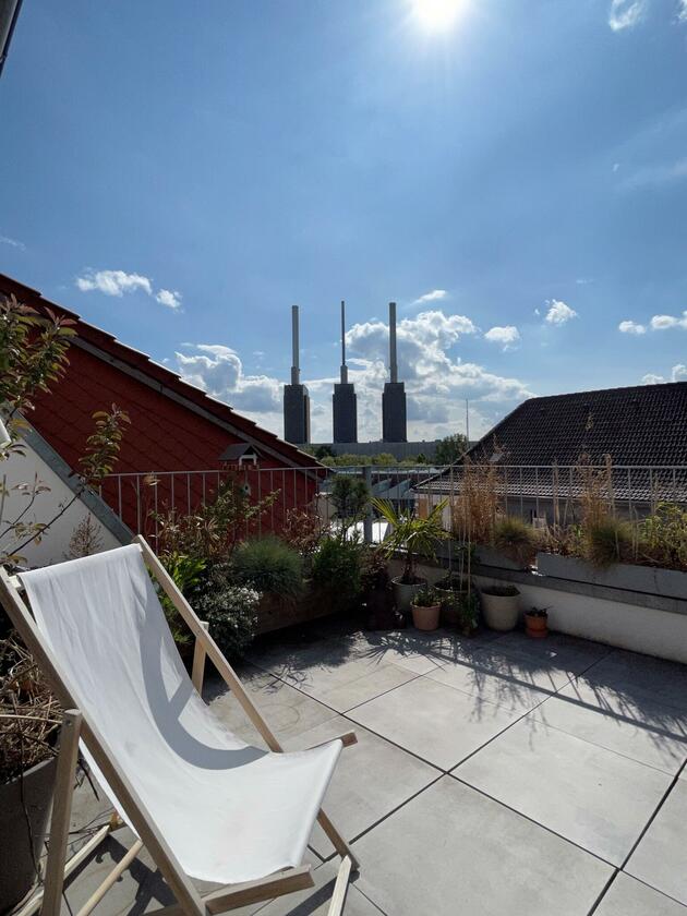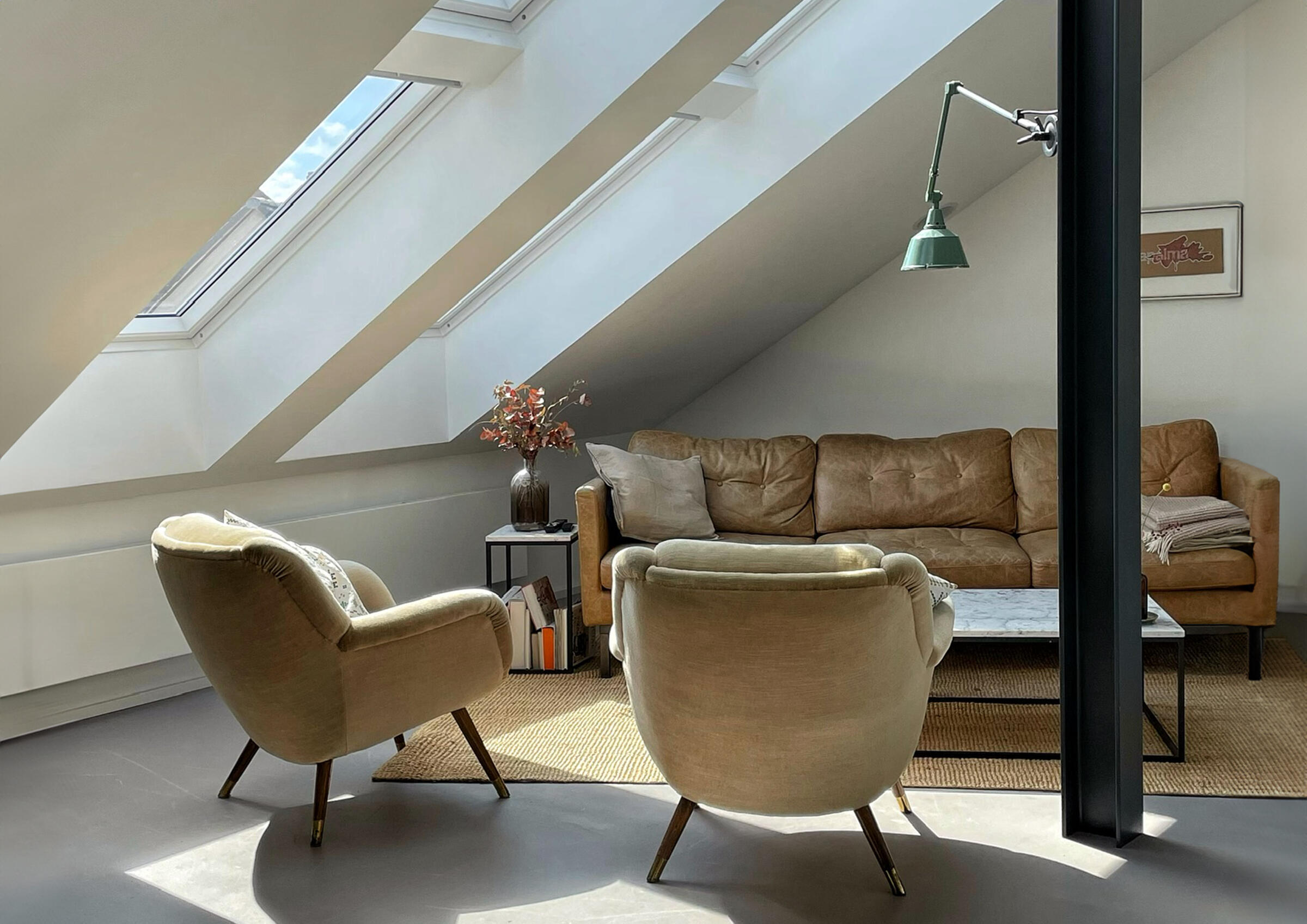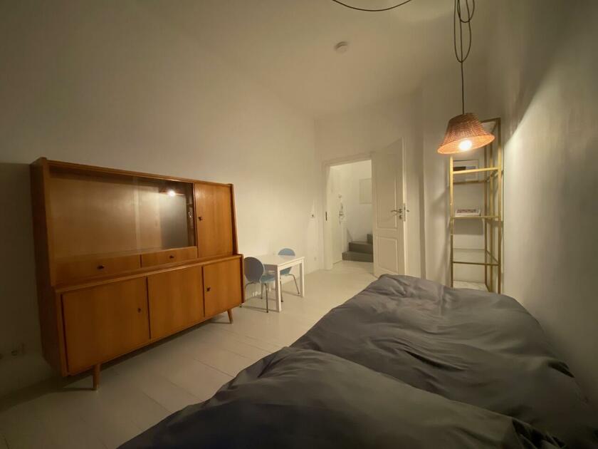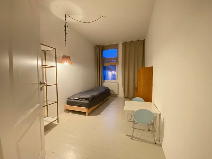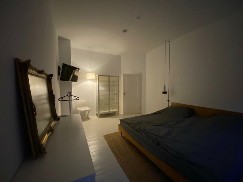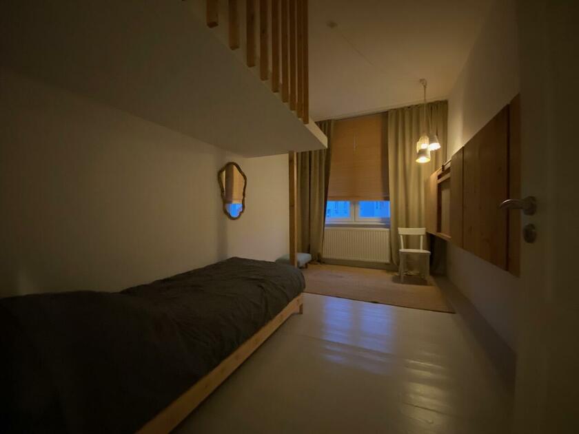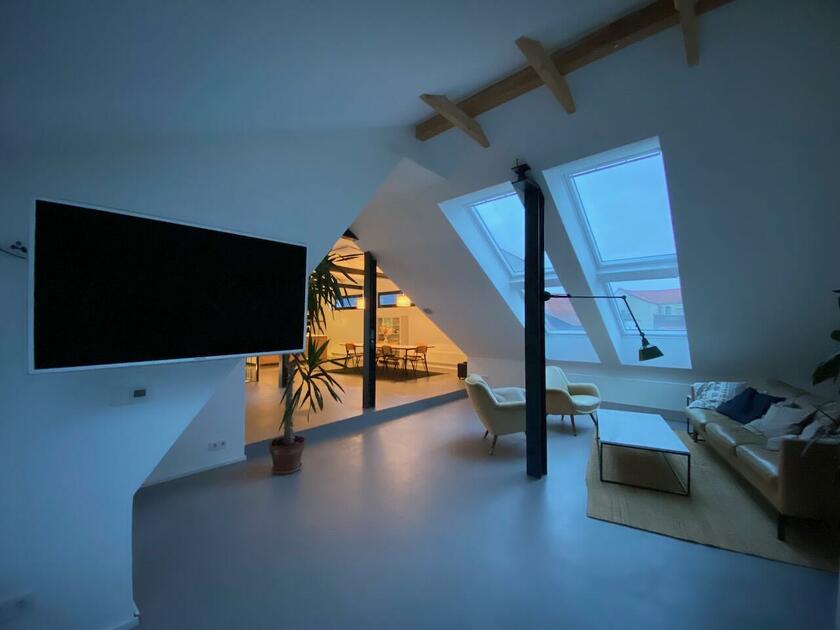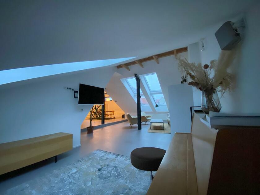 Die 209 m² große Maisonette-Wohnung befindet sich in der dritten Etage eines kernsanierten Altbaus ohne Aufzug. Im unteren Geschoss befinden sich drei möblierte Schlafzimmer sowie ein geräumiges Wannenbad. Der Look ist reduziert und modern. Weiß lackierte Altbaudielen vermitteln einen gemütlichen Altbaucharme.