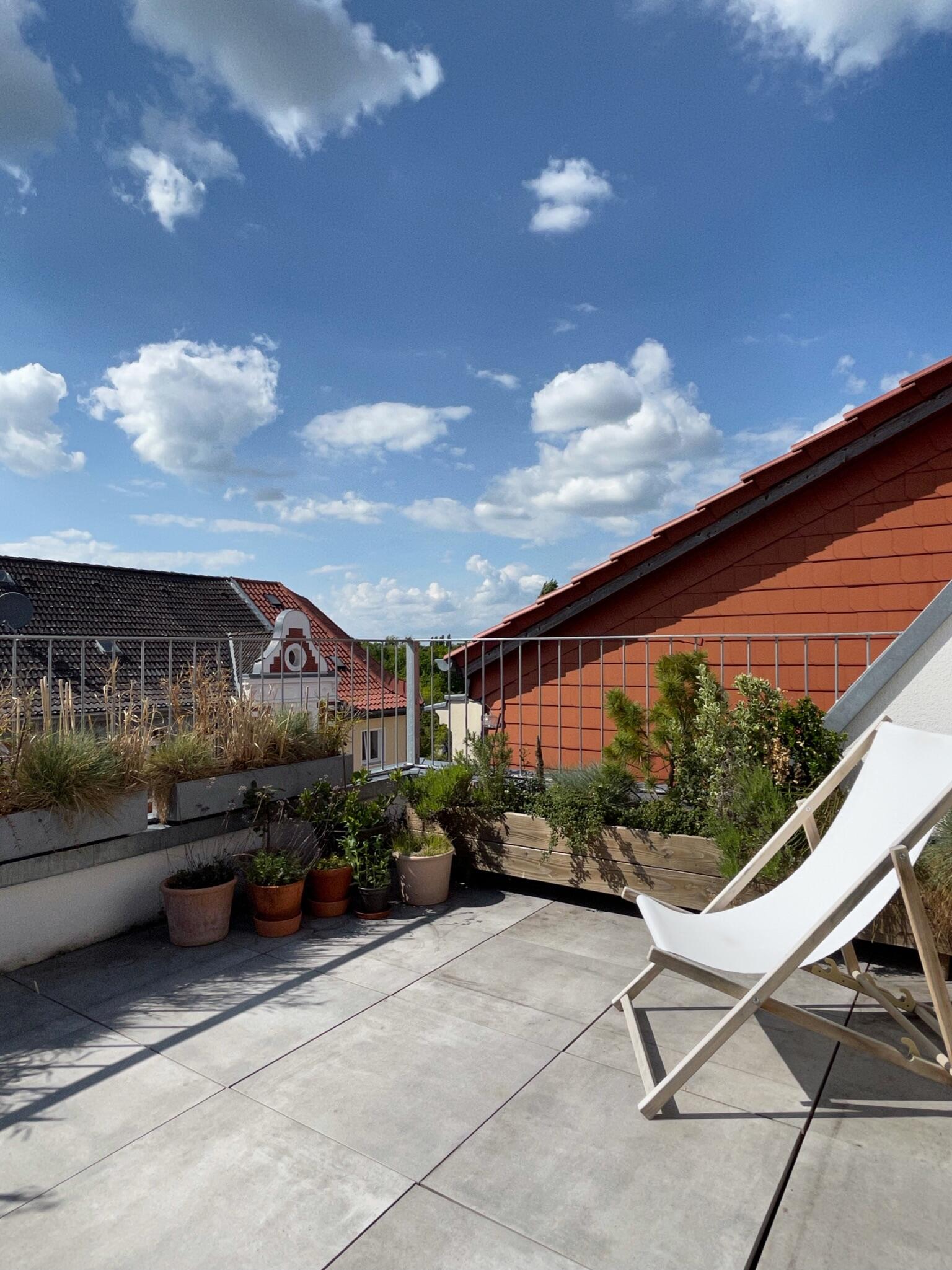 Ebenfalls im Obergeschoss befindet sich hinter dem Küchenbereich versteckt ein Abstellraum mit vielen Regalen sowie die 20 m² große Dachterrasse.