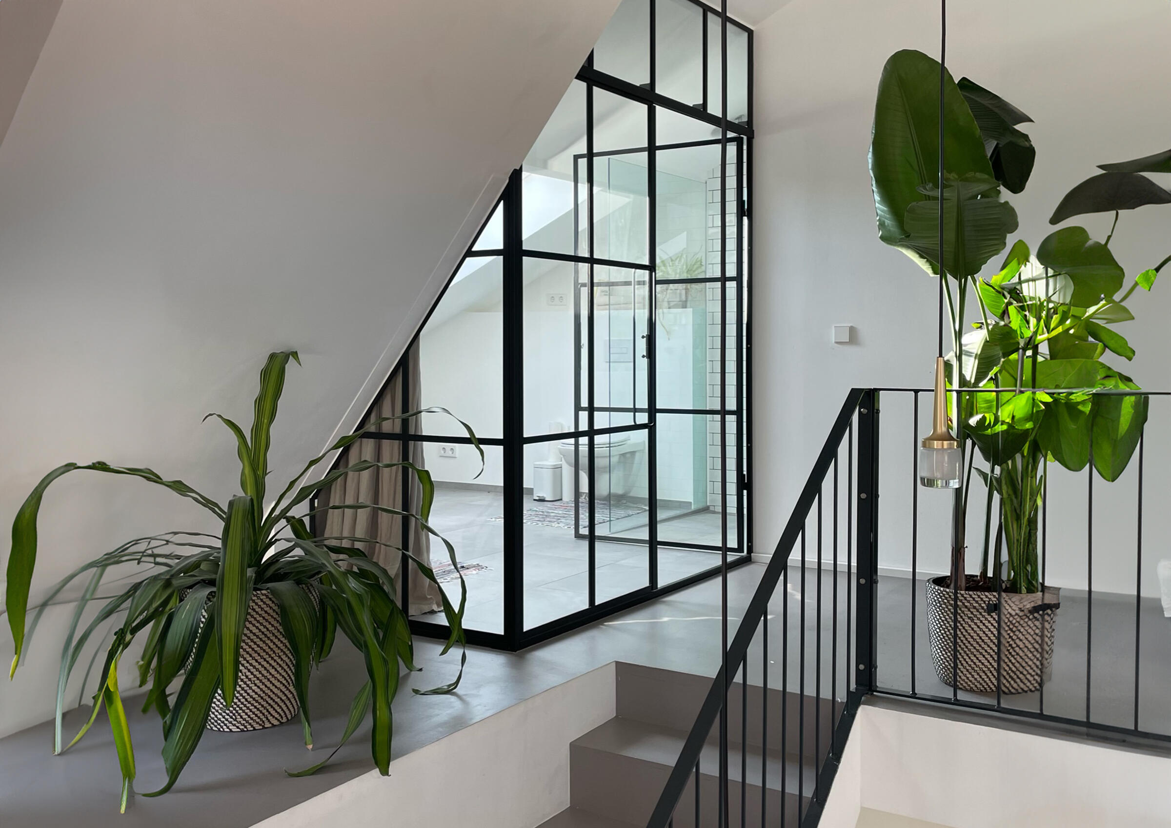 Durch die imposante Galerie mit 7 m Deckenhöhe gelangt man über die zementierte Treppe in das obere Geschoss. Dieser Bereich ist komplett offen gestaltet. Der Look ist minimalistisch und modern. Lackierter Estrich, sichtbare Stahlträger und die Glas-Stahl Trennwand zum Bad vermitteln einen Industrieellen Charme.