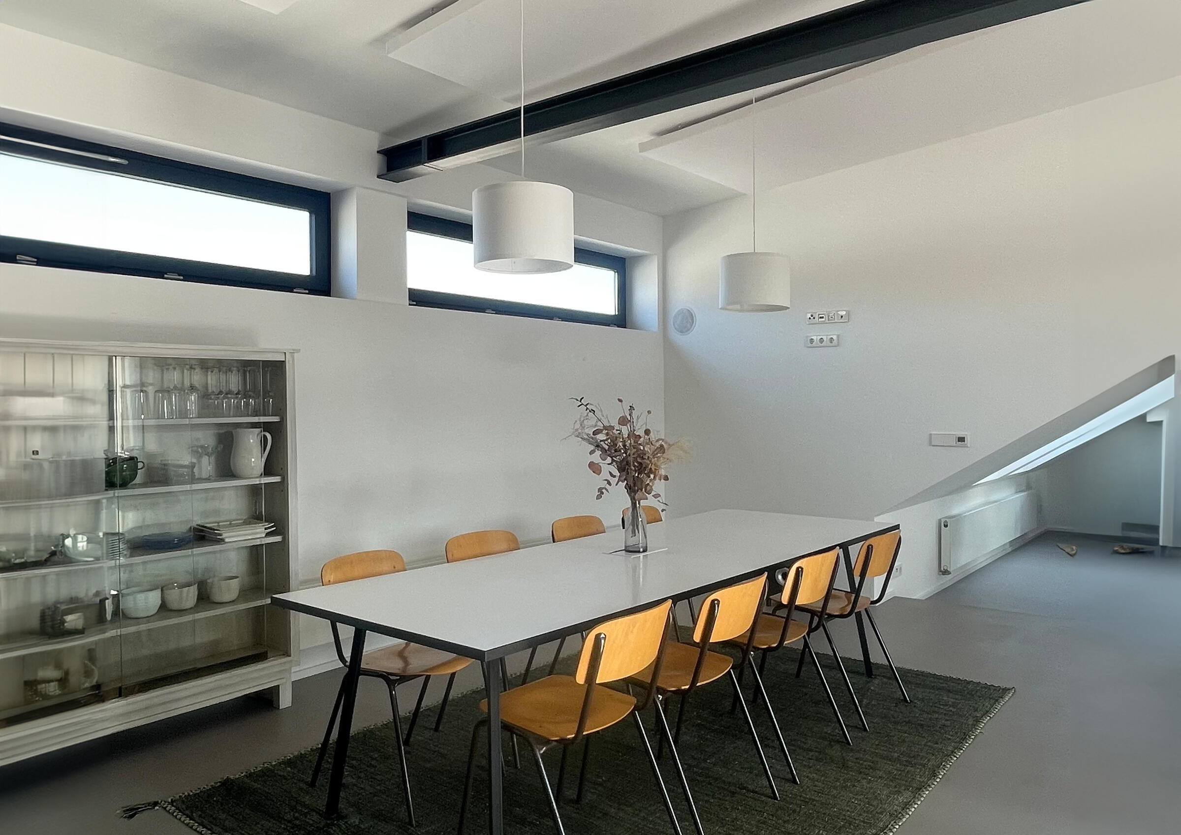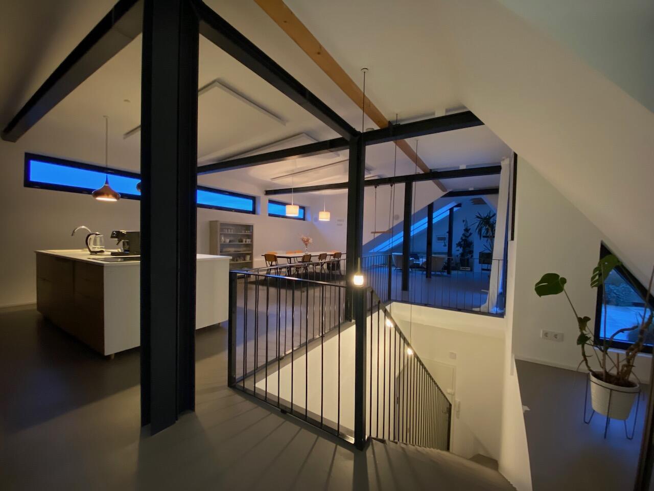 Im 64 Quadratmeter großen offenen Koch- und Essbereich befindet sich eine große, minimalistische Kücheninsel vor einer schwarz matt lackierten Wand mit eingelassenen Kühl- und Vorratsschränken. Illuminiert wird der Bereich durch zwei Designklassiker. Ferner steht in diesem Bereich ein großer moderner Esstisch, an dem 10 Personen Platz finden sowie eine Glasvitrine. Dahinter befindet sich das 43 m² große Kaminzimmer mit Dachschrägen. Das Mobiliar besteht aus einem Echtledersofa, einem Marmor/Stahl Tisch, einem minimalistischen Eichen-Sideboard, dem Mid-Century Klavier und einem großen Kamin. Das Bad ist mit einer großen, bodengleichen Dusche und modernem Waschtisch ausgestattet. Der Bodenbelag besteht aus grauen Steinfliesen, die Wände sind weiß gestrichen bzw. im Duschbereich mit weißen Metro-Fliesen gefliest. Das Bad ist durch eine komplett zu öffnende und durch Vorhänge abzutrennende Glas-Stahl Trennwand mit Rest des Obergeschosses verbunden.