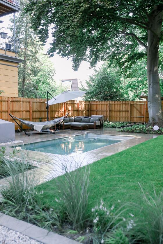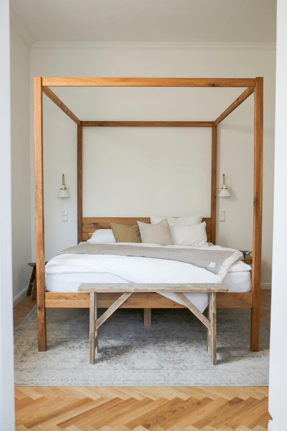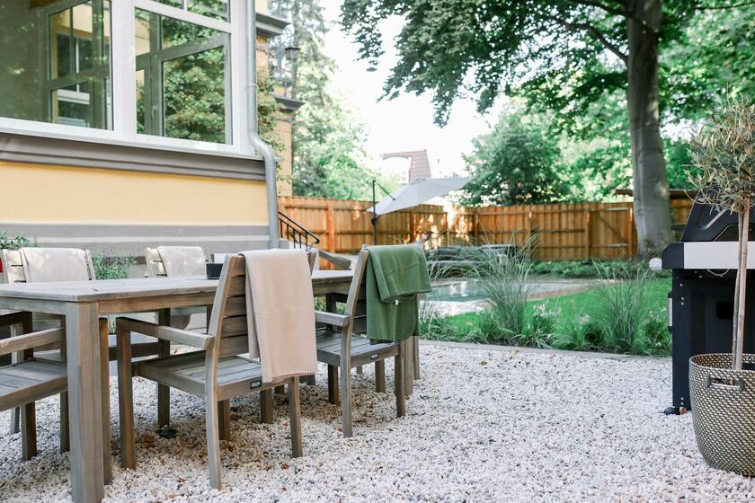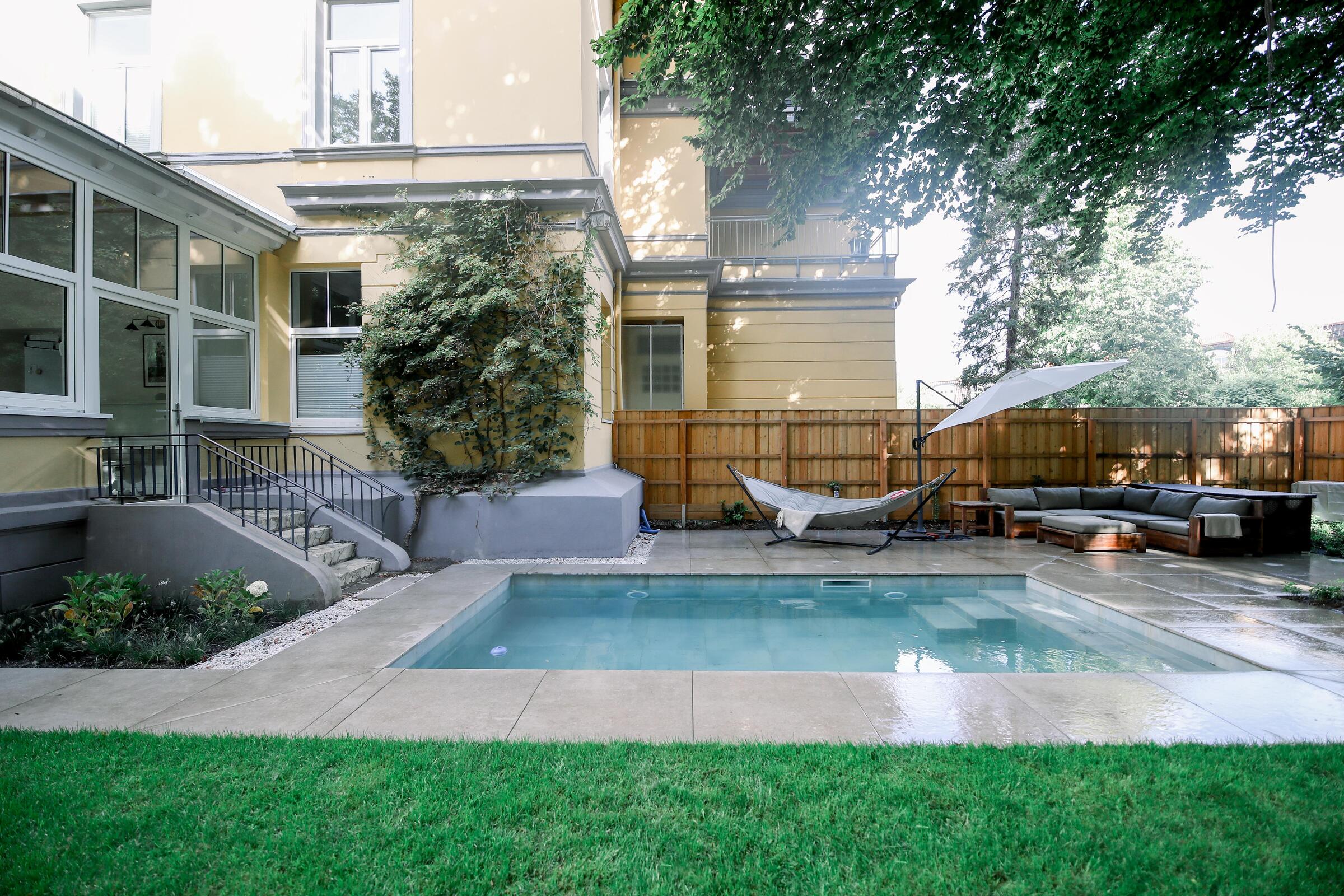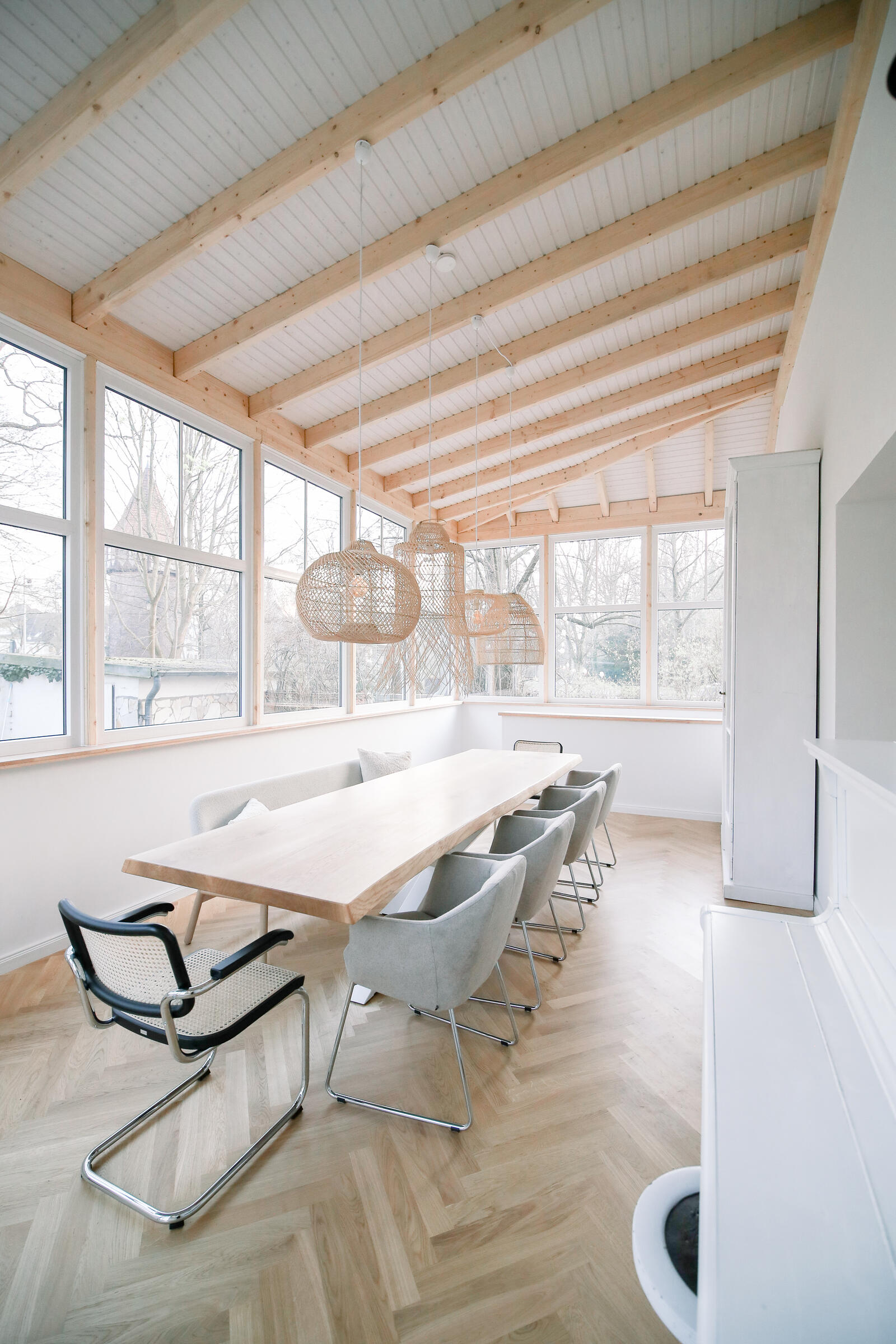 Die Wohnung ist in hellen und natürlichen Farben gestaltet. Sie wurde sehr hochwertig ausgebaut und ausgestattet. Es gibt drei Schlafzimmer, drei Bäder, ein Wohnzimmer, ein Esszimmer (im Wintergarten), eine Wohnküche, einen Archivraum und Garten mit Pool. Alle Räume sind mit Eichenparkett oder Zement-Fliesen ausgestattet. In den Bädern wurden Armaturen von Dornbracht und Villeroy und Boch installiert. Die hochwertige Einbauküche von Küchen Staude bildet den Eingangsbereich und enthält alle gängigen Annehmlichkeiten inklusive BORA Kochfeld und einem freistehenden Side-by-Side Kühlschrank. Durch das im Mid-Century-Stil gestaltete Wohnzimmer samt Kamin gelangt man in den Wintergarten. Dieser dient als Esszimmer, welches von einem großzügigen und hochwertigen Eichen-Esstisch von 3,30 m Länge dominiert wird. Hier gibt es 8 Sitzplätze aus Designerstühlen. Ein weißes Vintage-Klavier und ein Vintage Buffetschrank aus den Niederlanden befinden sich ebenfalls in diesem sonnendurchfluteten Raum. Die Deckenhöhe hier beträgt bis zu 5,00 m. Ein Highlight ist der 2022 neu gestaltete Garten samt Pool (ca. 3 x 6m).