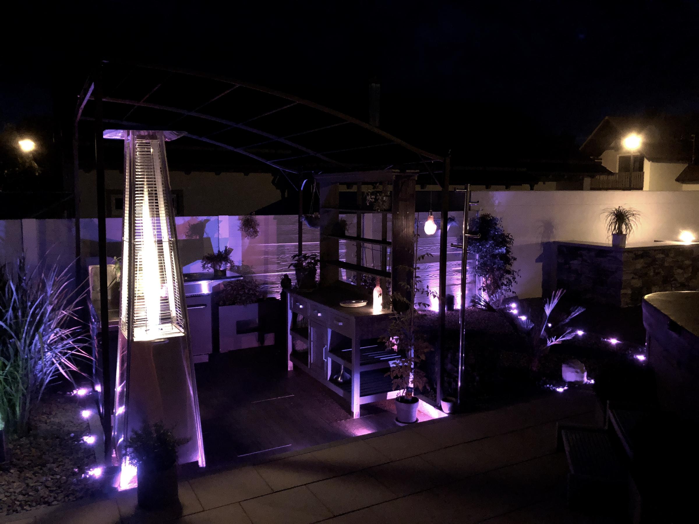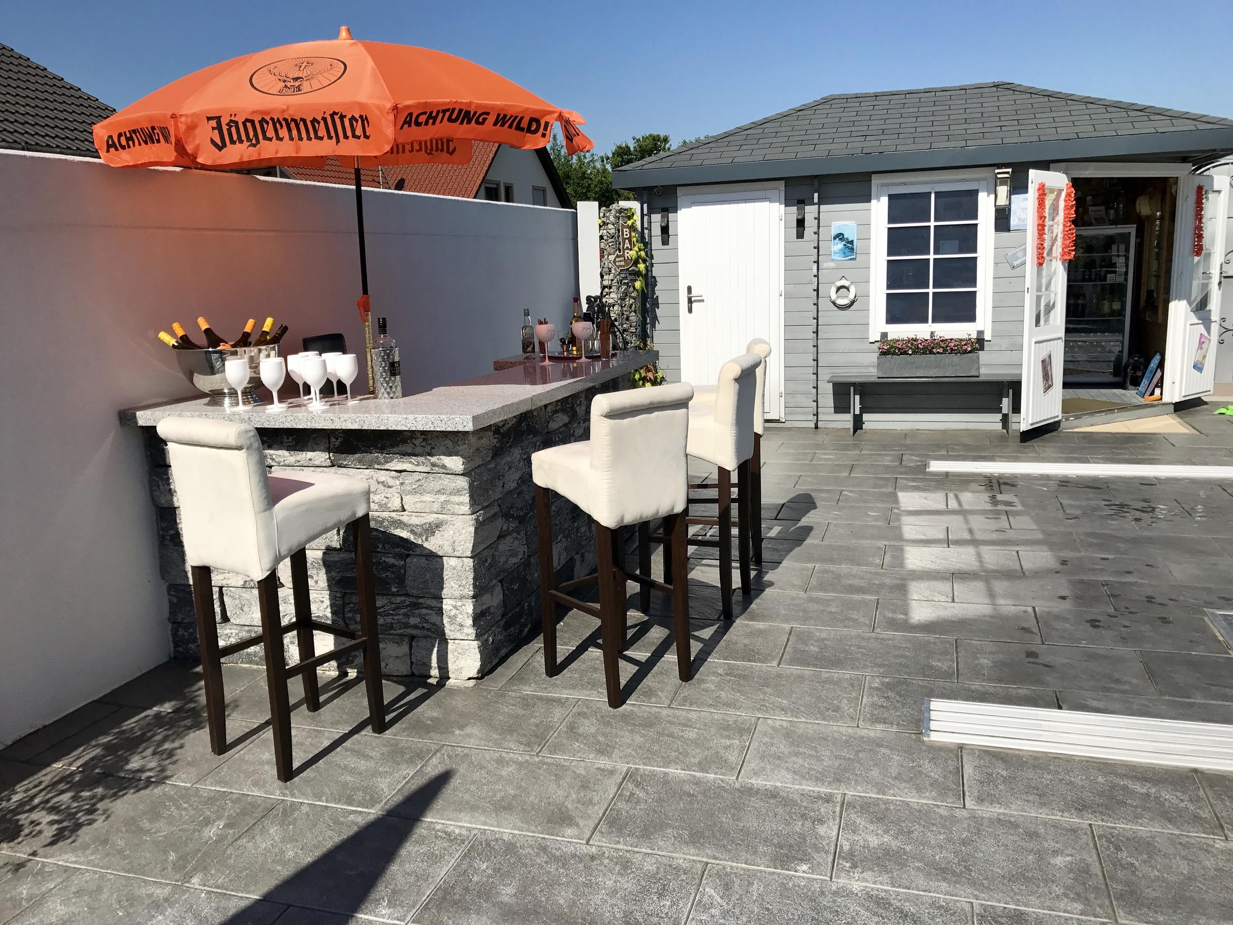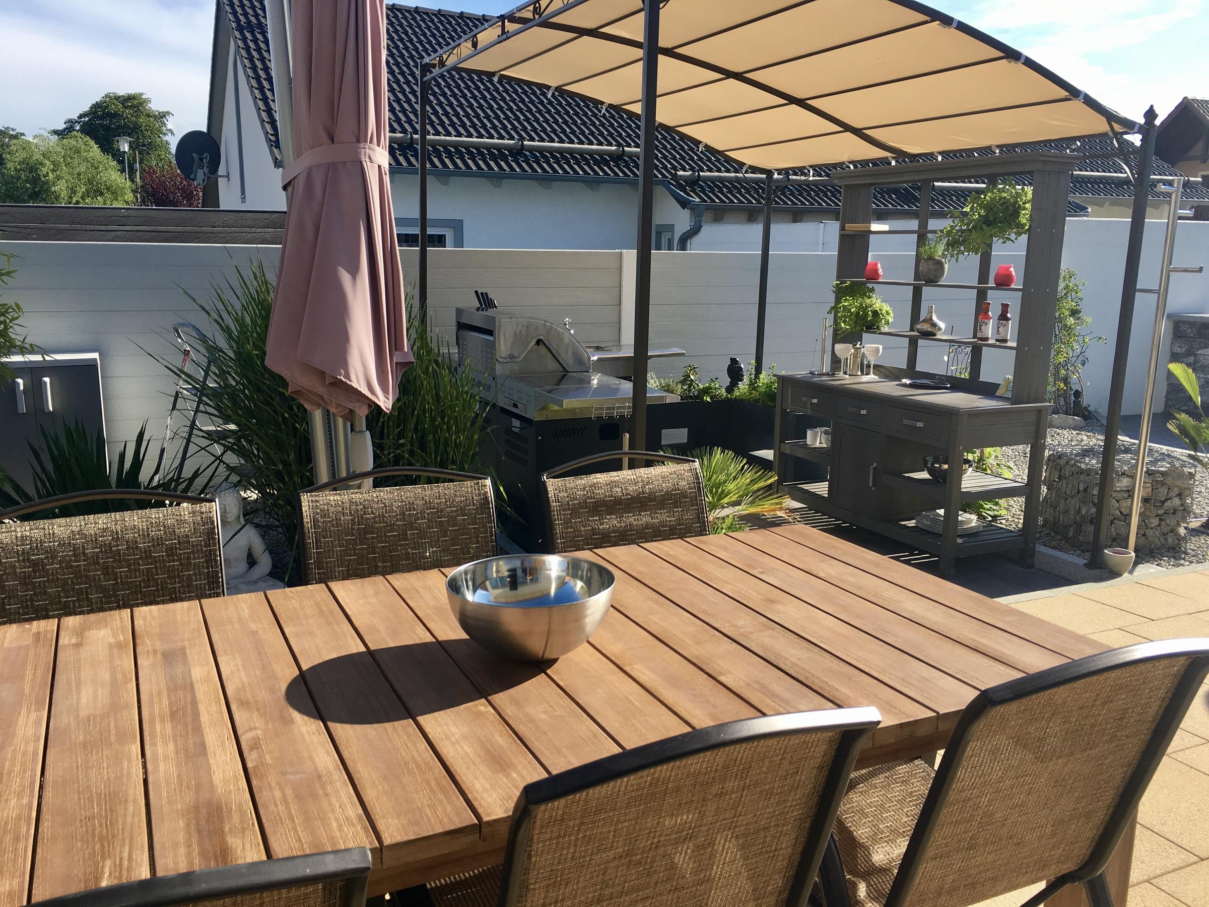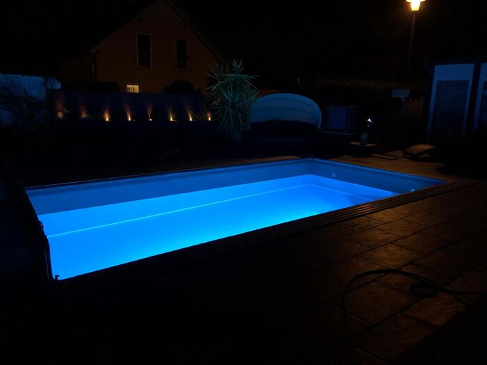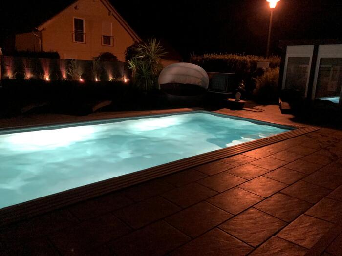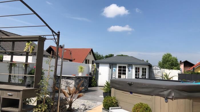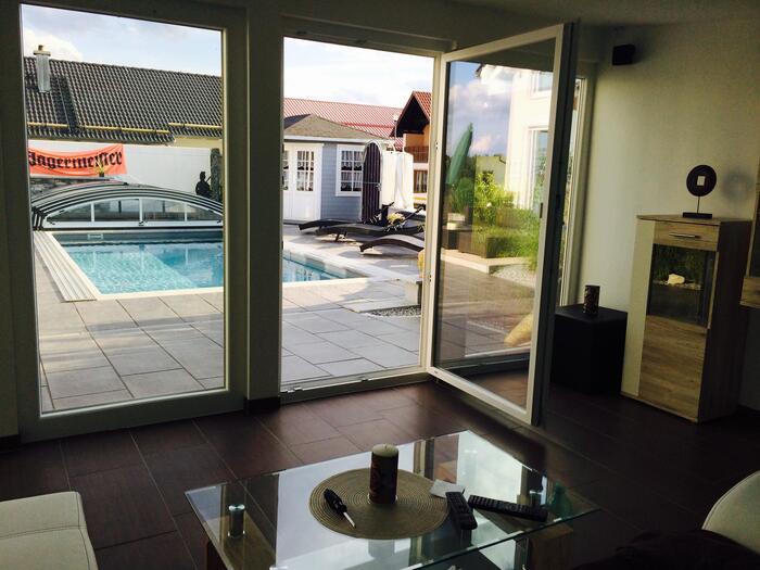 Der großzügige Außenbereich beinhaltet einen Swimmingpool mit den Maßen 7x3 m, mit LED-Farblicht und Gegenstromanlage. Vom Poolhaus hat man einen weiten Blick auf die Pool-Landschaft, die nach Süd-Westen ausgerichtet ist. Auf der großen Terrasse befindet sich ein Jacuzzi/Whirlpool von Villeroy & Boch für 4 Personen, eine Granitsteinbar und eine fest installierte Betonlounge unter der Terrassenüberdachung samt Kamin zum Wärmen im Winter oder für laue Sommernächte. Die mit einem Segel überdachte Außenküche mit Wasseranschluss liegt neben der Feuerstelle, die mit Gartenmöbeln ausgestattet ist. Im Gartenhaus befindet sich eine integrierte Sauna, daran anschließend ein Dusch- und WC-Häuschen. Im Süden befindet sich eine Rasenfläche. Nach Regensburg beträgt die Entfernung ca. 30 km.