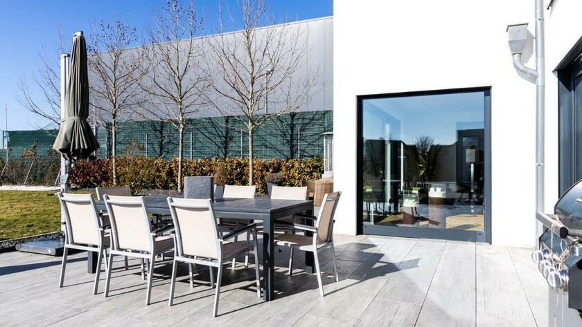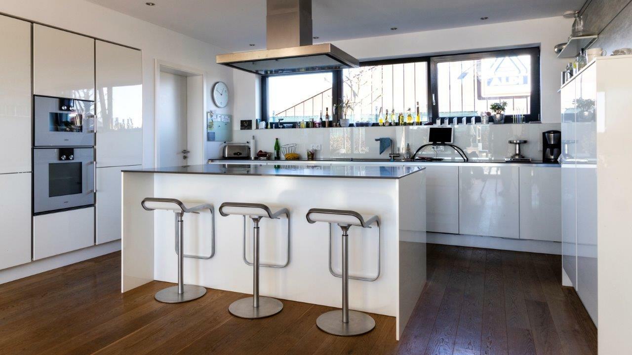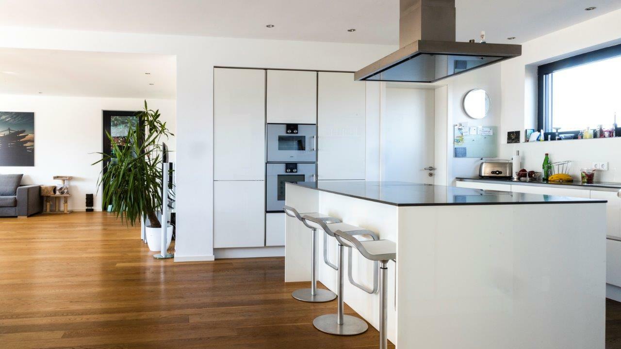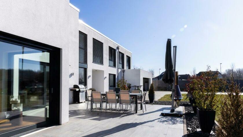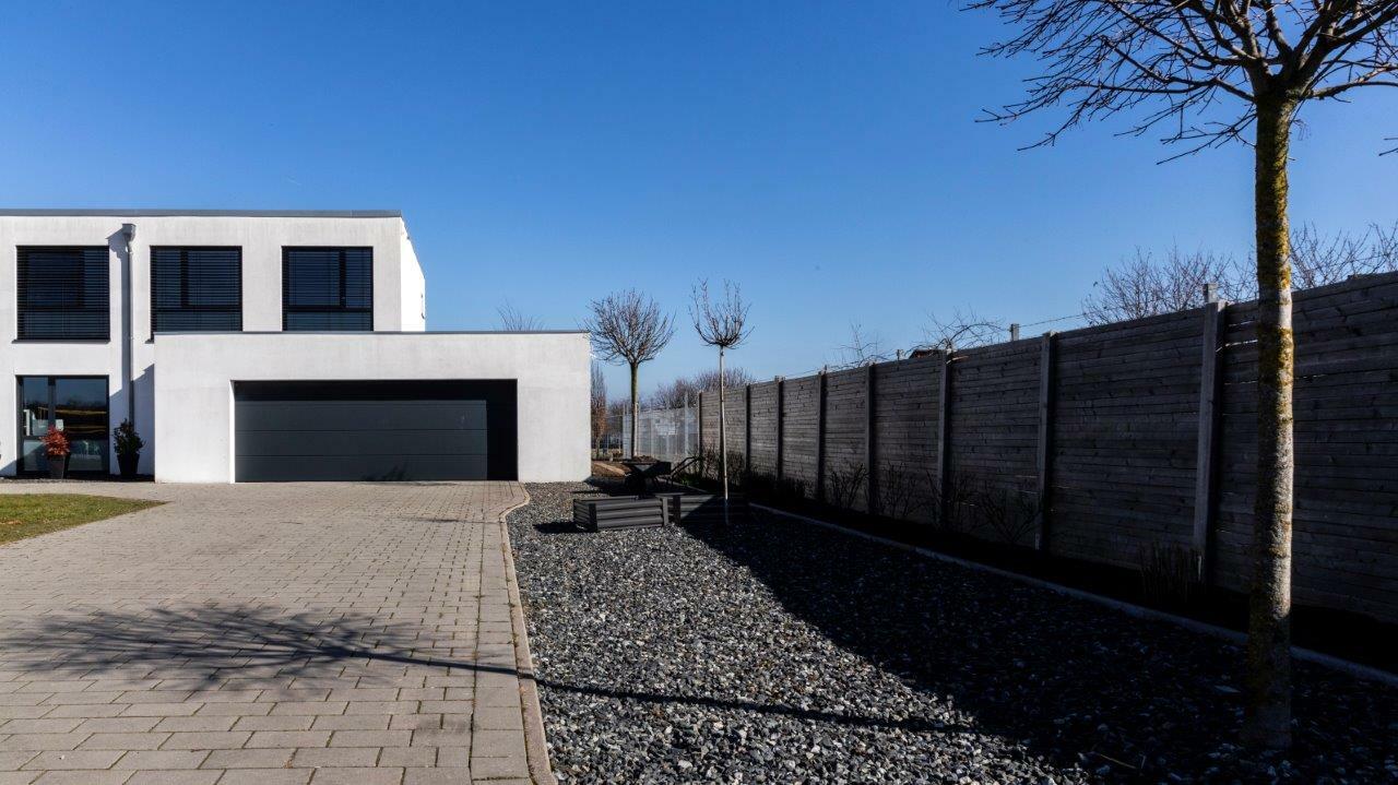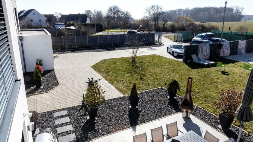 Die helle und moderne Villa im Kubus-Bauhausstil wurde 2014 erbaut und hat zwei Etagen mit einer Fläche von ca. 400 m², wovon 80 m² Garagenfläche sind.