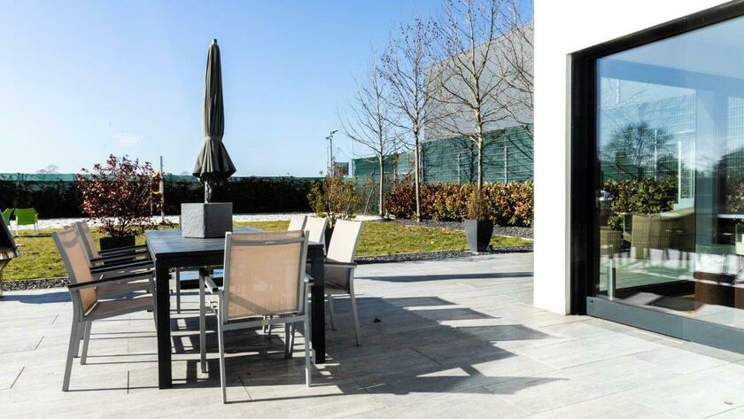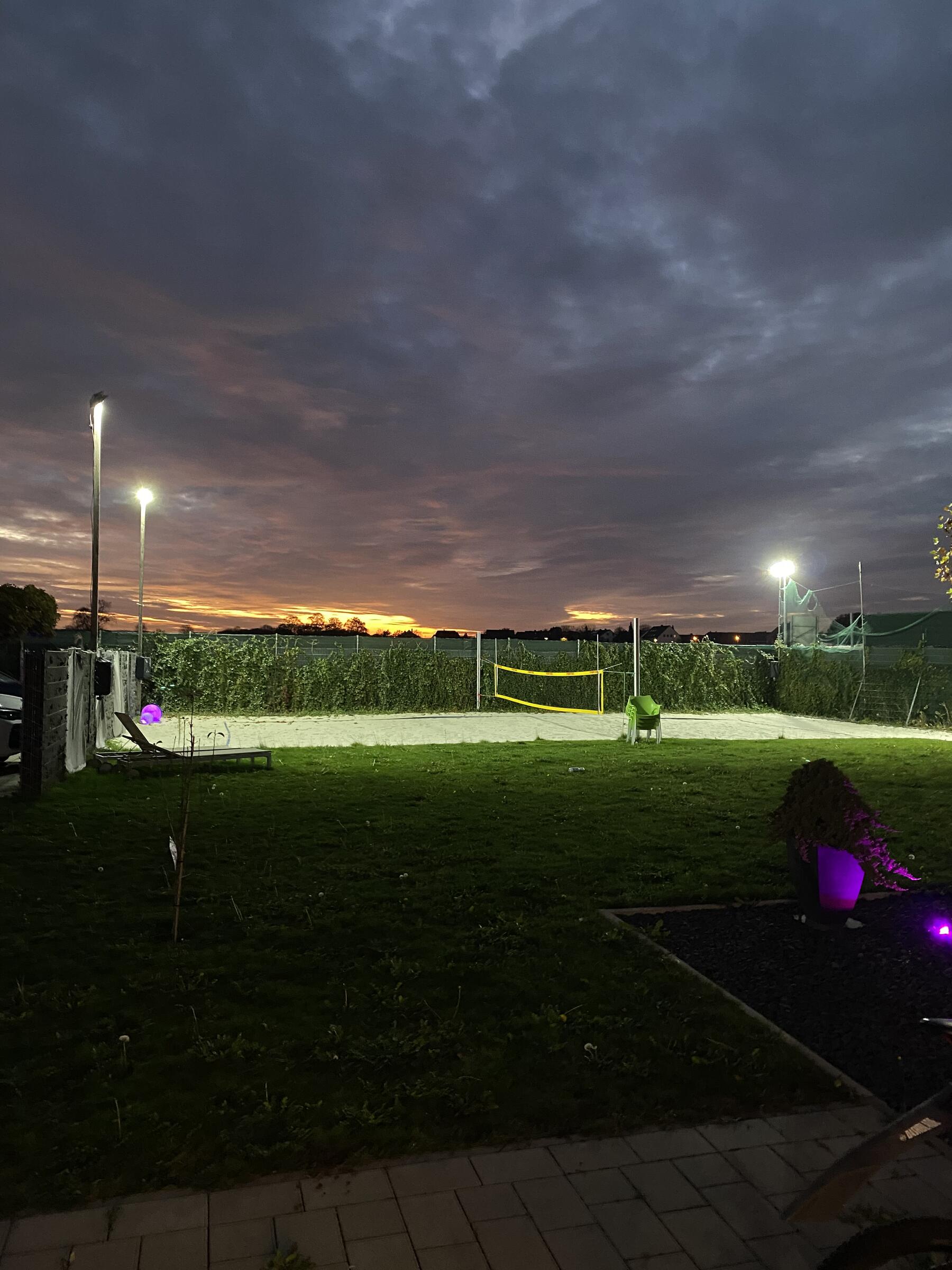 Im Außenbereich der Villa gibt es ein eigenes Beachvolleyballfeld mit 120 t weißem Quarzsand und Flutlichtanlage. Das 1700 m² große Grundstück ist ebenerdig und uneinsehbar und befindet sich am Rand eines Gewerbegebietes ohne Nachbarn. Für Produktionen stehen auf dem Grundstück 7 Parkplätze zur Verfügung. Auch Lkw können das Grundstück befahren. Die Villa befindet sich ca. 300 m Luftlinie von der Bundesstraße B3.