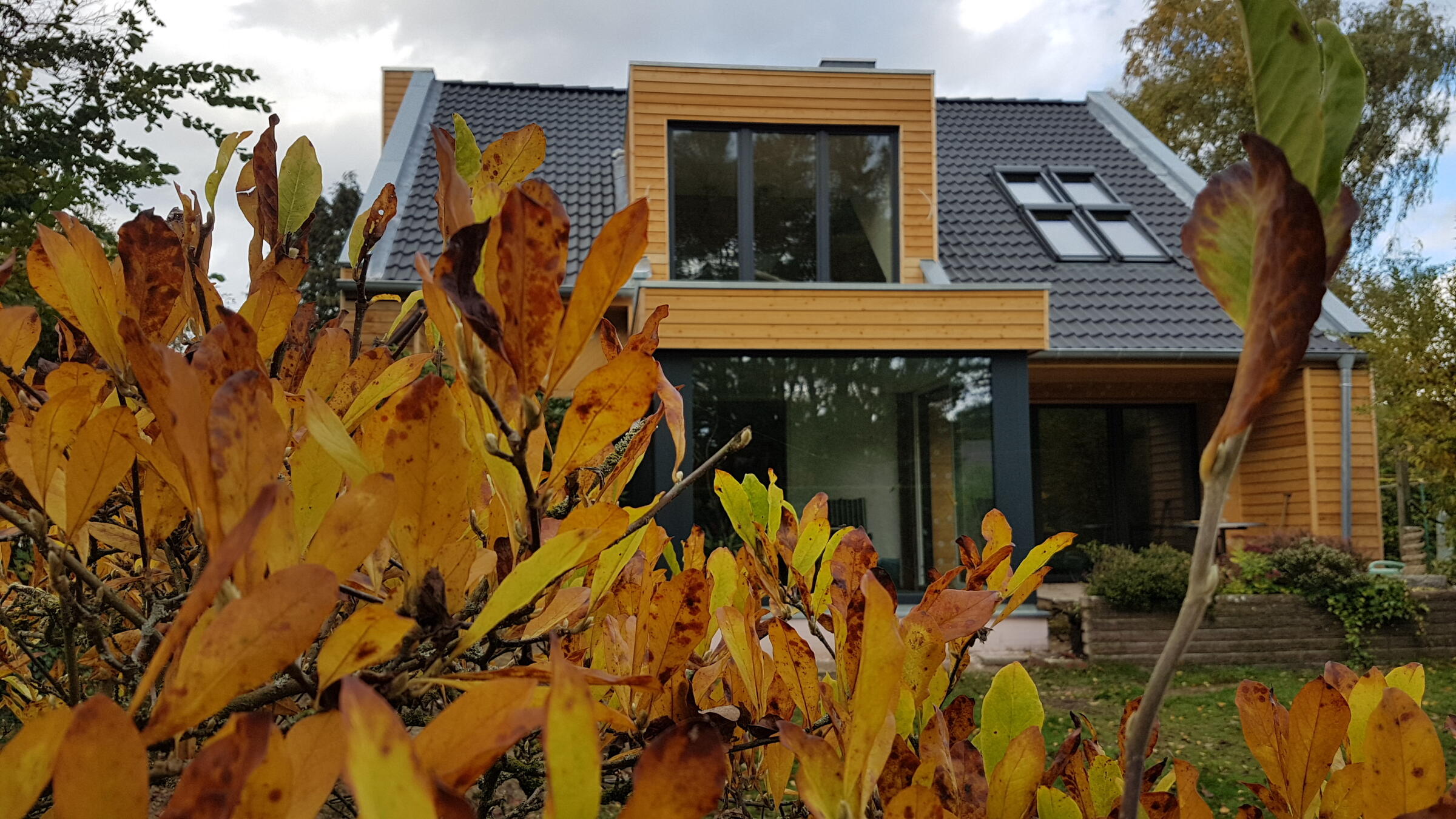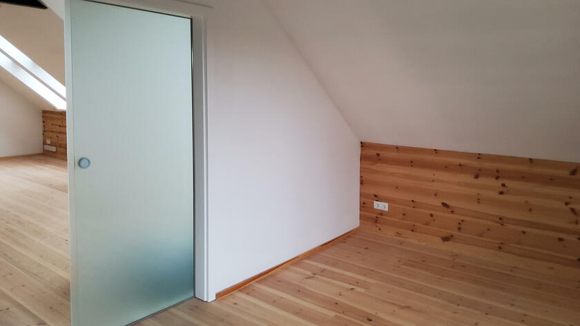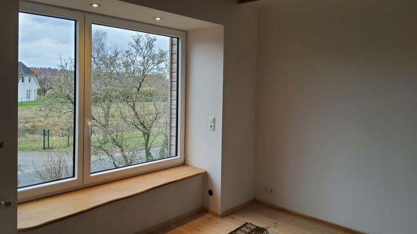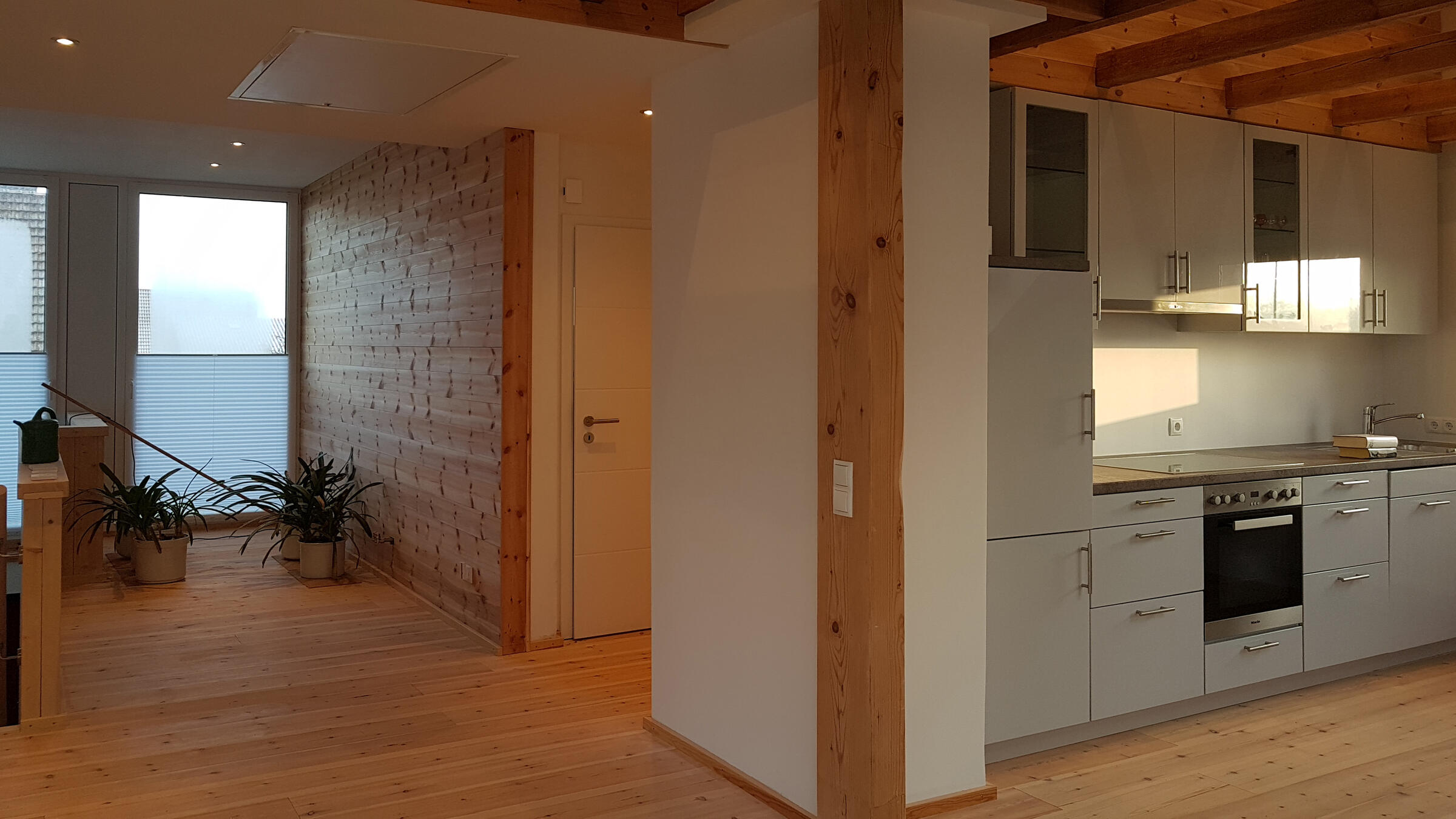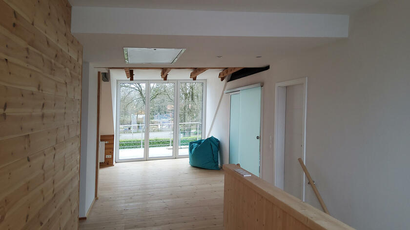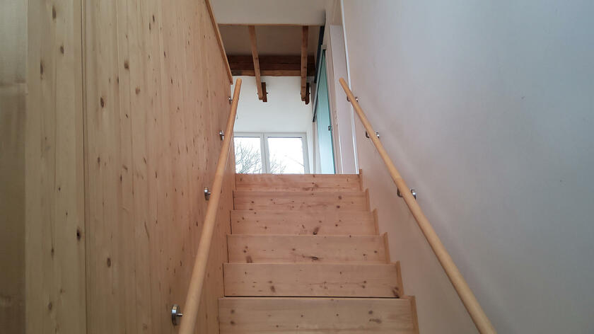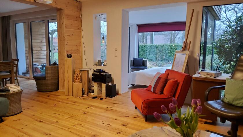 Das Haus wurde 1966 erbaut und 2019-2020 zeitgemäß saniert. Um das anspruchsvolle flexible Raumprogramm zu realisieren, setzte die Architektin auf modulare Einschübe in Holzbauweise. Der Einschub auf der Südseite bietet einen Wintergarten für die Wohnung im Erdgeschoss, dessen Decke die großzügige Dachterrasse der Gaube im ersten Obergeschoss bildet. Auf der Nordseite markiert ein weiterer Holzquader den neuen markanten Eingangsbereich mit den Außentüren der beiden Wohnungen. Bevor man die geradläufige massive Holztreppe ins Obergeschoss betritt, passiert man eine optionale Verbindung zur Wohnung im Erdgeschoss. Das Treppenhaus besticht durch eine Raumhöhe von fünf Metern und bietet den Blick hinaus in den angrenzenden Eichenwald. Der von Holzwänden flankierte zentrale Wohn-, Koch- und Essbereich im Obergeschoss bietet dank großzügiger Fensterflächen Ausblicke in alle Himmelsrichtungen und gibt den Blick auf offene Dachsparren frei. Ein Sitzfenster erinnert an den ehemaligen West-Balkon. Im Erdgeschoss wurden zugunsten von mehr Transparenz und einer offenen Küche ebenfalls trennende Wände entfernt. Durch den gewachsenen Garten mit vielen alten Sträuchern und Büschen entsteht so in jeder der Wohnungen eine spannende Korrelation von innen und außen, geprägt durch die neuen Sichtachsen der eingeschobenen Module. Momentan wird die untere Wohnung von den Besitzern selbst genutzt und ist leicht möbliert. Die obere Wohnung steht leer und wird nur gelegentlich von Gästen genutzt.