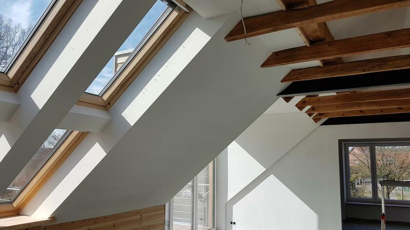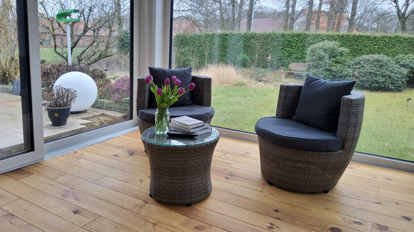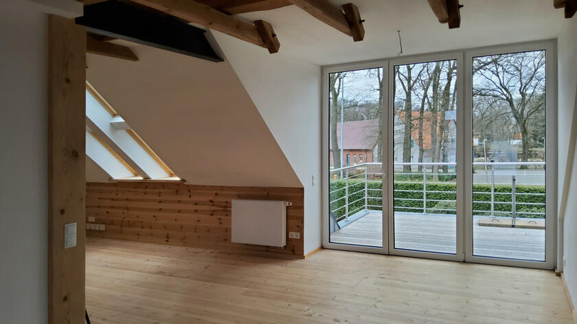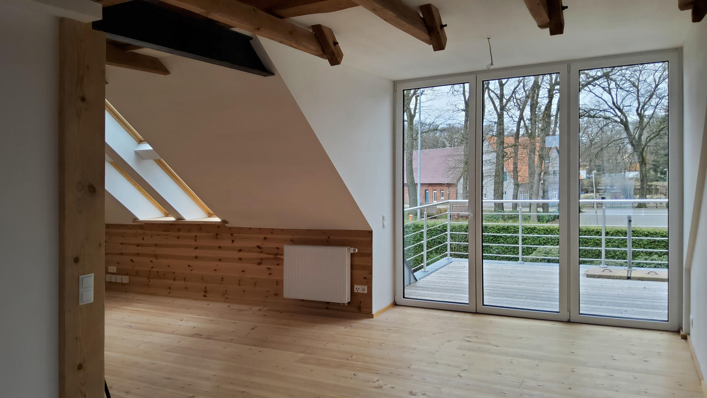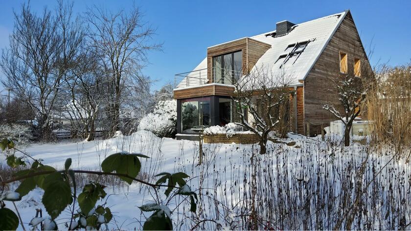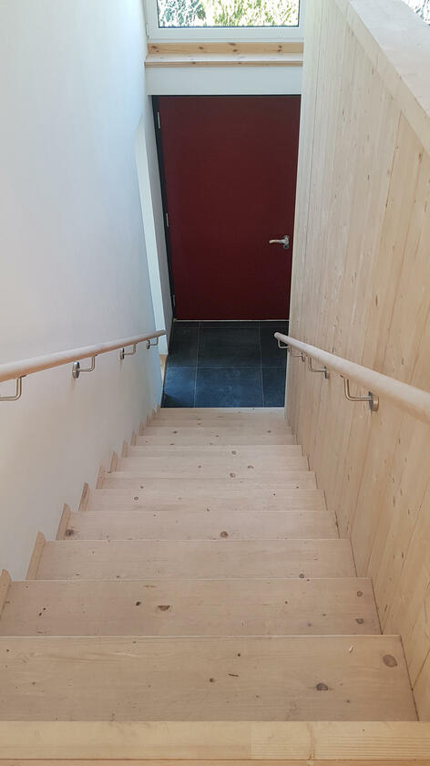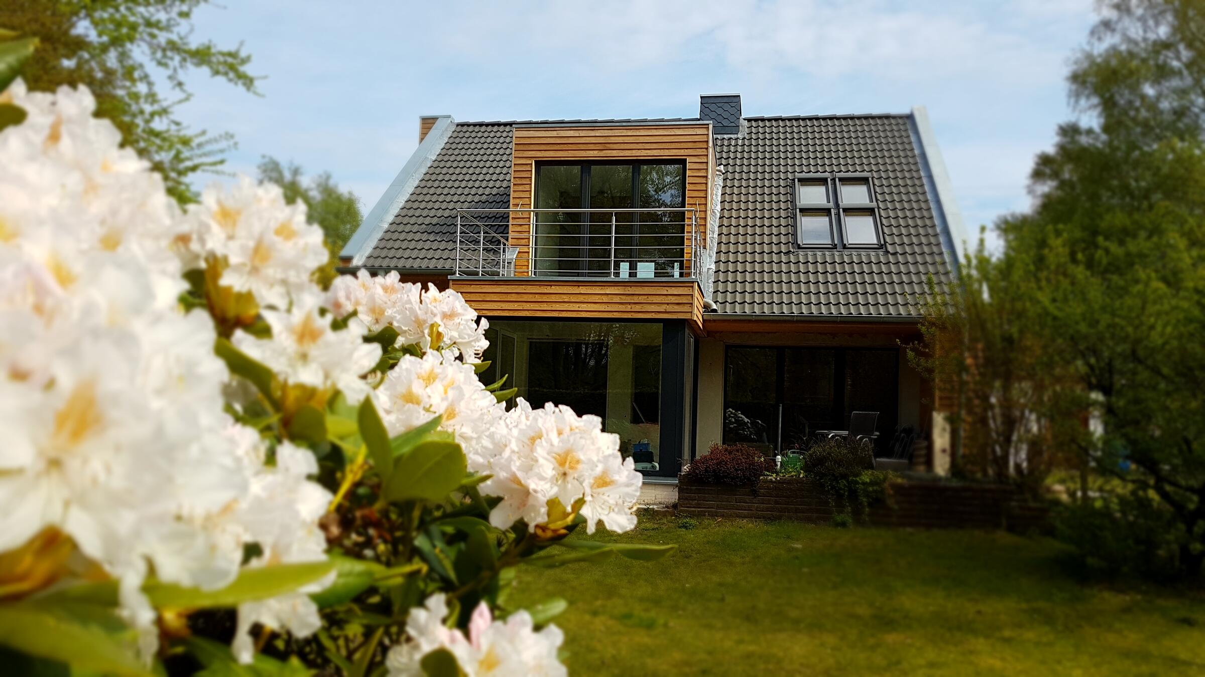 Das Haus wurde 1966 erbaut und 2019-2020 zeitgemäß saniert. Um das anspruchsvolle flexible Raumprogramm zu realisieren, setzte die Architektin auf modulare Einschübe in Holzbauweise. Der Einschub auf der Südseite bietet einen Wintergarten für die Wohnung im Erdgeschoss, dessen Decke die großzügige Dachterrasse der Gaube im ersten Obergeschoss bildet. Auf der Nordseite markiert ein weiterer Holzquader den neuen markanten Eingangsbereich mit den Außentüren der beiden Wohnungen. Bevor man die geradläufige massive Holztreppe ins Obergeschoss betritt, passiert man eine optionale Verbindung zur Wohnung im Erdgeschoss. Das Treppenhaus besticht durch eine Raumhöhe von fünf Metern und bietet den Blick hinaus in den angrenzenden Eichenwald. Der von Holzwänden flankierte zentrale Wohn-, Koch- und Essbereich im Obergeschoss bietet dank großzügiger Fensterflächen Ausblicke in alle Himmelsrichtungen und gibt den Blick auf offene Dachsparren frei. Ein Sitzfenster erinnert an den ehemaligen West-Balkon. Im Erdgeschoss wurden zugunsten von mehr Transparenz und einer offenen Küche ebenfalls trennende Wände entfernt. Durch den gewachsenen Garten mit vielen alten Sträuchern und Büschen entsteht so in jeder der Wohnungen eine spannende Korrelation von innen und außen, geprägt durch die neuen Sichtachsen der eingeschobenen Module. Momentan wird die untere Wohnung von den Besitzern selbst genutzt und ist leicht möbliert. Die obere Wohnung steht leer und wird nur gelegentlich von Gästen genutzt.