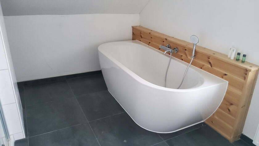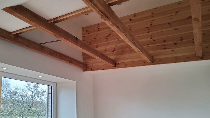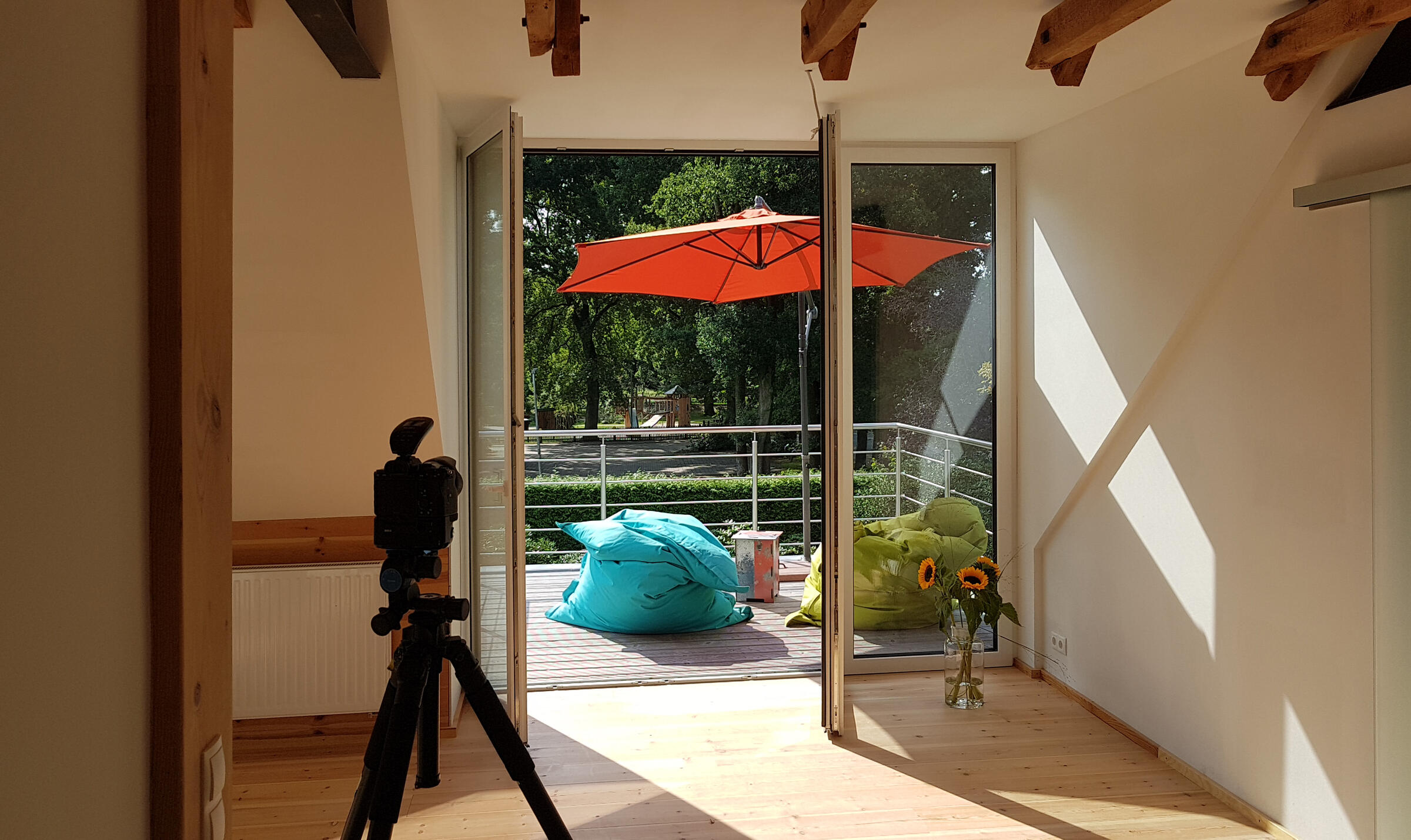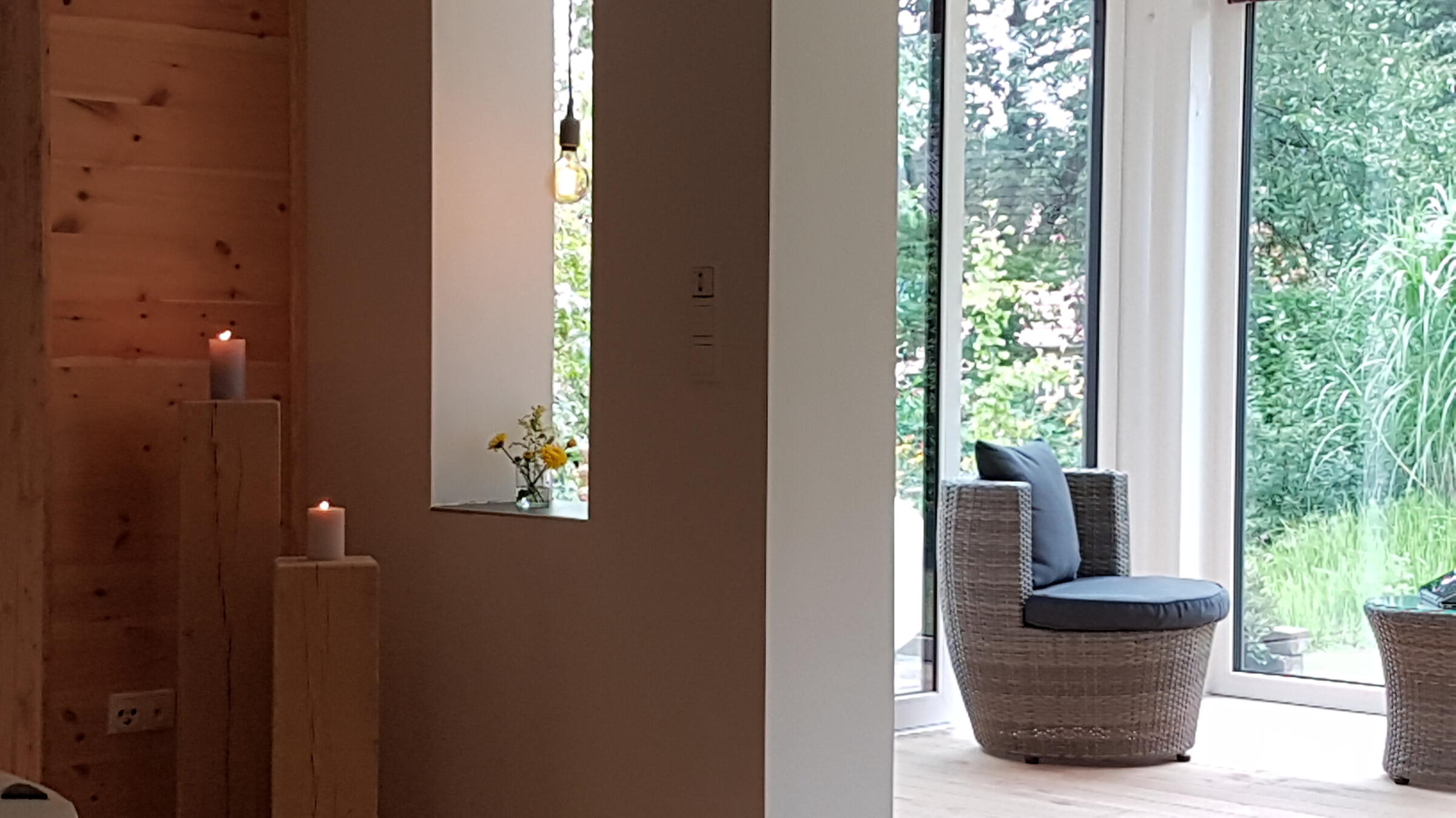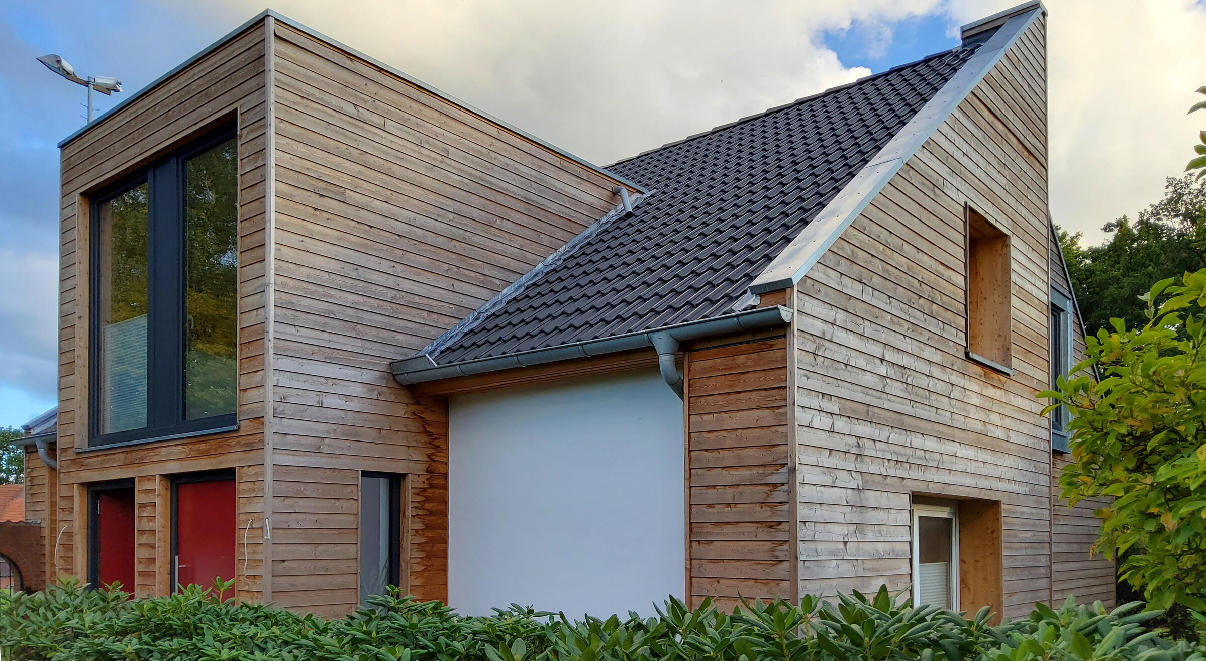 Das Haus wurde 1966 erbaut und 2019-2020 zeitgemäß saniert. Um das anspruchsvolle flexible Raumprogramm zu realisieren, setzte die Architektin auf modulare Einschübe in Holzbauweise. Der Einschub auf der Südseite bietet einen Wintergarten für die Wohnung im Erdgeschoss, dessen Decke die großzügige Dachterrasse der Gaube im ersten Obergeschoss bildet. Auf der Nordseite markiert ein weiterer Holzquader den neuen markanten Eingangsbereich mit den Außentüren der beiden Wohnungen. Bevor man die geradläufige massive Holztreppe ins Obergeschoss betritt, passiert man eine optionale Verbindung zur Wohnung im Erdgeschoss. Das Treppenhaus besticht durch eine Raumhöhe von fünf Metern und bietet den Blick hinaus in den angrenzenden Eichenwald. Der von Holzwänden flankierte zentrale Wohn-, Koch- und Essbereich im Obergeschoss bietet dank großzügiger Fensterflächen Ausblicke in alle Himmelsrichtungen und gibt den Blick auf offene Dachsparren frei. Ein Sitzfenster erinnert an den ehemaligen West-Balkon. Im Erdgeschoss wurden zugunsten von mehr Transparenz und einer offenen Küche ebenfalls trennende Wände entfernt. Durch den gewachsenen Garten mit vielen alten Sträuchern und Büschen entsteht so in jeder der Wohnungen eine spannende Korrelation von innen und außen, geprägt durch die neuen Sichtachsen der eingeschobenen Module. Momentan wird die untere Wohnung von den Besitzern selbst genutzt und ist leicht möbliert. Die obere Wohnung steht leer und wird nur gelegentlich von Gästen genutzt.