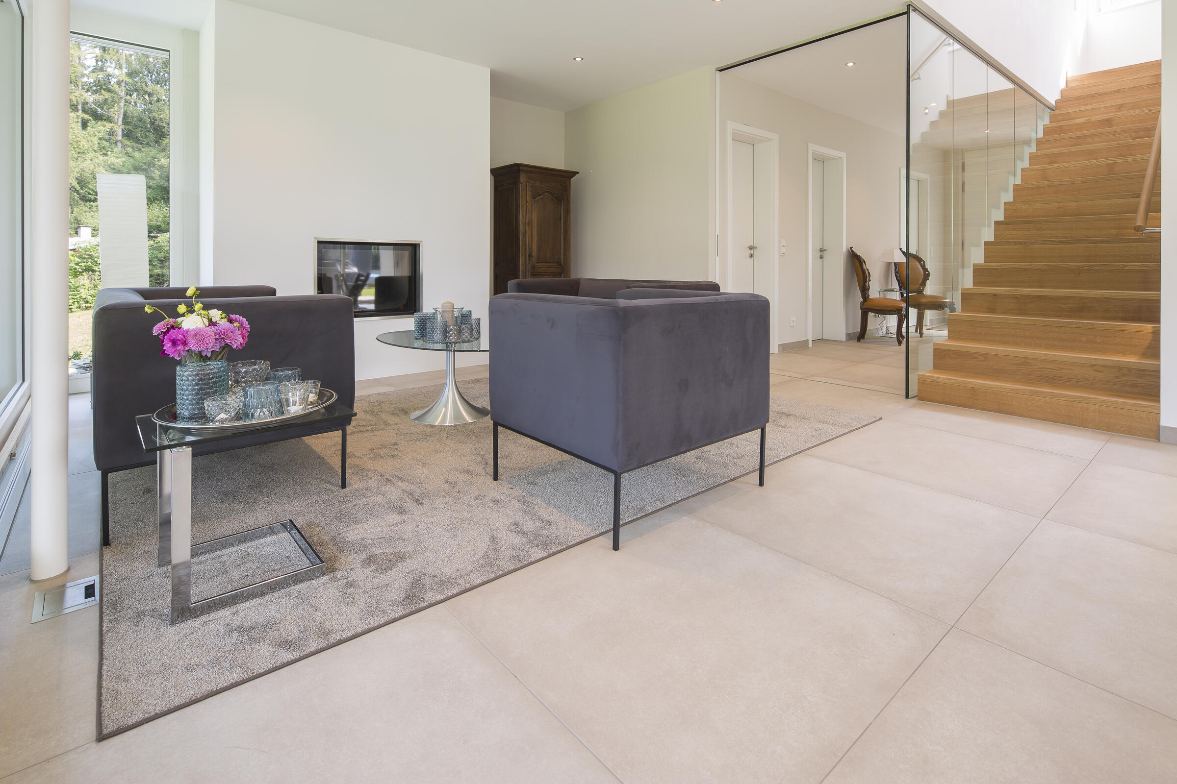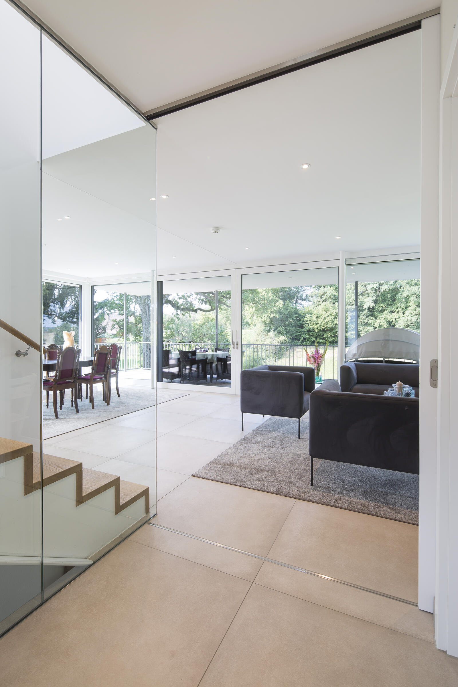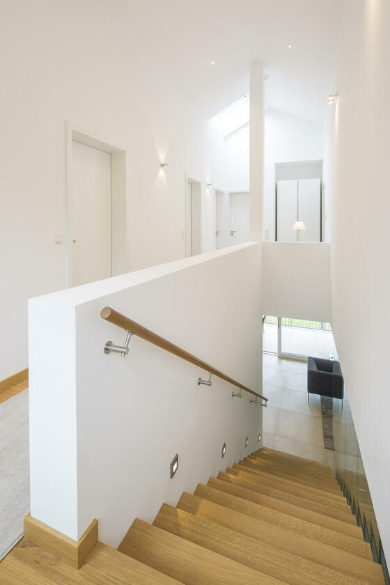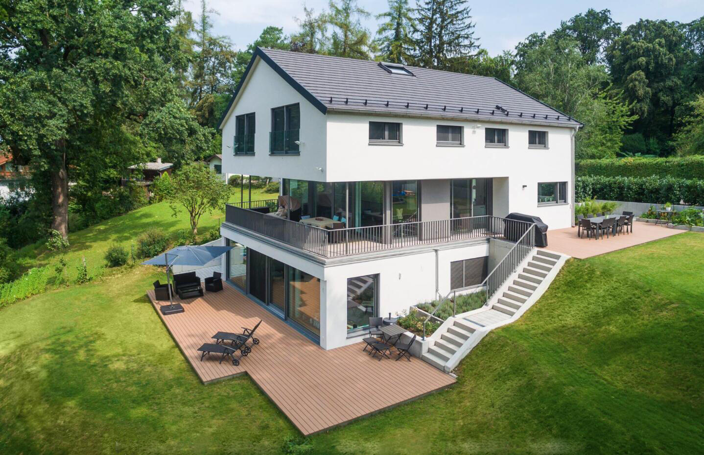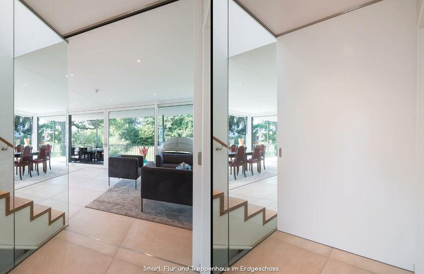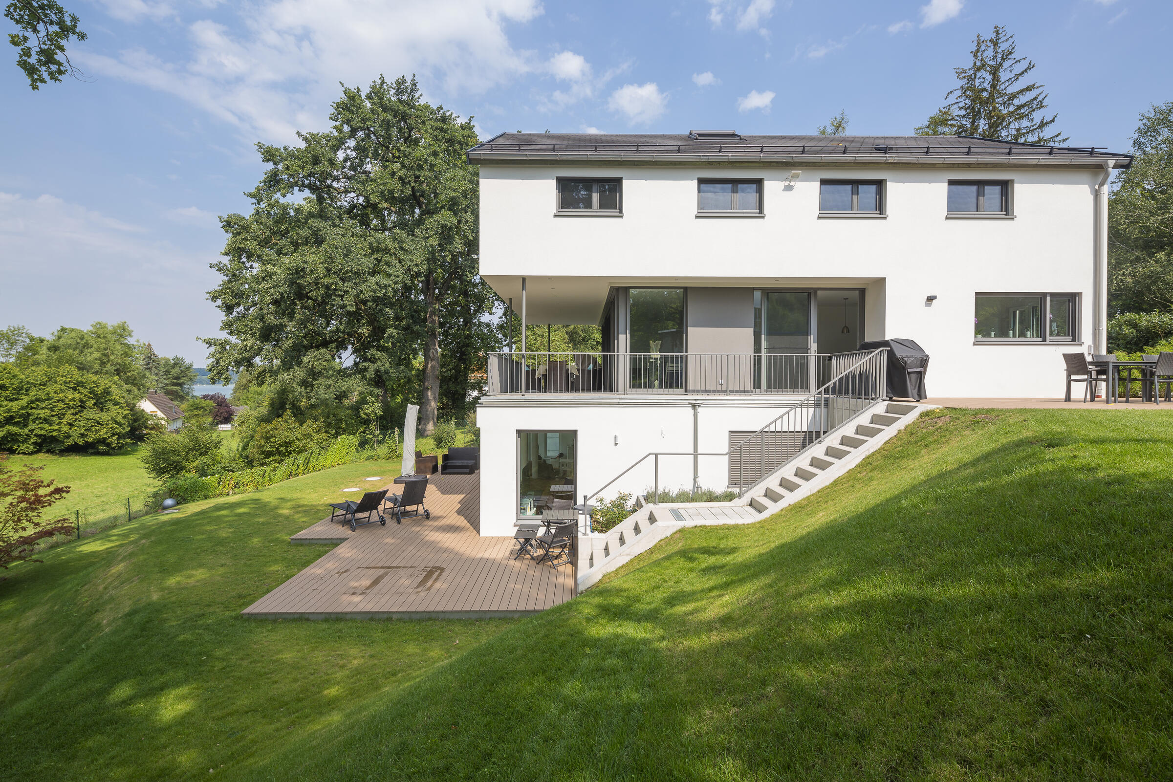 Die Architektenvilla wurde über mehrere Ebenen (Terrassen) harmonisch in die umgebende Landschaft - Wiesen, Garten, alter Baumbestand - eingebettet. Der Baukörper ist konsequent, mit seinen bodentiefen Glasfronten, nach Osten, Süden und Westen ausgerichtet. Ein lichtes, offenes, freundliches Wohnambiente. Sonne vom morgendlichen Sonnenaufgang bis zu (immer wieder) spektakulären Sonnenuntergängen am Abend.