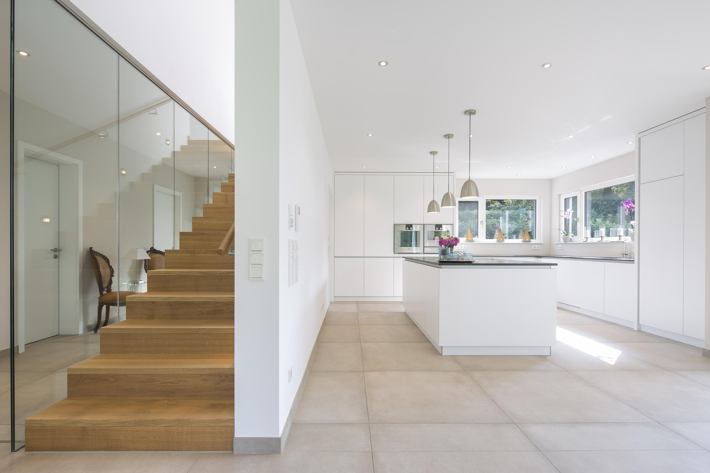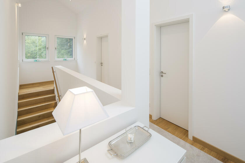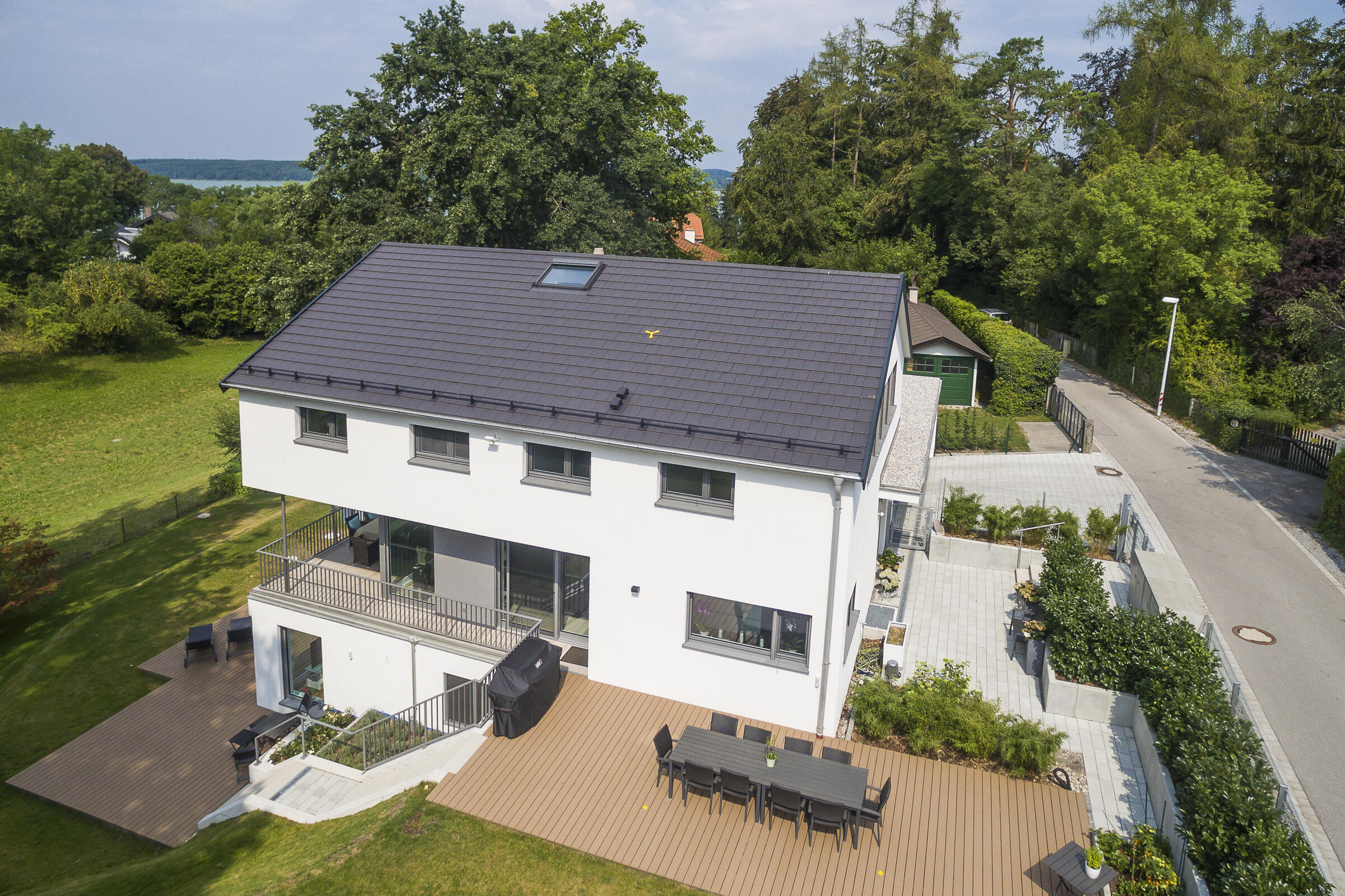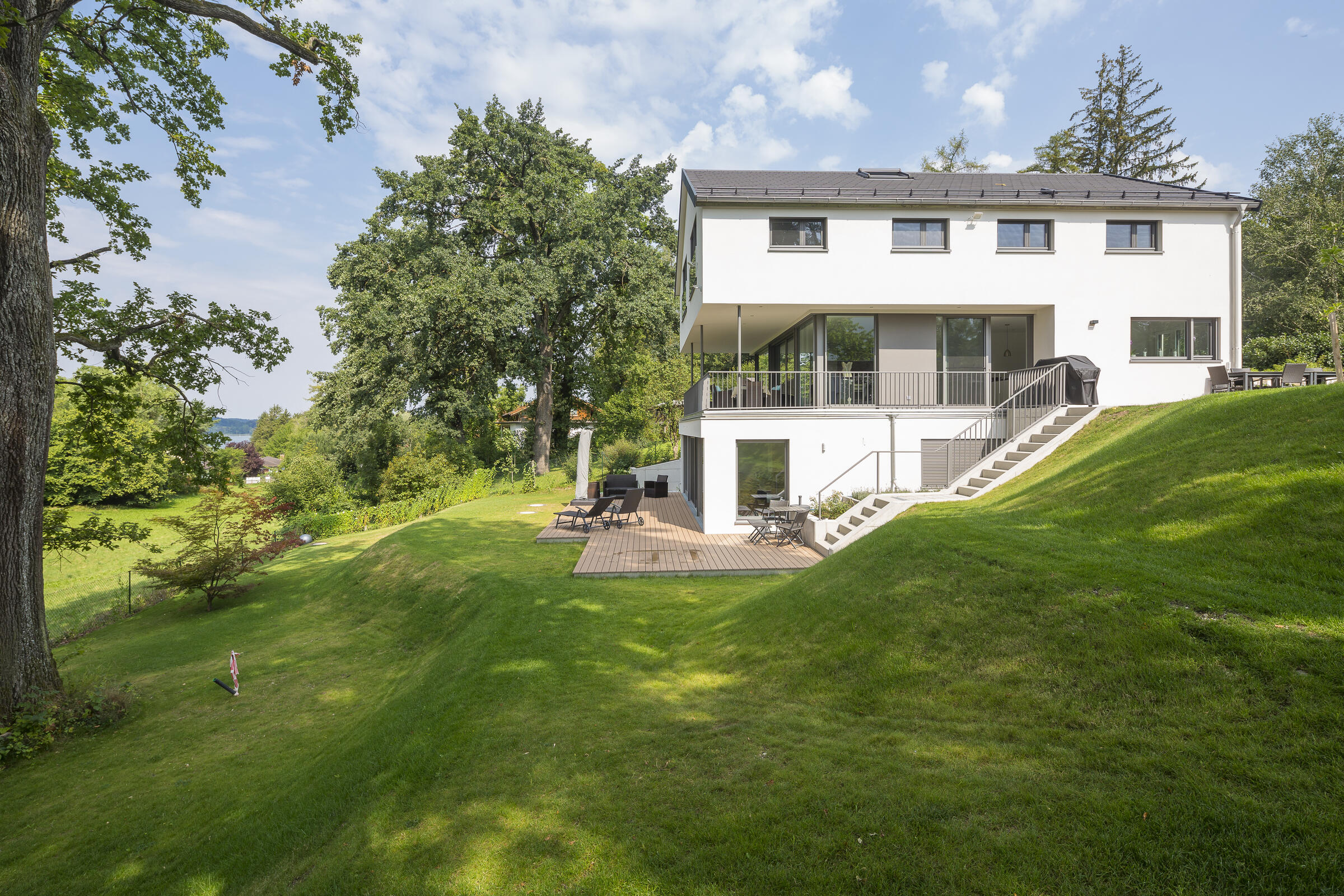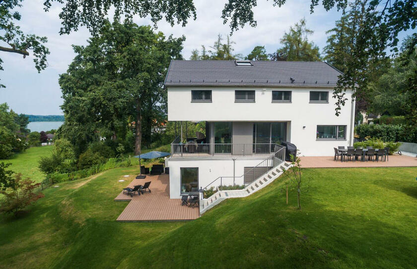 Auf einer leichten Anhöhe liegt - nach Westen mit unverbaubarem Blick auf den Ammersee - die moderne Neubauvilla. Das gesamte Gebäude besticht durch stilsicheres Interior Design, hochwertige Handwerksarbeiten und eleganten Wohnkomfort: Helle Eichenholz-Massivböden, italienische Fliesen, verglastes Treppenhaus mit handgehobelten (rutschfesten) Eichenholz-Stufen, offene Profiküche mit Kochinsel und Top-Marken-Geräten, zwei offene Kamine (EG und UG) und weitläufige (teilweise) überdachte Terrassen auf mehreren Ebenen. Alle Bäder sind bis ins kleinste Detail luxuriös und geschmackvoll ausgestattet: Rainshower-Duschen, hochwertige Fliesen, Armaturen, Waschbecken, Handbrausen und Handtuchwärmer. Das Elternbad (DG) hat eine in den Raum integrierte maßangefertigte Sauna.
