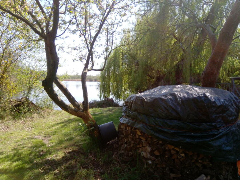 Eine weitere Besonderheit ist das auf dem See befindliche und bewohnbare Holzpfahlhaus, was über eine kleine Holzbrücke vom Grundstück aus betreten werden kann. Es ist reetgedeckt und verfügt über ein Obergeschoss in Stehhöhe und eine wunderbare Holzveranda, die am Nachmittag/ Abend einen sagenhaften Blick auf den Sonnenuntergang bietet. Strom ist vorhanden.An der eigenen Badestelle, die aus einem kleinen Sandstrand mit Holzsteg und Badeleiter besteht, grenzt die große Liegewiese und der mit Feldsteinen versehene runde Grill- und Feuerplatz an, der Platz für über 10 Personen bietet. Bei schlechterem oder zu heißem Wetter bietet sich ein Verweilen unter dem daneben befindlichen, reetgedeckten Holzpavillon an. Dieser ist mit einer langen Echtholztafel und Bänken ausgestattet, so dass dort 15-20 Personen Platz finden und auch essen könnten. Hier wurden an allen Seiten herunterrollbare Planen mit Sichtfenstern angebracht, die bei Bedarf vor Regen und Kälte schützen. Auch hier ist Strom vorhanden.