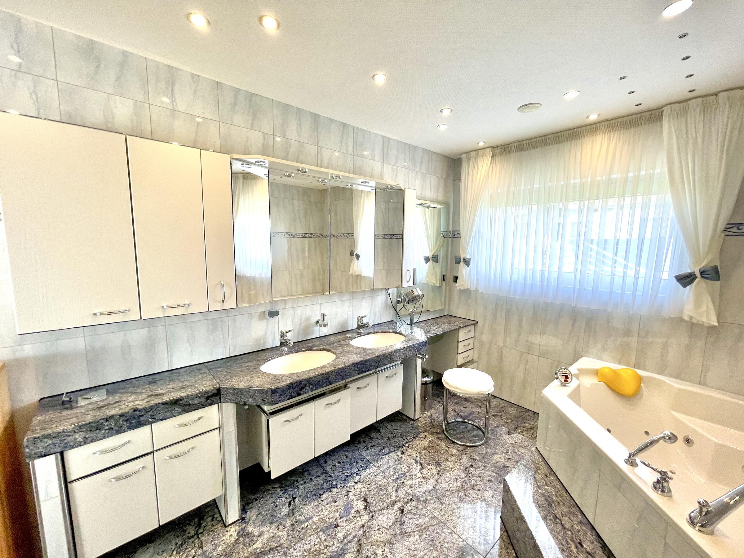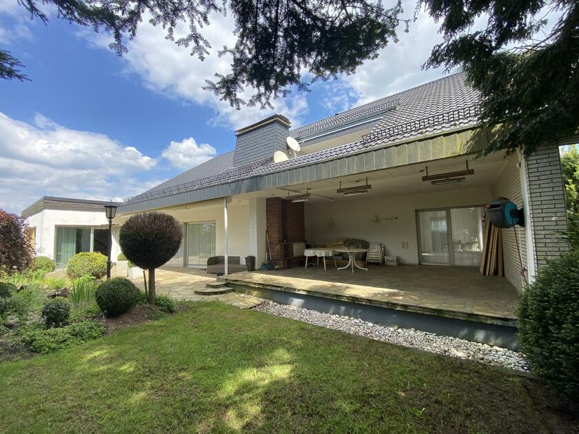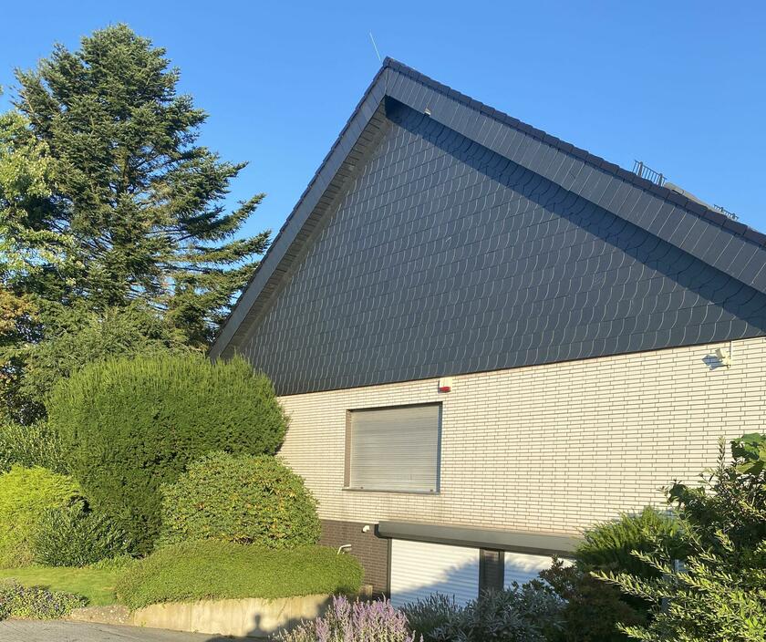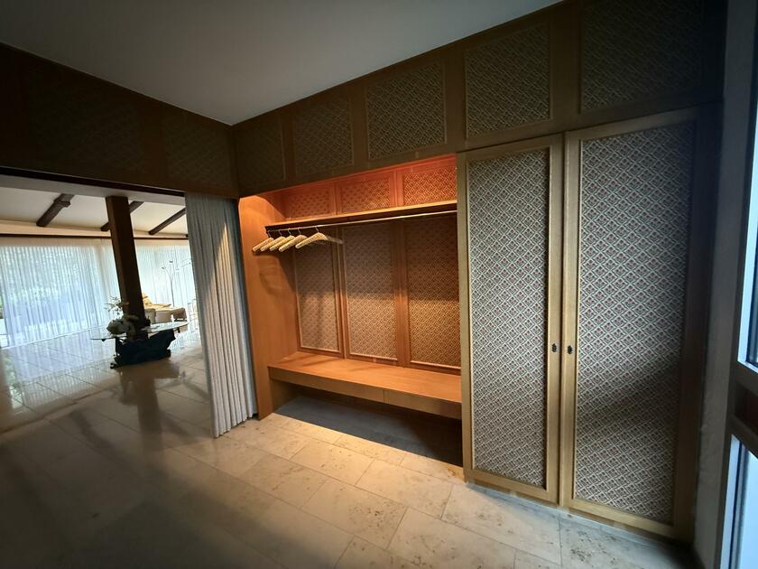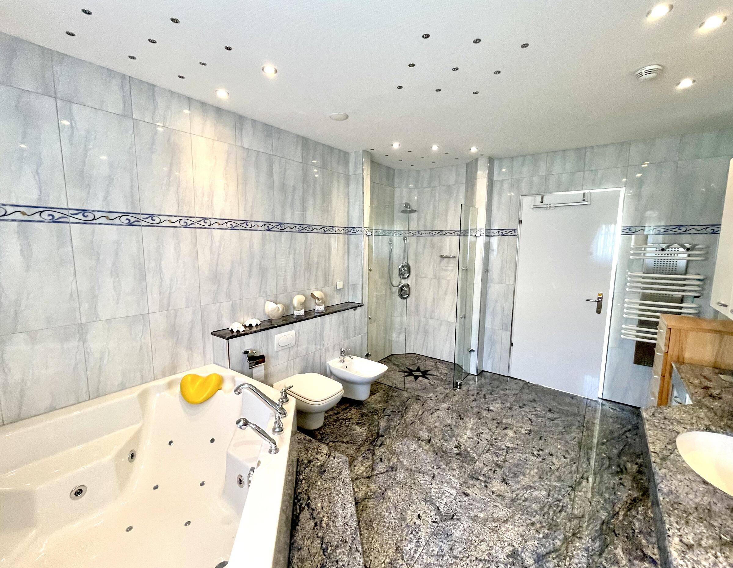 Die freistehende Villa bietet neben seinen großzügigen und hellen Wohnräumen auch einen Wellnessbereich mit großem Indoor-Pool, Sauna und Dampfbad. Das Wohnzimmer und die Terrasse sind nach Südosten ausgerichtet. Durch eine breite Holzschiebetür gelangt man vom Wohnbereich in das Schlafzimmer mit Doppel-Wasserbett und weißem Hochflor-Teppich. Hier befinden sich ebenfalls ein luxuriöses Badezimmer mit hochwertigem Marmor und ein Ankleidezimmer. Das Schlafzimmer hat direkten Zugang zur Terrasse. Die Räume dürfen nach Absprache umgestaltet werden. Alle Fenster des Hauses können mit Rollläden verdunkelt werden. Der Indoor-Pool ist nicht beheizt. Im Außenbereich stehen der große Garten, die Terrasse mit Außenkamin sowie Pkw-Parkplätze zur Verfügung. Weitere kostenfreie Stellflächen, auch für Lkw, befinden sich auf der am Grundstück vorbeiführenden und wenig befahrenen Straße.