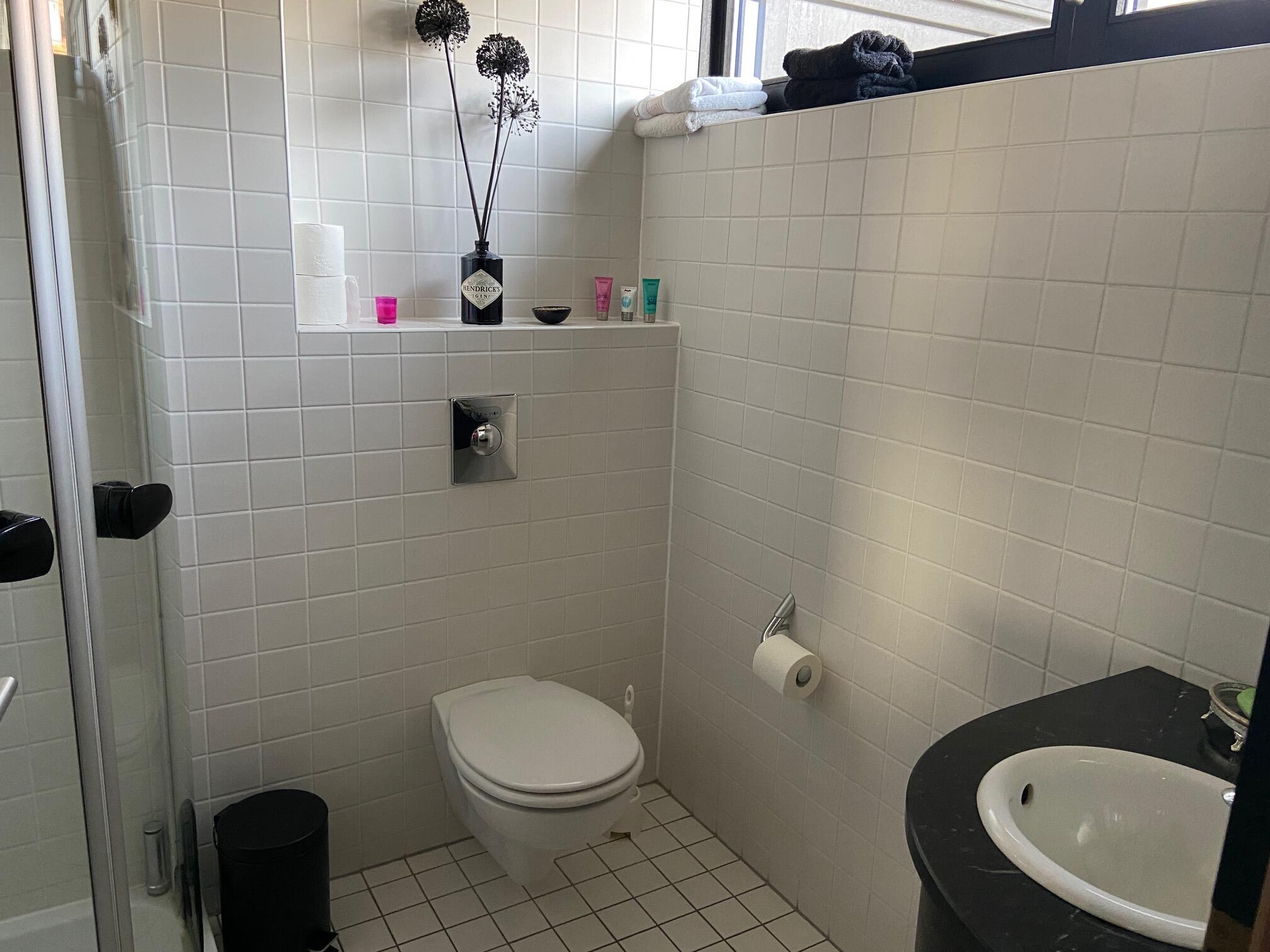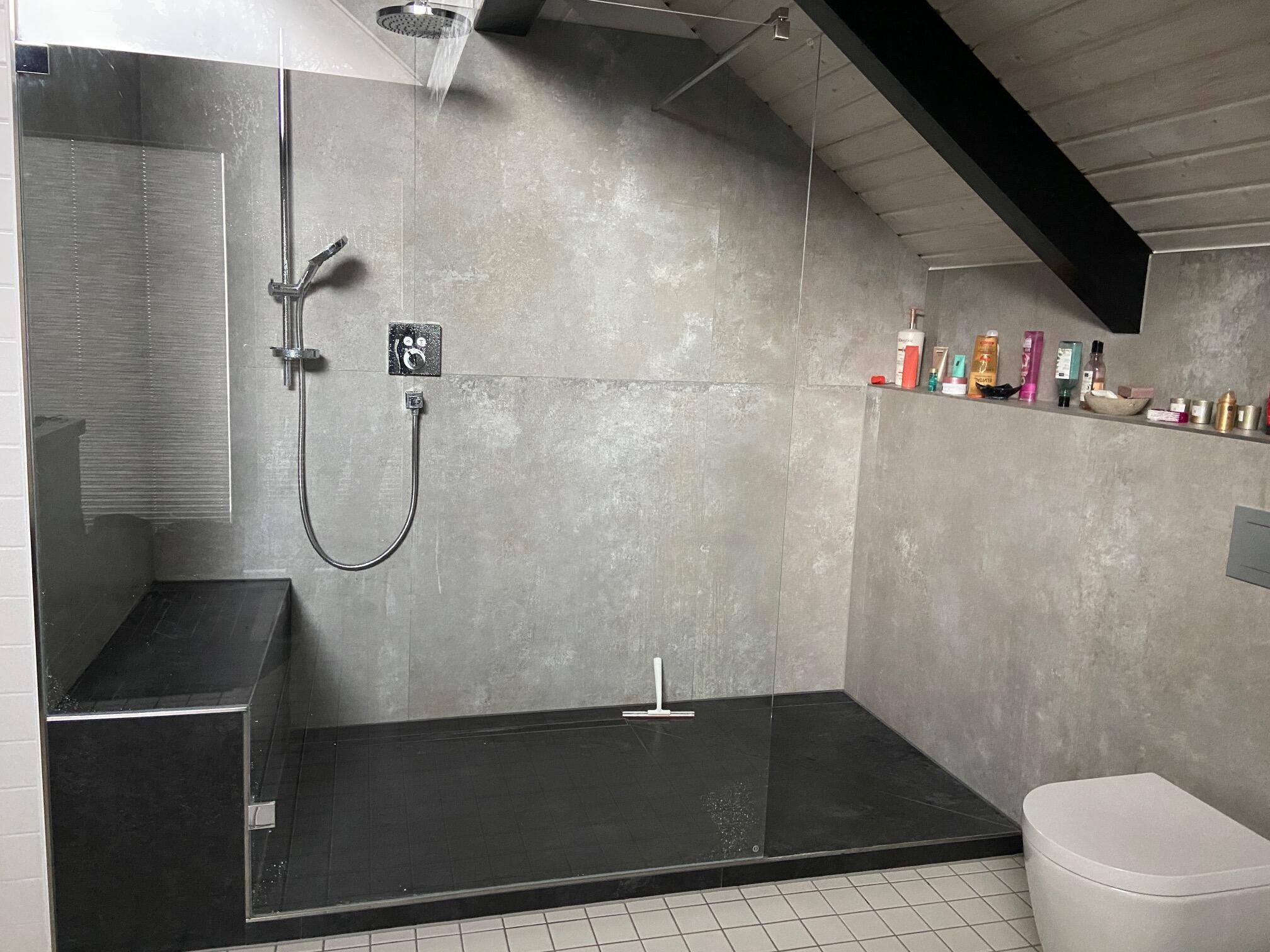 - Inkl. begehbare Dusche mit Regenduschkopf. Wandfliesen hellgrau, Bodenfliesen Anthrazit