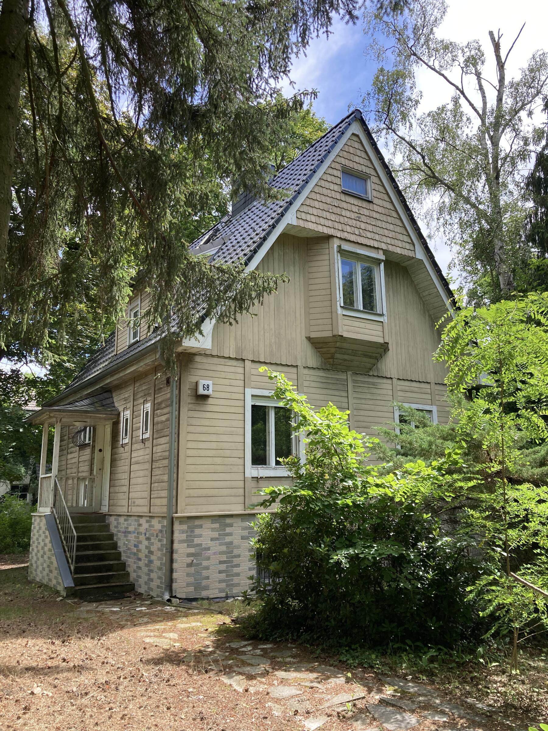 Das leerstehende Holzhaus wurde in den 1920er Jahren erbaut und befindet sich in einem ruhigen Wohngebiet. Das Wohn- und Esszimmer im Erdgeschoss bietet einen kleinen Ofen und hat sichtbare Deckenbalken. Auf den Böden sind Holzdielen verlegt. Die Räume werden durch große Schiebetüren voneinander abgetrennt. Die Altbaufenster sind mit Hilfe von Jalousien abdunkelbar. Eine Einbauküche ist ebenfalls vorhanden. Im Obergeschoss befinden sich 2 Schlafzimmer und ein Balkon. Der ausgebaute Keller hat einen separaten Eingang und bietet Räume für Maske, Garderobe und Team. Parkplätze sind auf dem Grundstück vorhanden.