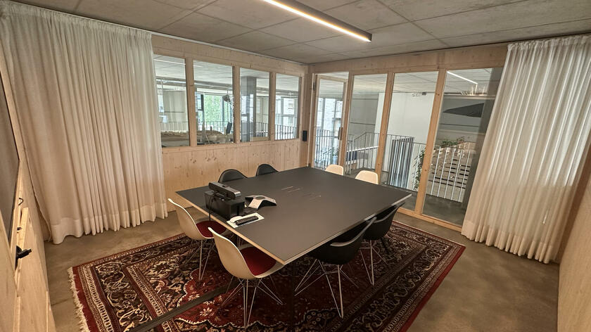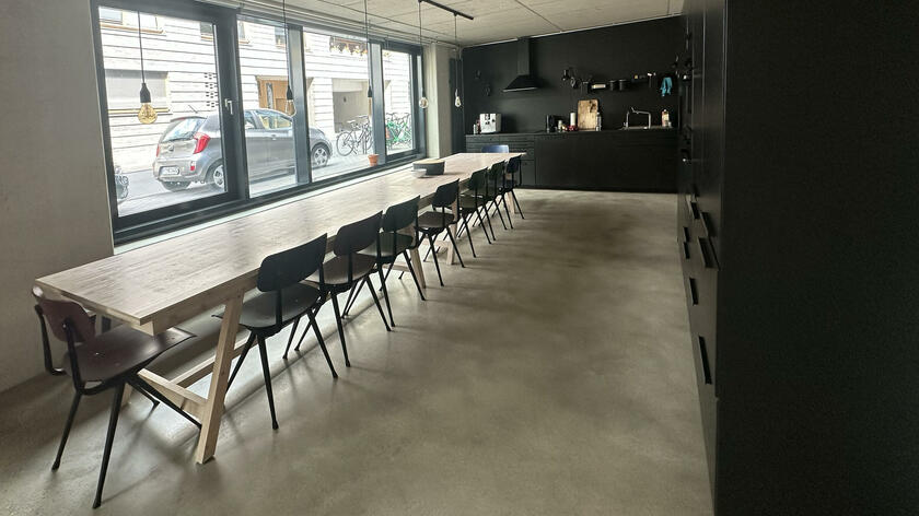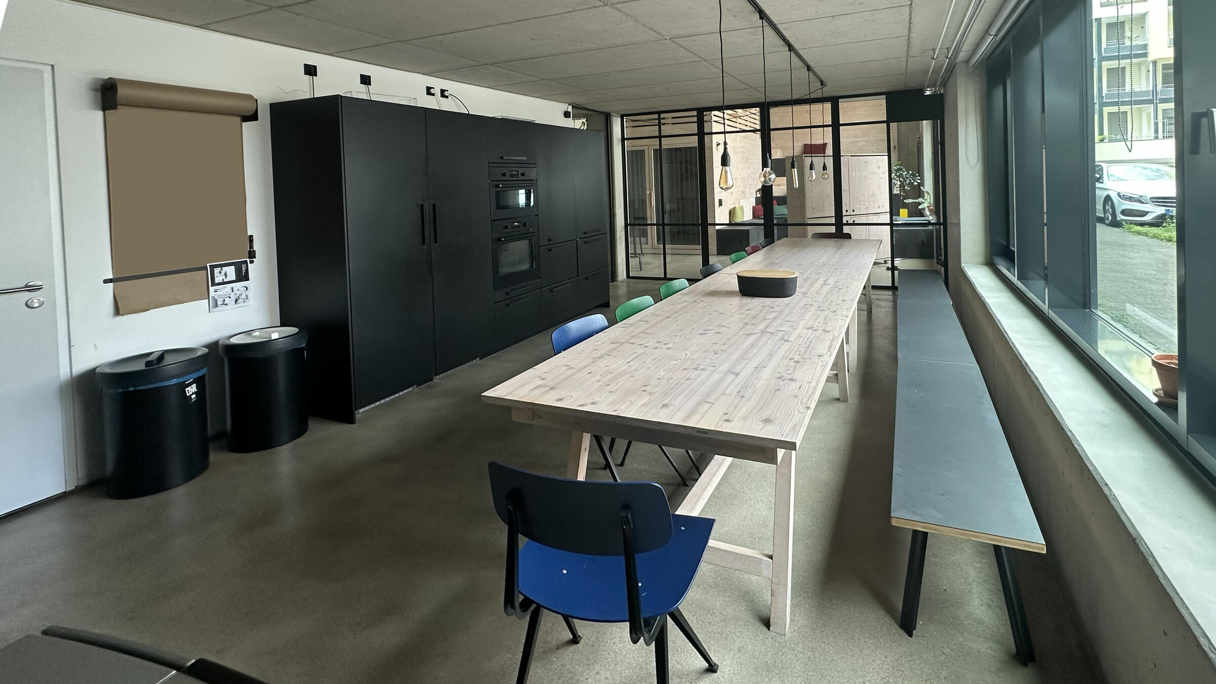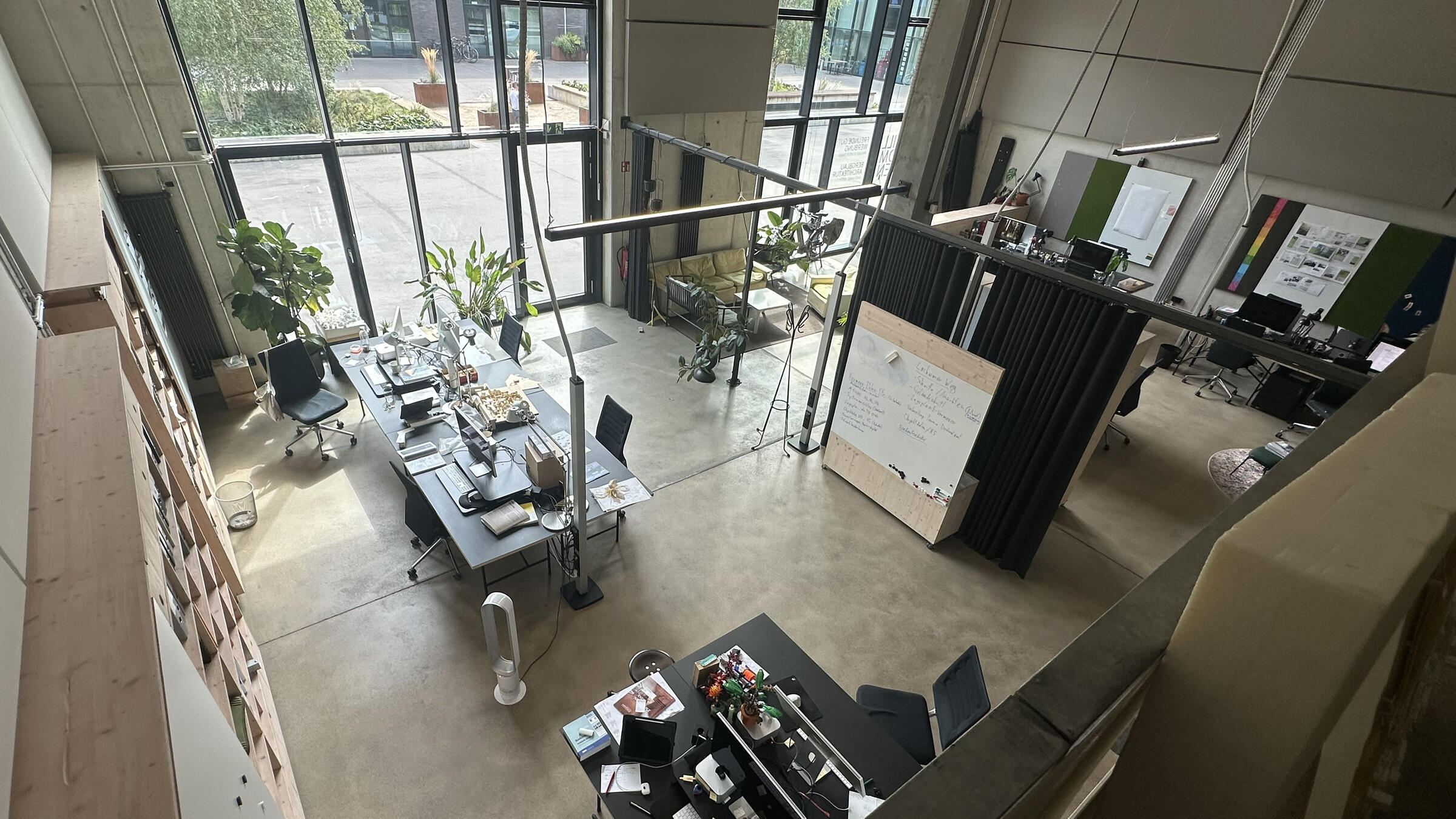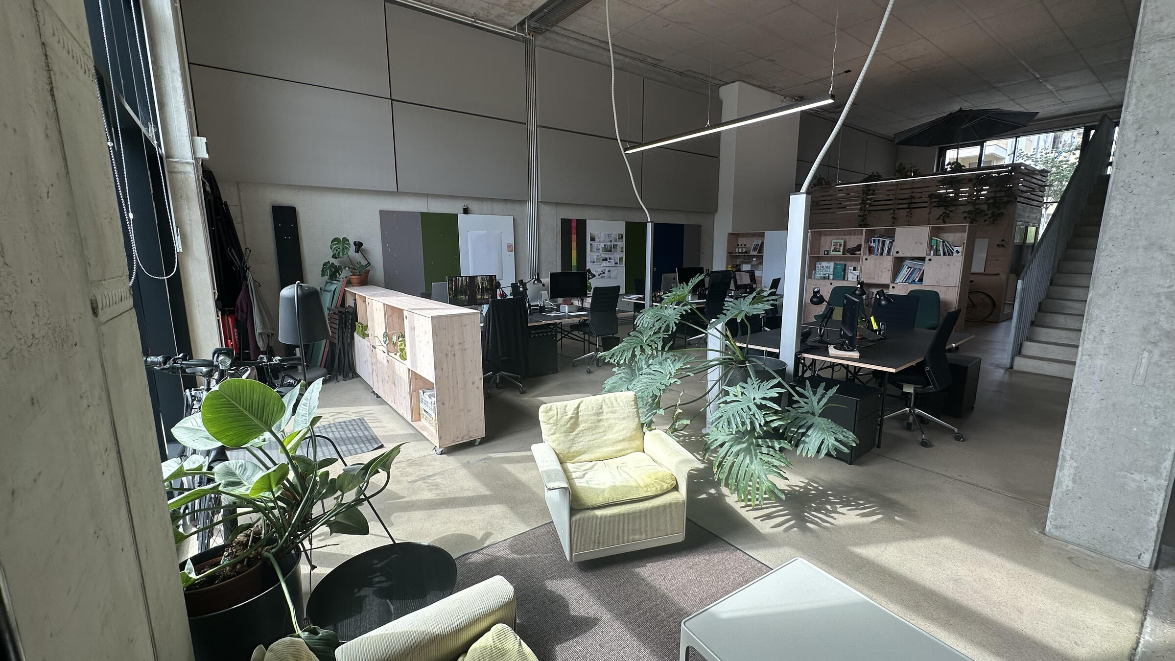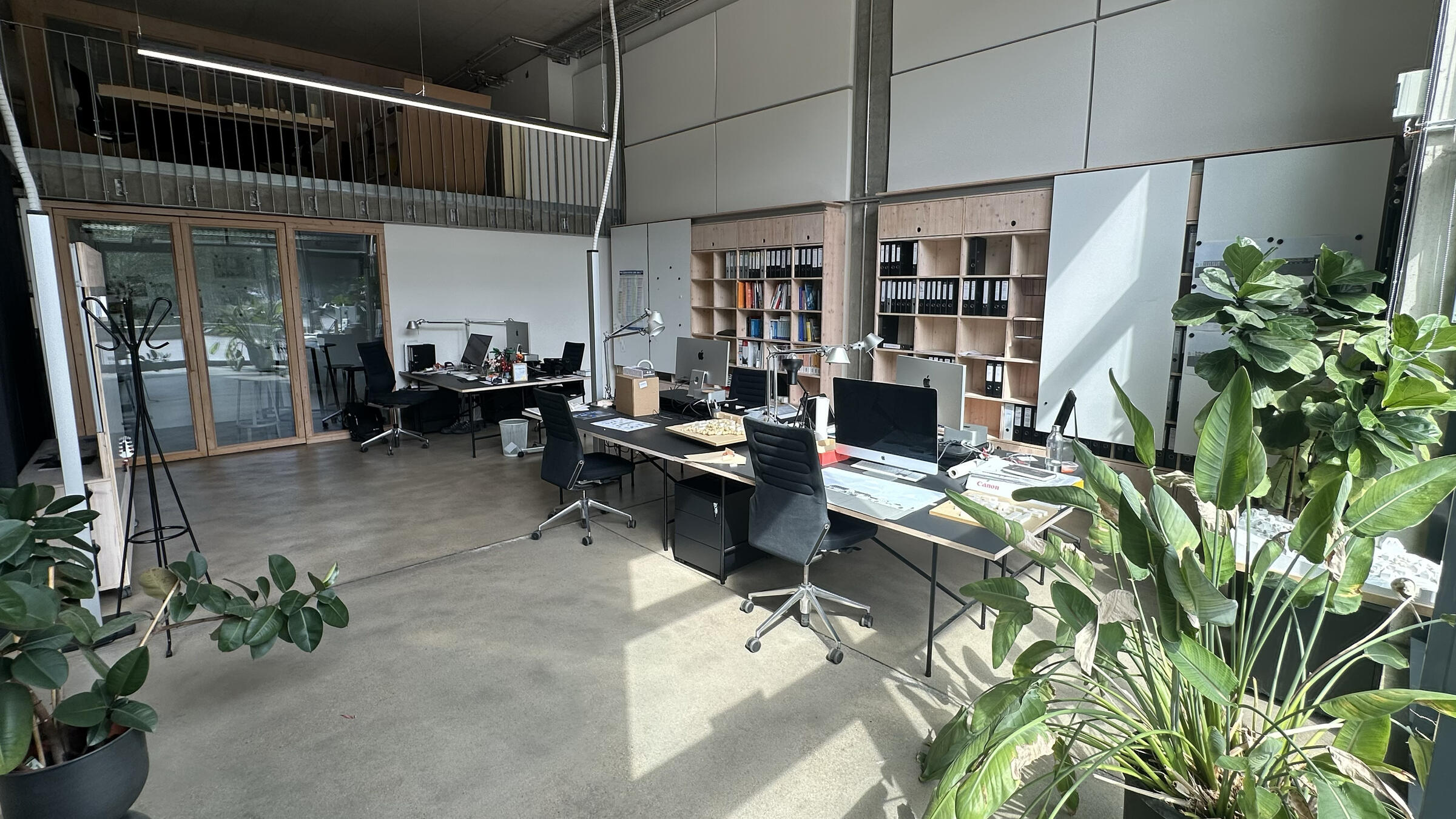 Dieses moderne Loft-Büro besticht durch seinen stilvollen Industrial-Look mit Sichtbeton, Holz und Metall. Die offene, großzügige Fläche bietet bis zu 5,5 Meter hohe Decken und raumhohe Fenster. Die Fenster können teilweise mit Jalousien abgedunkelt werden. Das Büro ist vollständig möbliert und mit flexiblen Regalelementen ausgestattet. Eine fest eingebaute Regalwand setzt einen markanten Akzent und bleibt als Bestandteil des Raums erhalten. Die Möblierung kann von Produktionen genutzt oder entfernt werden. Die Sichtbetonwände dürfen nicht verändert werden. Eine ca. 100 m² große Empore beherbergt einen Büroraum und einen Konferenzraum. Im unteren Bereich stehen zwei Rückzugsboxen für Telefon- oder Videokonferenzen zur Verfügung. Die voll ausgestattete Küche mit zwei Spülmaschinen und zwei Kühlschränken dient gleichzeitig als gemütlicher Aufenthaltsraum. Zwei separate Sanitärbereiche runden die Ausstattung ab. Das Büro wird über 2 separate und barrierefreie Zugänge im Erdgeschoss betreten.