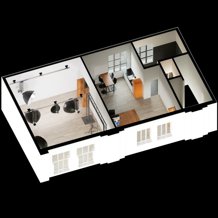 - Studiofläche (1. OG)Fläche: 48 m²Länge: 8 mBreite: 6 mHöhe: 3,5 mmöbliert: ja