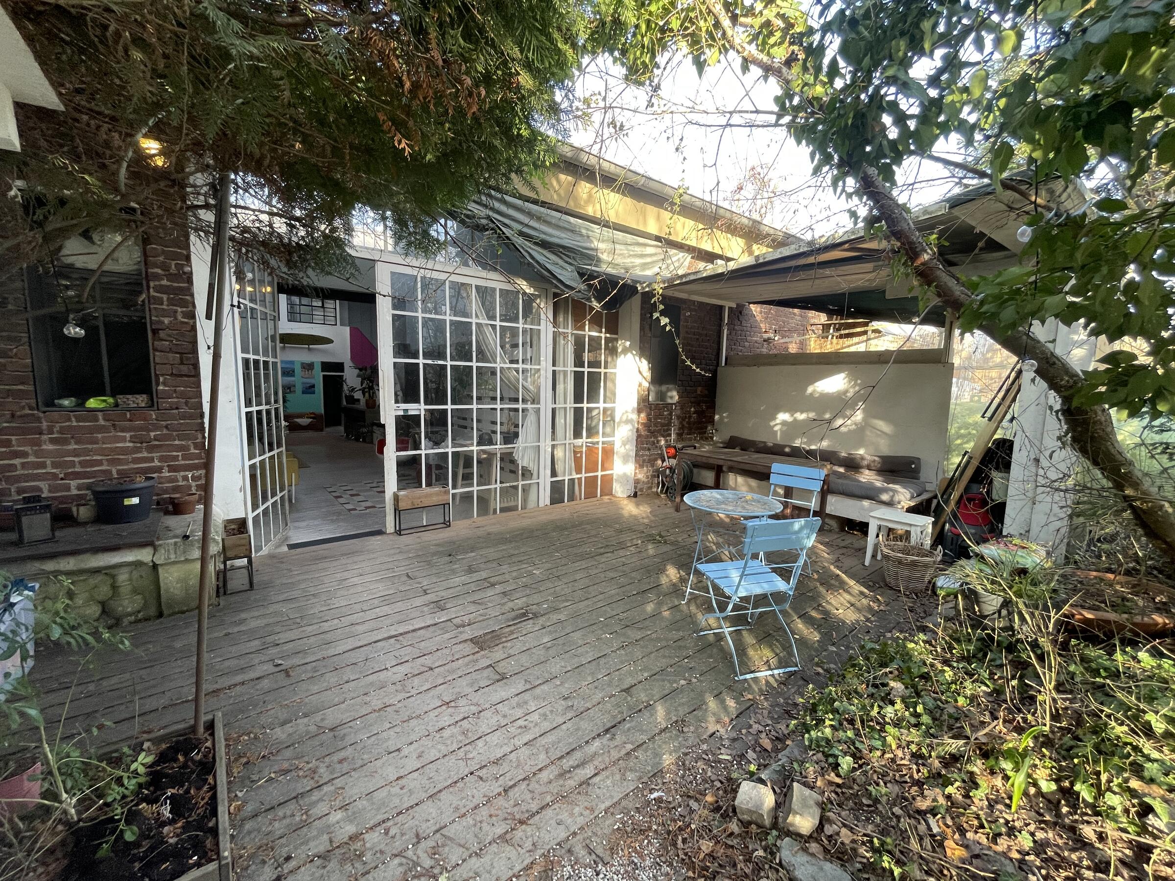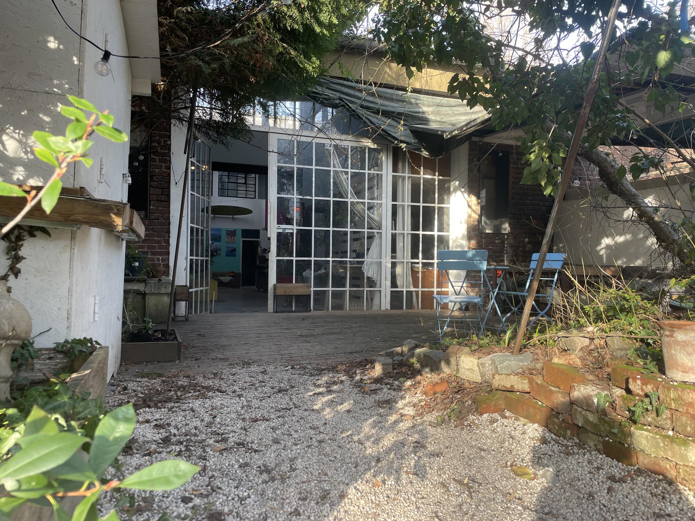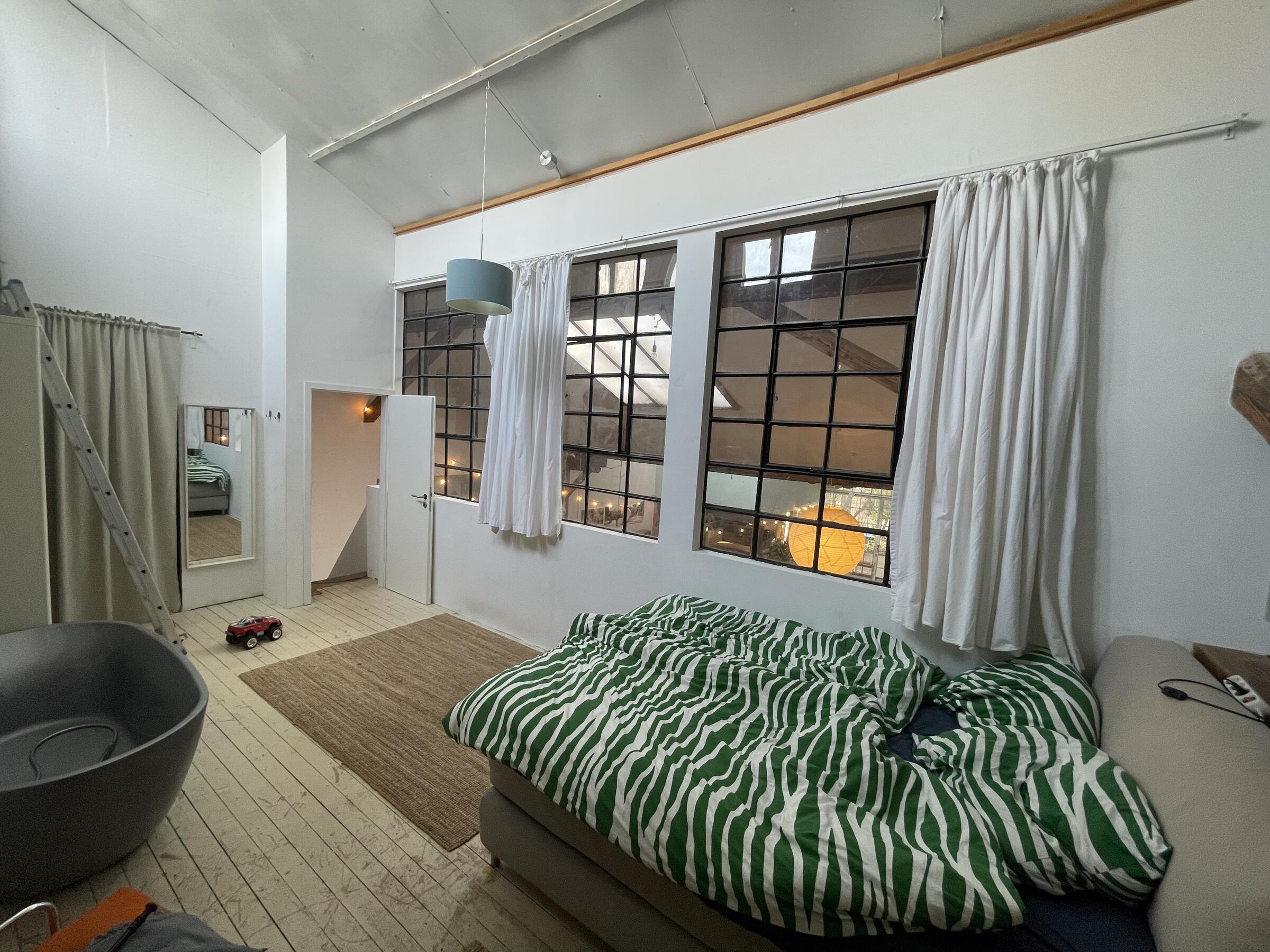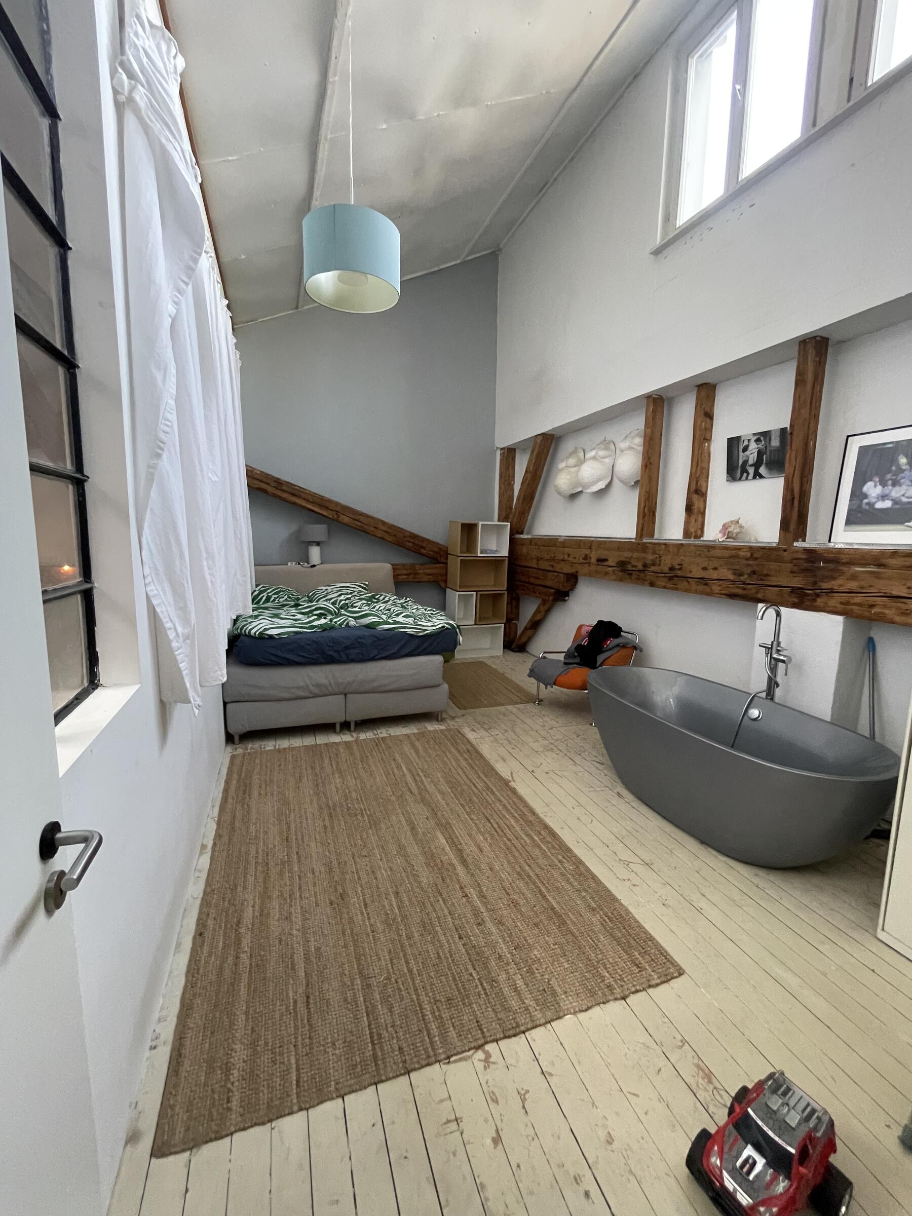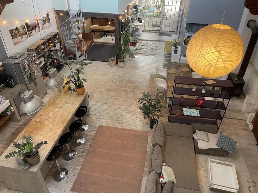 Das Loft befindet sich auf einem alten Fabrikgelände. Der hohe Atelierraum umfasst etwa 180 m² Grundfläche, die in offene Wohnbereiche geteilt wurde. Ein Küchen- und Essbereich sowie ein gemütlicher Wohnbereich mit Kamin befinden sich unter den Dachschrägen, die freigelegte Holzbalken stützen und verschönern. Das Licht fällt durch die Industriefenster auf den mit weißen Holzdielen ausgestatteten Raum. Drei weitere Räume gehören zum Loft wie auch zwei Emporen, die Blicke von oben auf das Loft bieten. 4 Pkw-Parkplätze befinden sich direkt vor dem Loft. Weitere Parkplätze gibt es im näheren Umfeld.