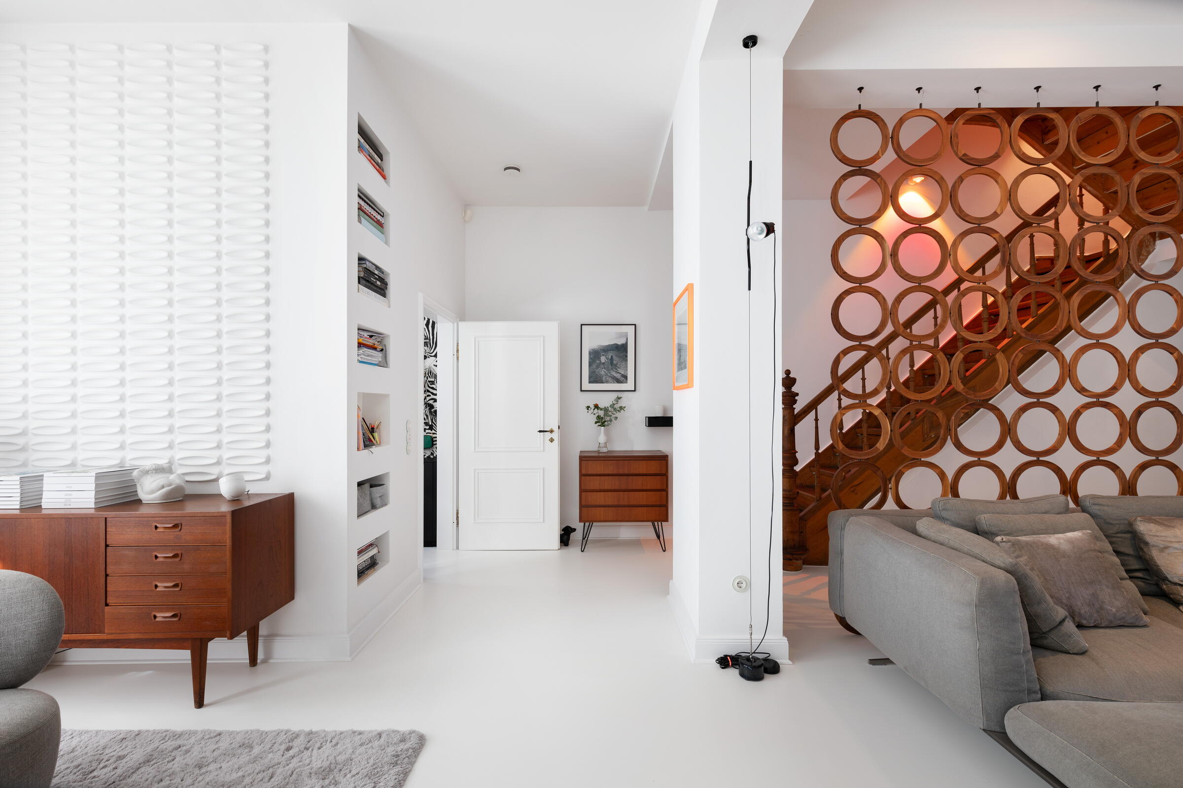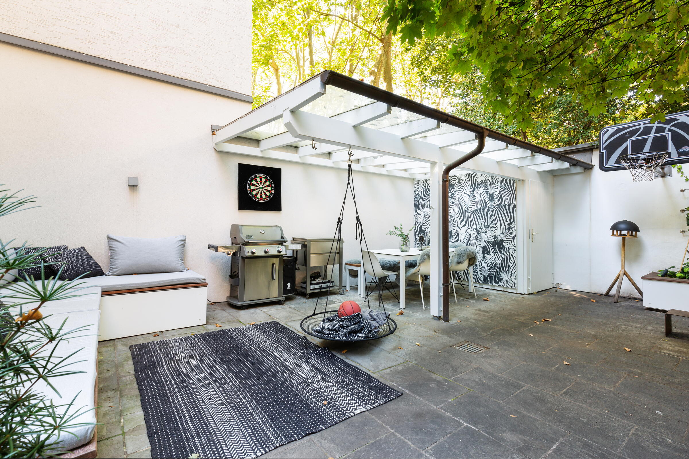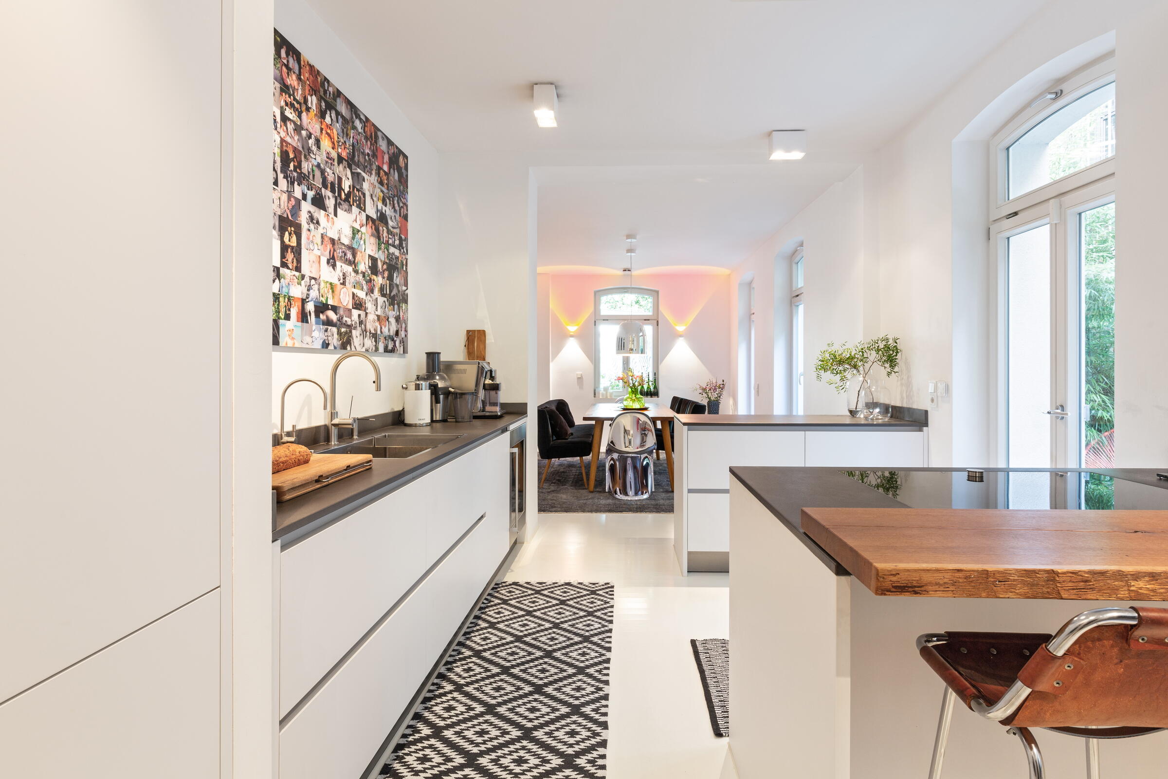 Unser außergewöhnliches und denkmalgeschütztes Stadthaus bietet eine Fläche von 240 m² und befindet sich in Köln-Nippes. Die hochwertig und designorientiert eingerichteten Räume des Hauses verteilen sich auf 2 Stockwerke. Die Böden der Räume bestehen aus fugenlosem weißen PU Boden oder Parkett. Die Fenster können mit Vorhängen und Jalousien abgedunkelt werden. Im Haus verteilt finden sich auch besondere Highlights wie beispielsweise ausgefallene Tapeten, eine Backsteinwand, eine alte Holztreppe und die denkmalgeschützte Eingangstür. Im Außenbereich gibt es einen sehr schönen und grün angelegten Innenhof.