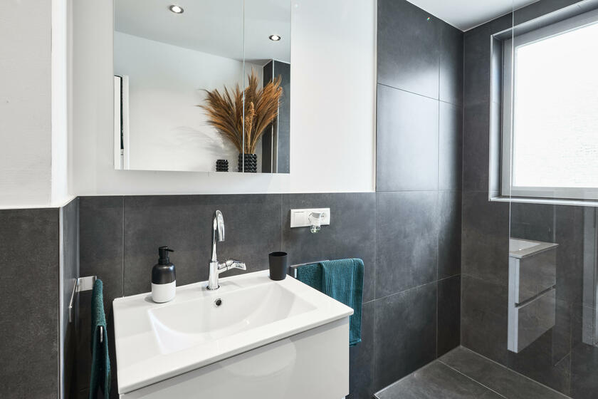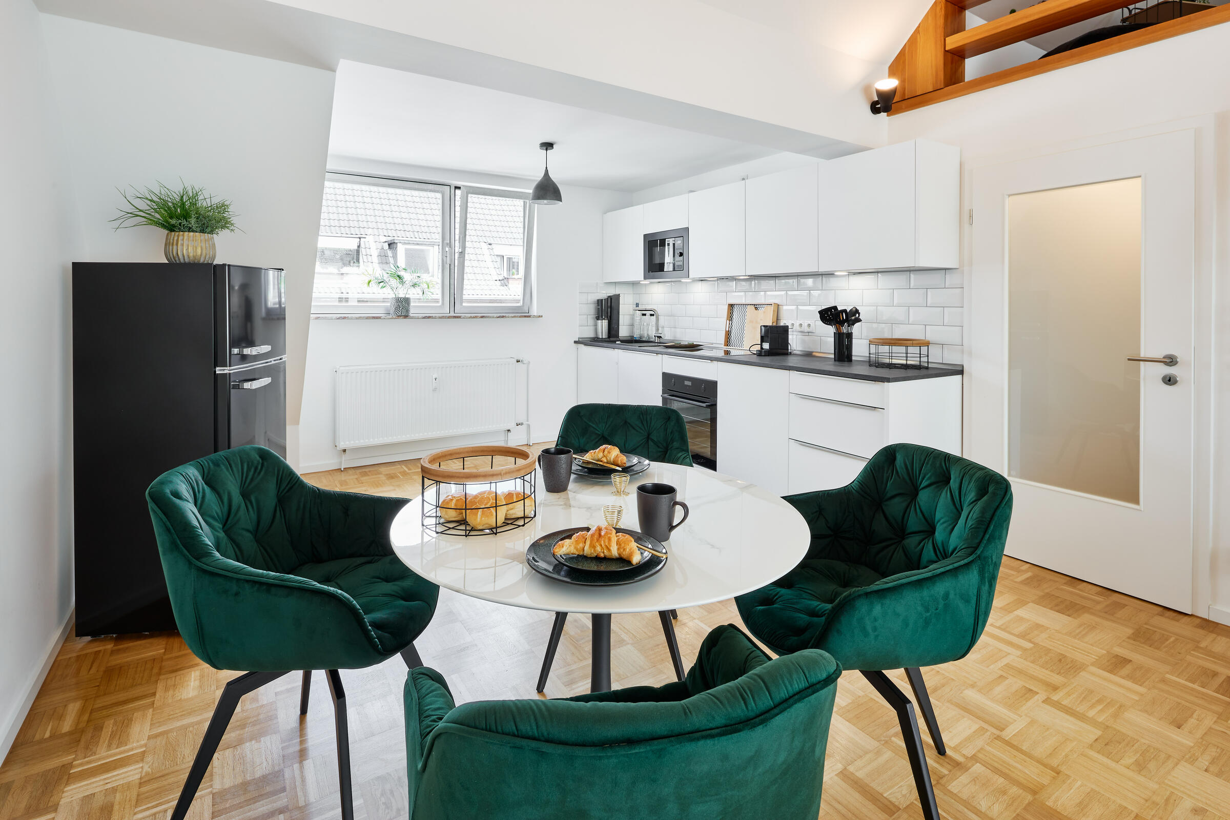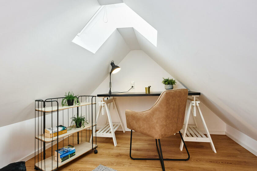 Die sehr helle 2-Zimmerwohnung befindet sich in unmittelbarer Nähe zur Messe Köln-Deutz und Schanzenstraße in Köln-Mülheim. Die Wohnung ist modern und komfortabel eingerichtet. Durch den kleinen Flur gelangt man in alle Räume. Besonders überrascht die Raumhöhe im Wohn- und Essbereich. Auch ist ein kleiner Schlaf- und Arbeitsbereich direkt unterm Dach geschaffen worden, was dem Wohnbereich eine Art Loftcharakter verleiht. Das Tageslichtbad ist mit begehbarer Dusche ausgestattet und modern eingerichtet. Die Wohnung ist ruhig gelegen, aber sehr zentral angebunden. Kostenloses Parken ist direkt vor dem Haus möglich.