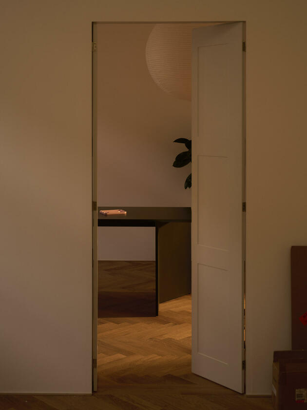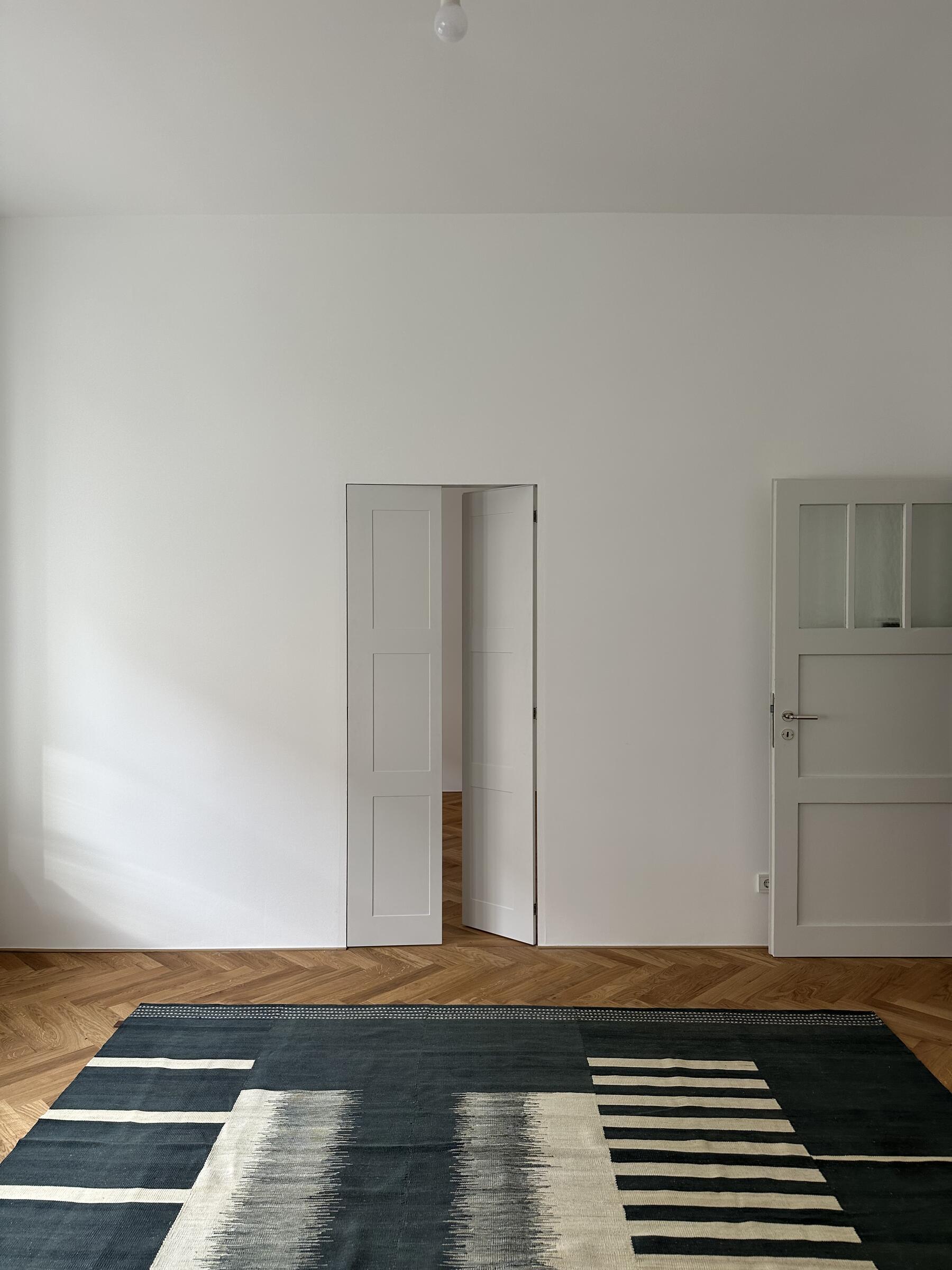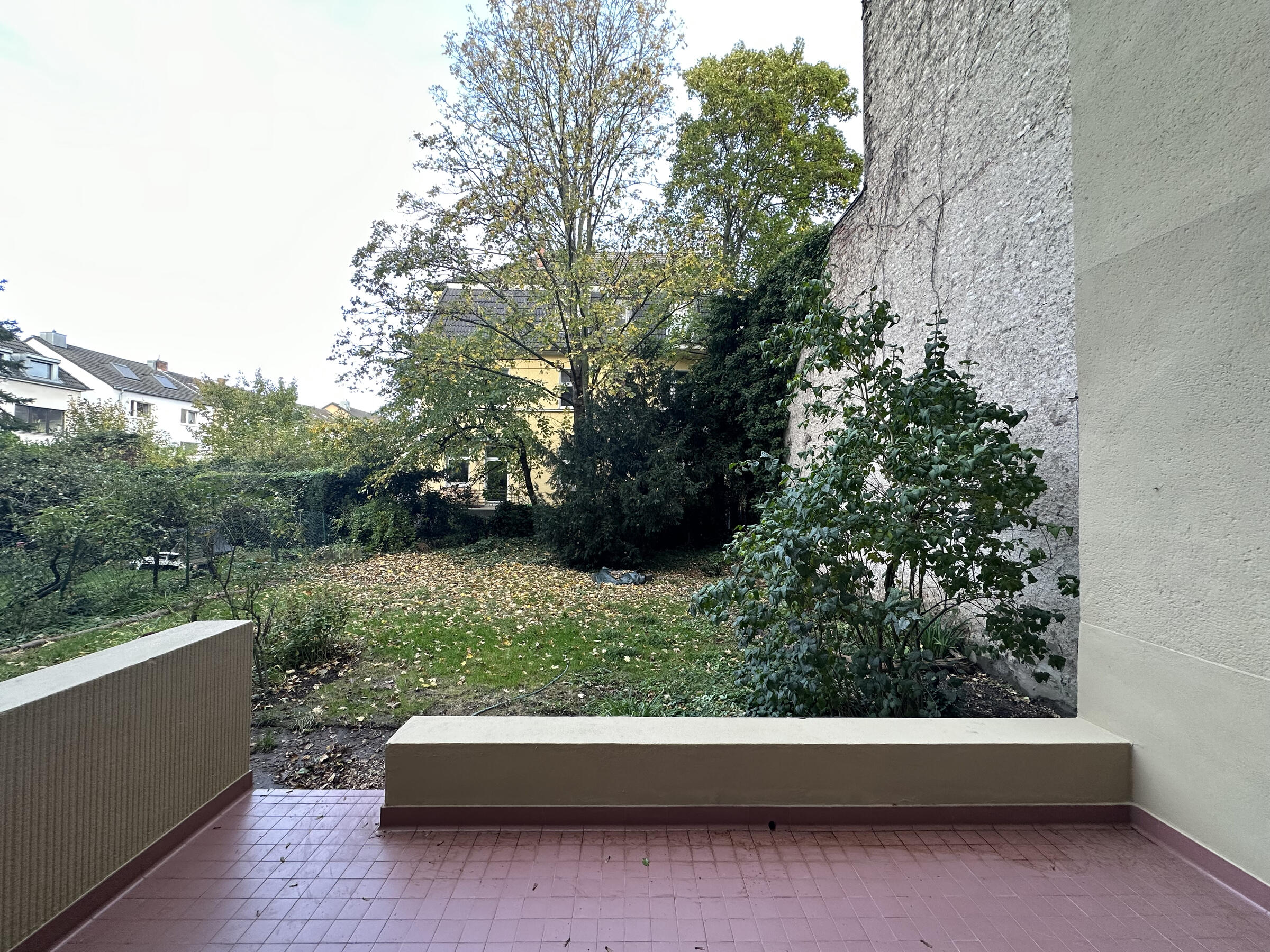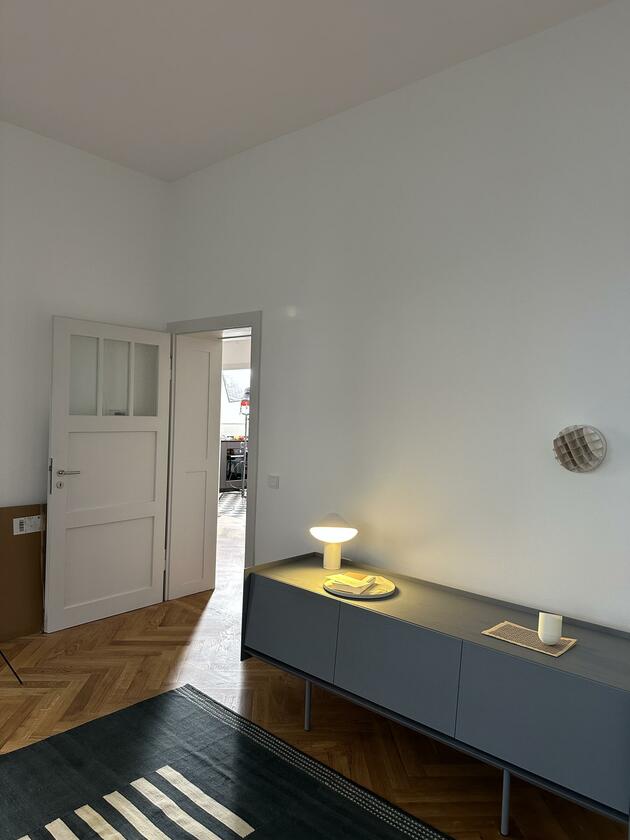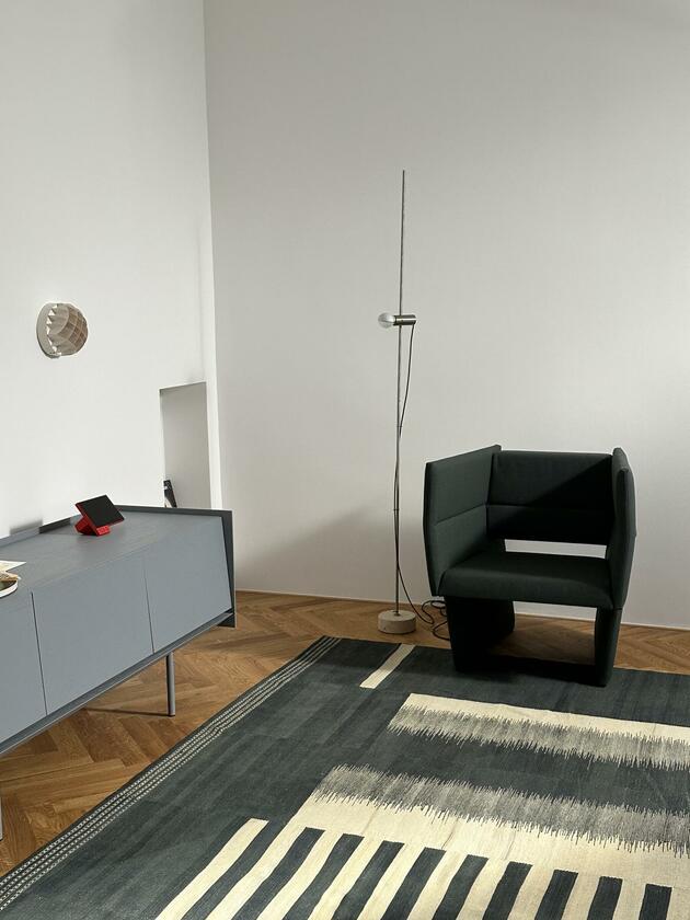 Die große Wohnung befindet sich in einem der frühen Wohnhäuser, die vom Kölner Architekten Wilhelm Riphahn stammen. Die Renovierung der Wohnung erfolgte unter Erhaltung der stilprägenden Elemente. Die Wohnung ist teilmöbliert. Die Wände der Räume sind glatt und weiß verputzt. Auf den Böden der Wohnräume wurde Fischgrätparkett in Eiche verlegt. Die offenporig lackierte Holzküche ist schokobraun und das Duschbad graublau gefliest. Die Fenster der Räume können mit Rolläden verdunkelt werden. Im Außenbereich stehen eine Terrasse und ein Garten zur Verfügung. Parkmöglichkeiten gibt es auf den öffentlichen Straßen.