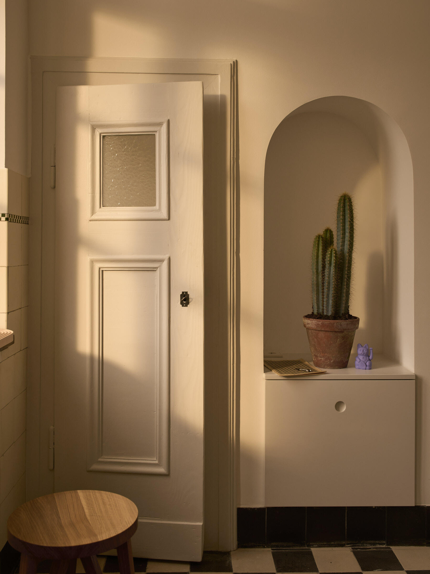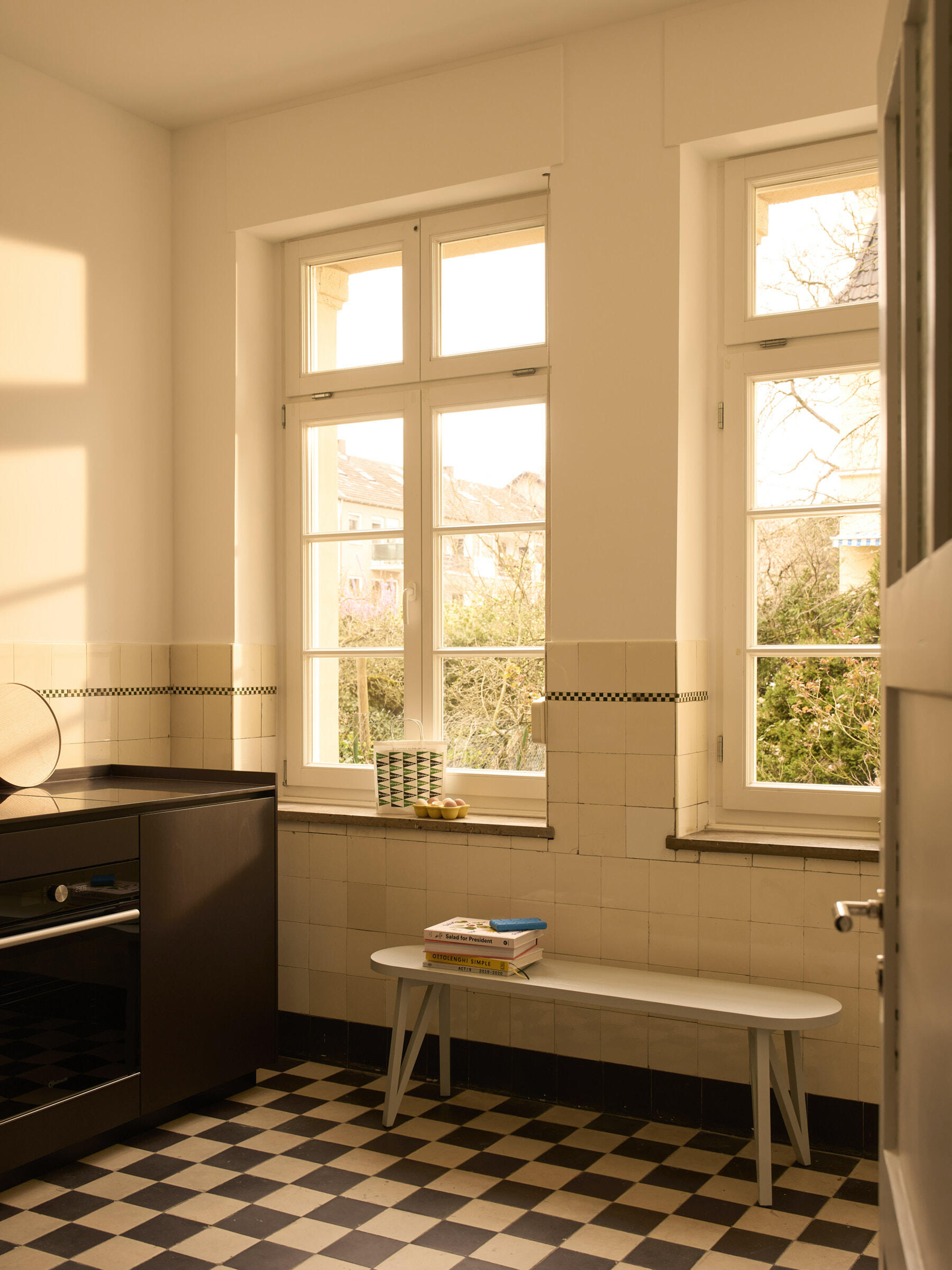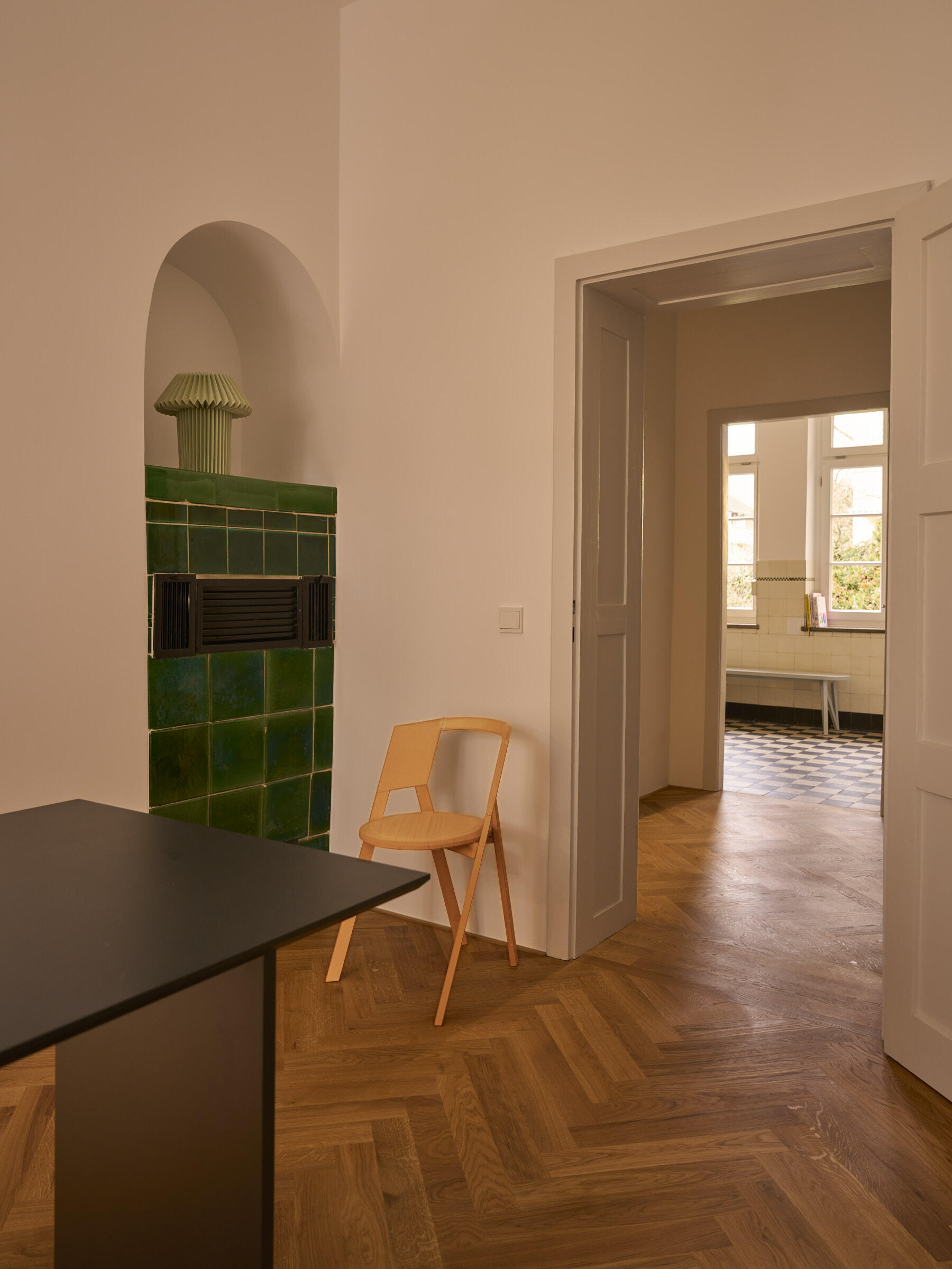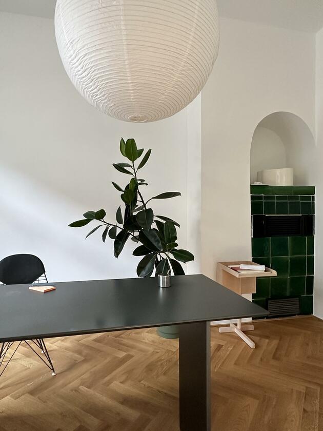 Die große Wohnung befindet sich in einem der frühen Wohnhäuser, die vom Kölner Architekten Wilhelm Riphahn stammen. Die Renovierung der Wohnung erfolgte unter Erhaltung der stilprägenden Elemente. Die Wohnung ist teilmöbliert. Die Wände der Räume sind glatt und weiß verputzt. Auf den Böden der Wohnräume wurde Fischgrätparkett in Eiche verlegt. Die offenporig lackierte Holzküche ist schokobraun und das Duschbad graublau gefliest. Die Fenster der Räume können mit Rolläden verdunkelt werden. Im Außenbereich stehen eine Terrasse und ein Garten zur Verfügung. Parkmöglichkeiten gibt es auf den öffentlichen Straßen.
