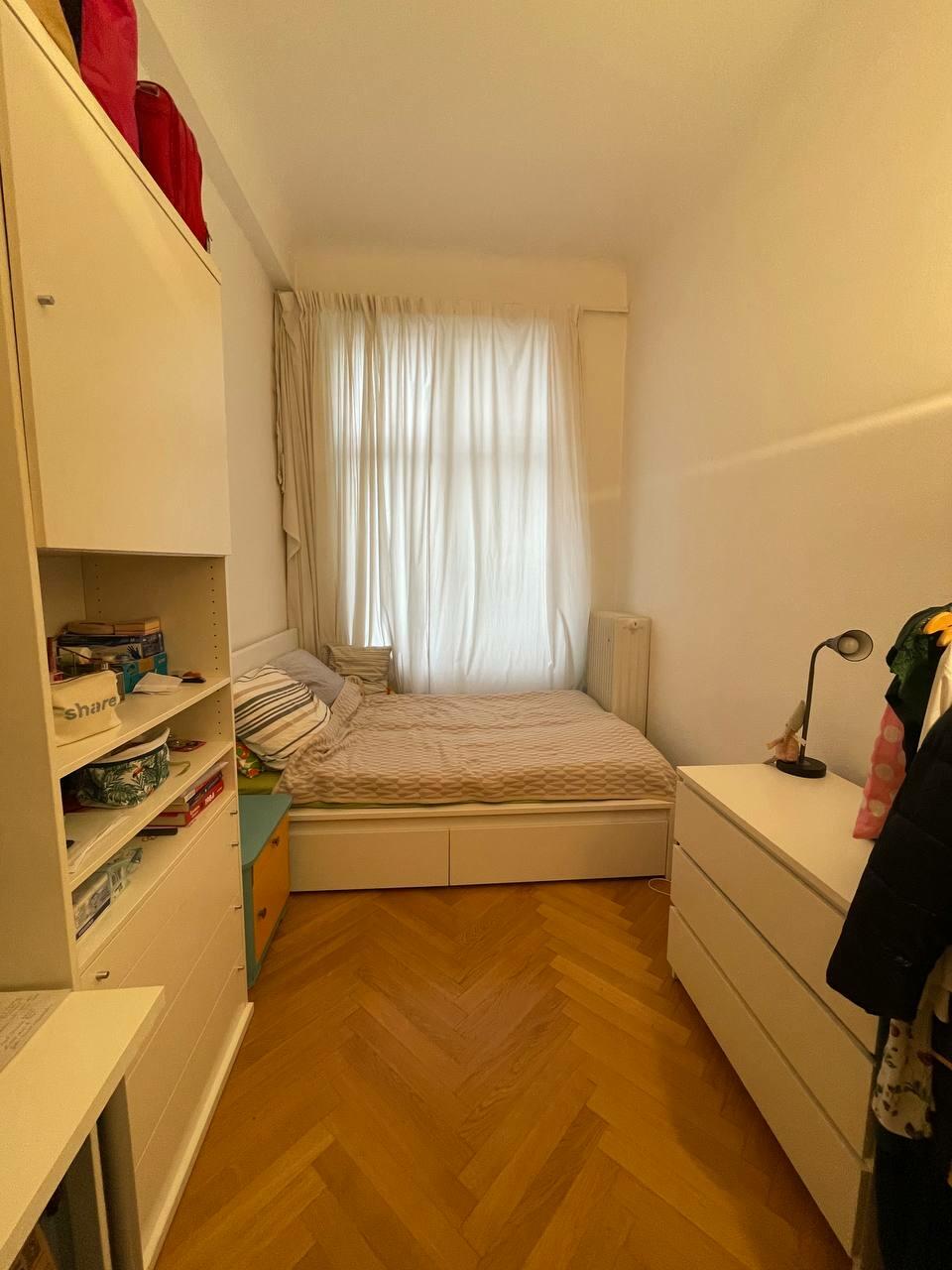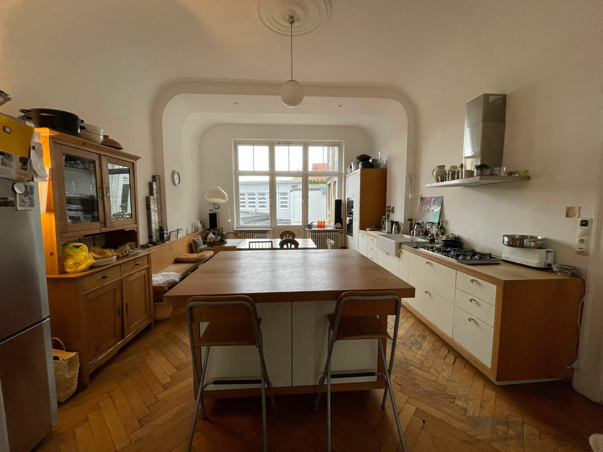 Die großzügige Altbauwohnung befindet sich im 4. Obergeschoss, ohne Aufzug, eines denkmalgeschützten Wohnhaus in der Kölner Südstadt. Vor ca. 20 Jahren wurden hier zwei Wohnungen zusammengelegt. Heute besticht der vordere Bereich der Wohnung mit hohen Stuckdecken, Flügeltüren und Fischgrätparkett sowie großzügigen, hellen Gemeinschaftsräumen. Das Wohnzimmer kann bei Bedarf durch eine Falttür von der Küche abgetrennt werden. Beide Räume haben einen eigenen Balkon und sind sehr hell. Im hinteren Wohnungsabschnitt schließen sich weitere Schlafzimmer mit weiß gestrichenem Dielenboden an, die teils mit eigenem Balkon, teils mit eigenem Bad bestechen.