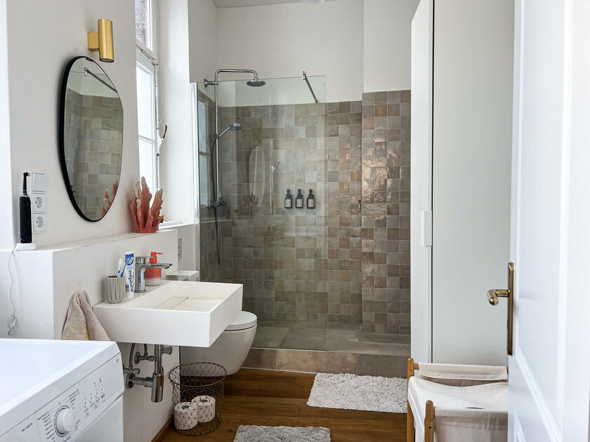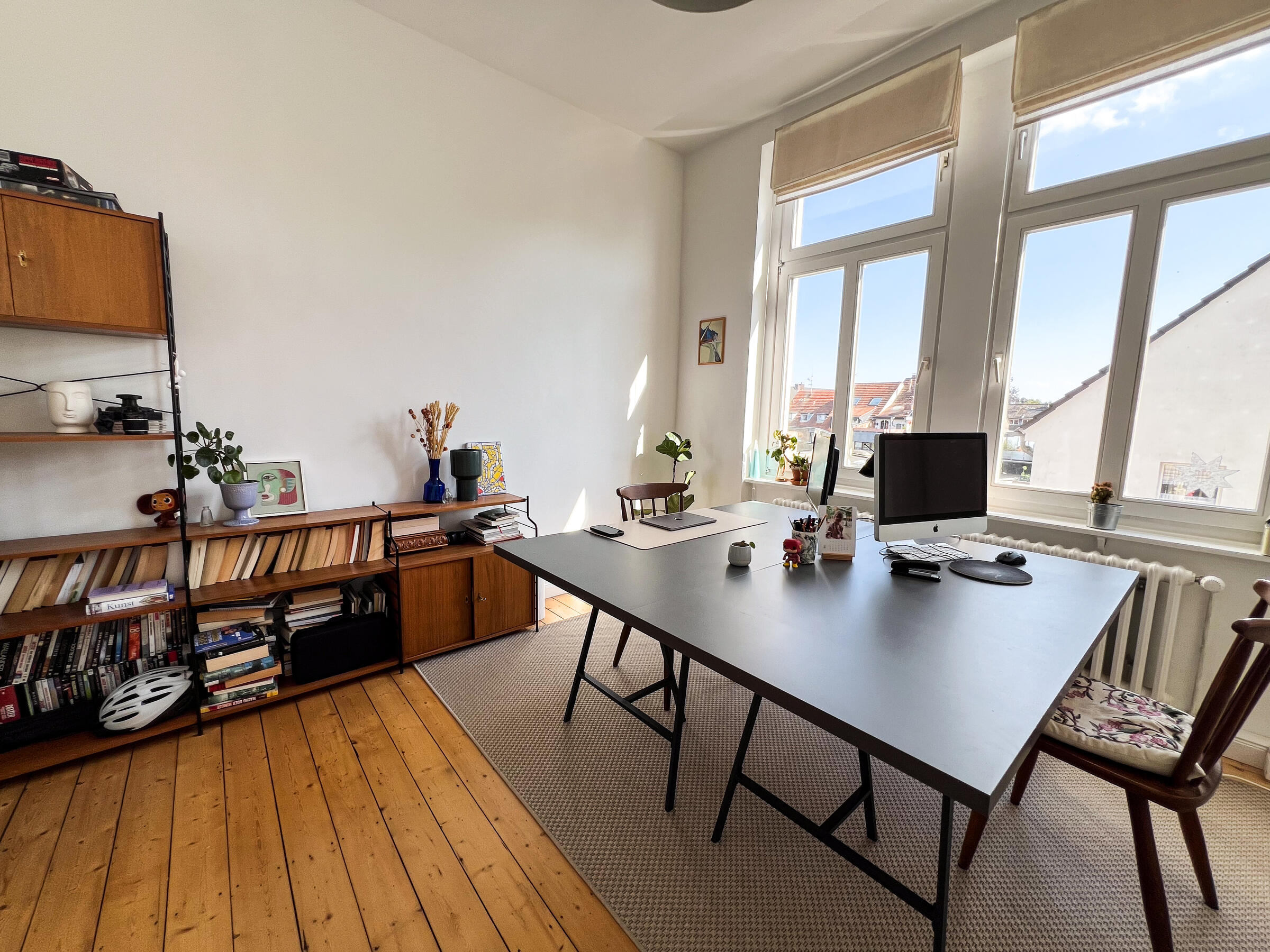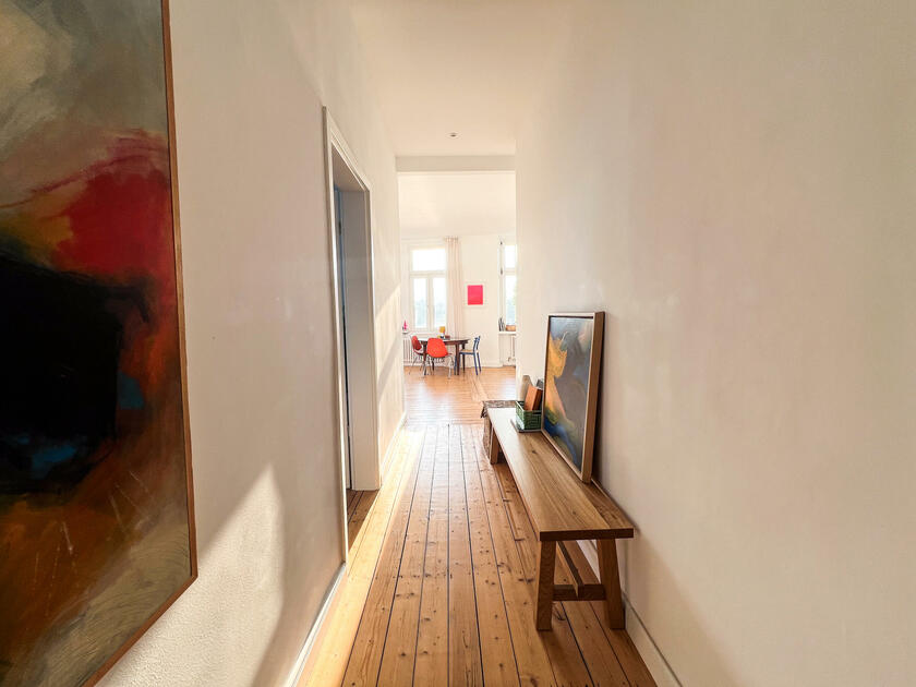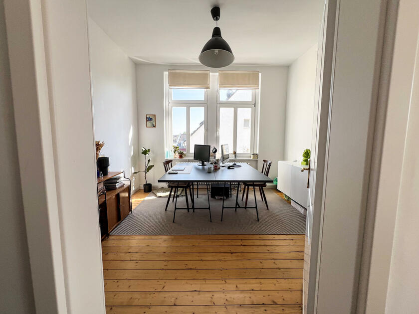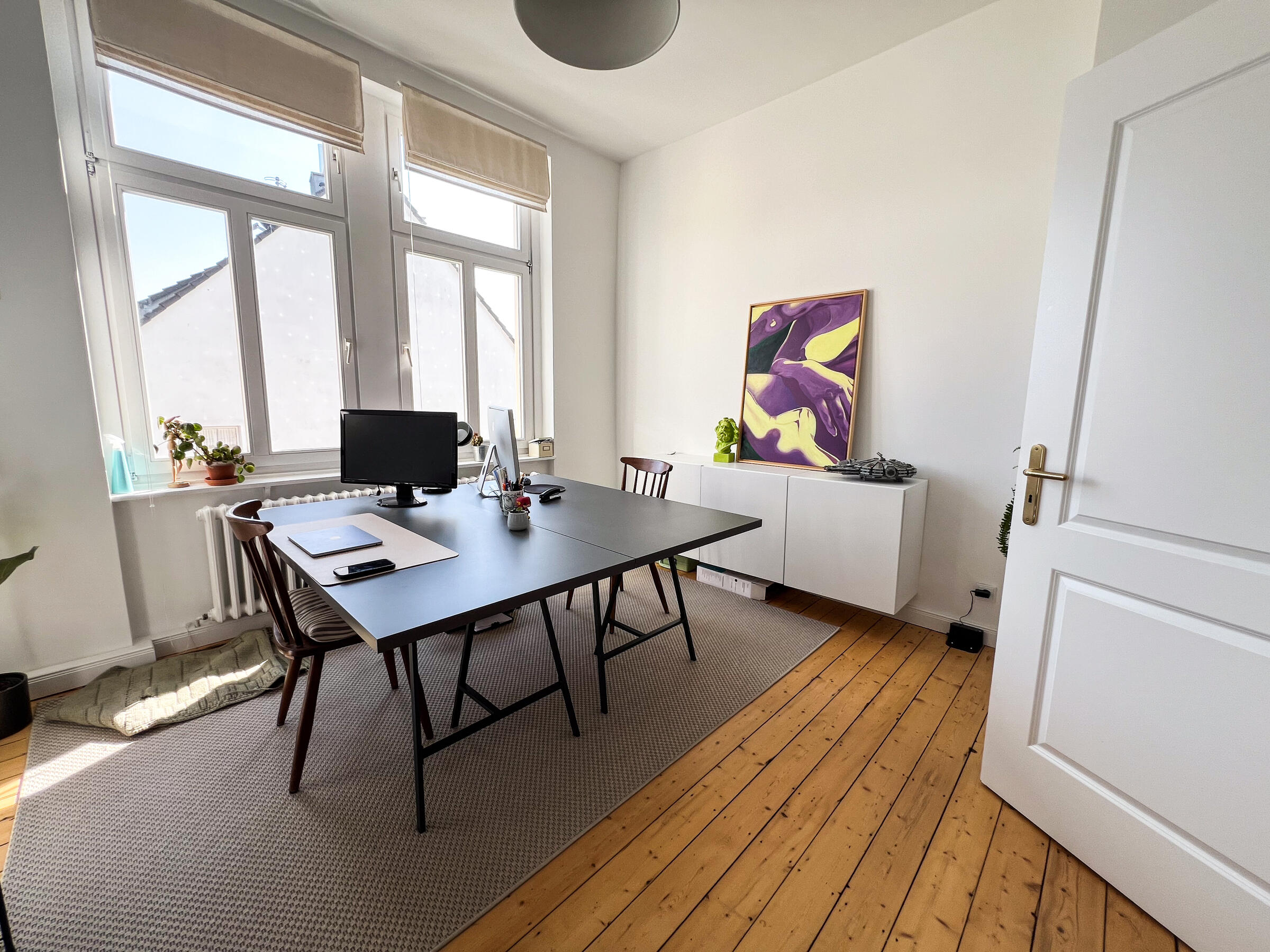 Die großzügige Altbauwohnung befindet sich in einem 1917 erbauten denkmalgeschützten Haus in Köln Mülheim direkt am Rhein. Die liebevoll eingerichtete Wohnung befindet sich auf der 3. Etage ohne Aufzug. Durch die großen Fenster fällt ganztägig viel Sonnenlicht in die Räume. Die 3 m hohen Decken und der Holzdielenboden verleihen dabei einen gemütlichen Charme, der mit modernen Möbeln kombiniert wird. Auch die Marrazzi Fliesen in der Wohnküche und im Badezimmer unterstreichen den stilvollen Look der Wohnung. Der Küchenbereich bietet eine Kücheninsel. Die Wohnung ist vollständig möbliert, kann nach Wunsch jedoch umgeändert werden. Direkt vor dem Haus findet sich ein großer Parkplatz mit genügend kostenfreien Parkplätzen.