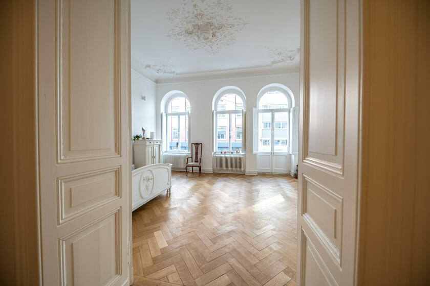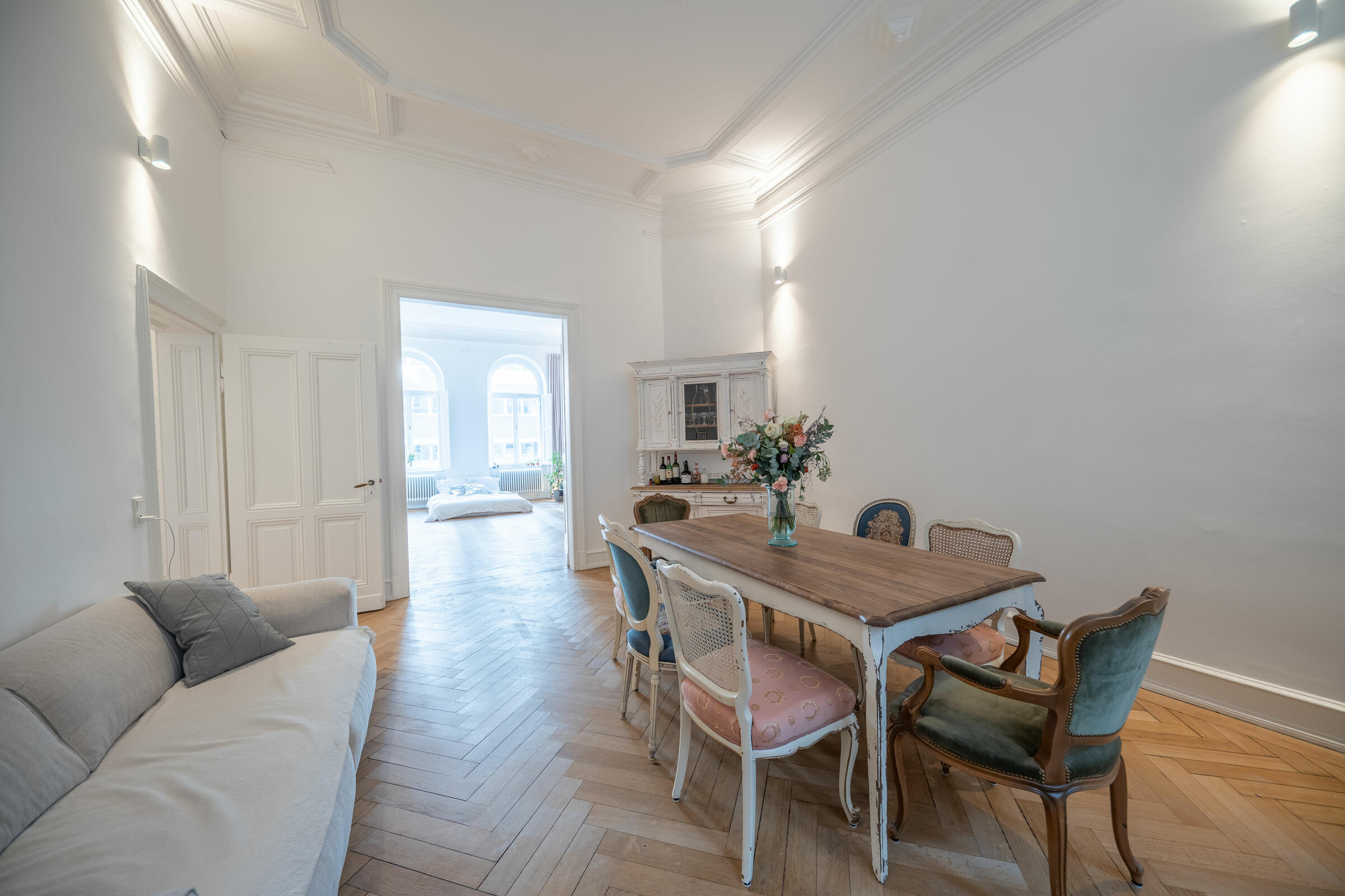 Diese bezaubernde Altbauwohnung befindet sich in der Beletage eines historischen Hauses aus dem Jahr 1890. Die großen und lichtdurchfluteten Räume sind hell und freundlich eingerichtet. Die Stuckverzierungen an den hohen Decken und die ausgewählte Möblierung verleihen der Wohnung einen historischen Charme. Die großen Rundbogenfenster können teilweise mit Hilfe von innenliegenden Fensterläden verdunkelt werden. Nach Absprache können die Räume umgestaltet werden. Jedoch sind Wandbohrungen und Tapezieren nicht gestattet. Ein Balkon zum Innenhof steht ebenfalls zur Verfügung. Parkplätze befinden sich vor dem Haus.