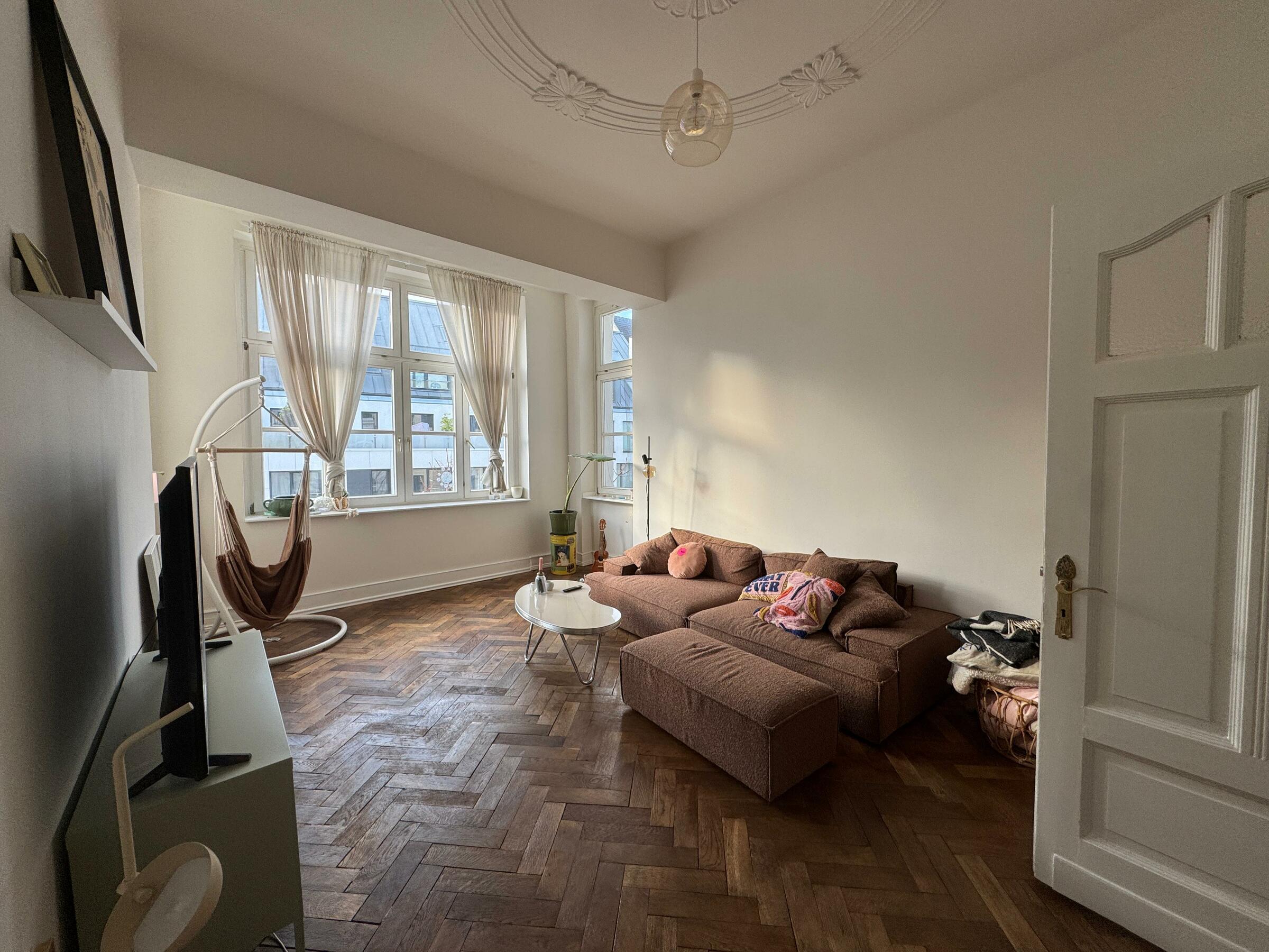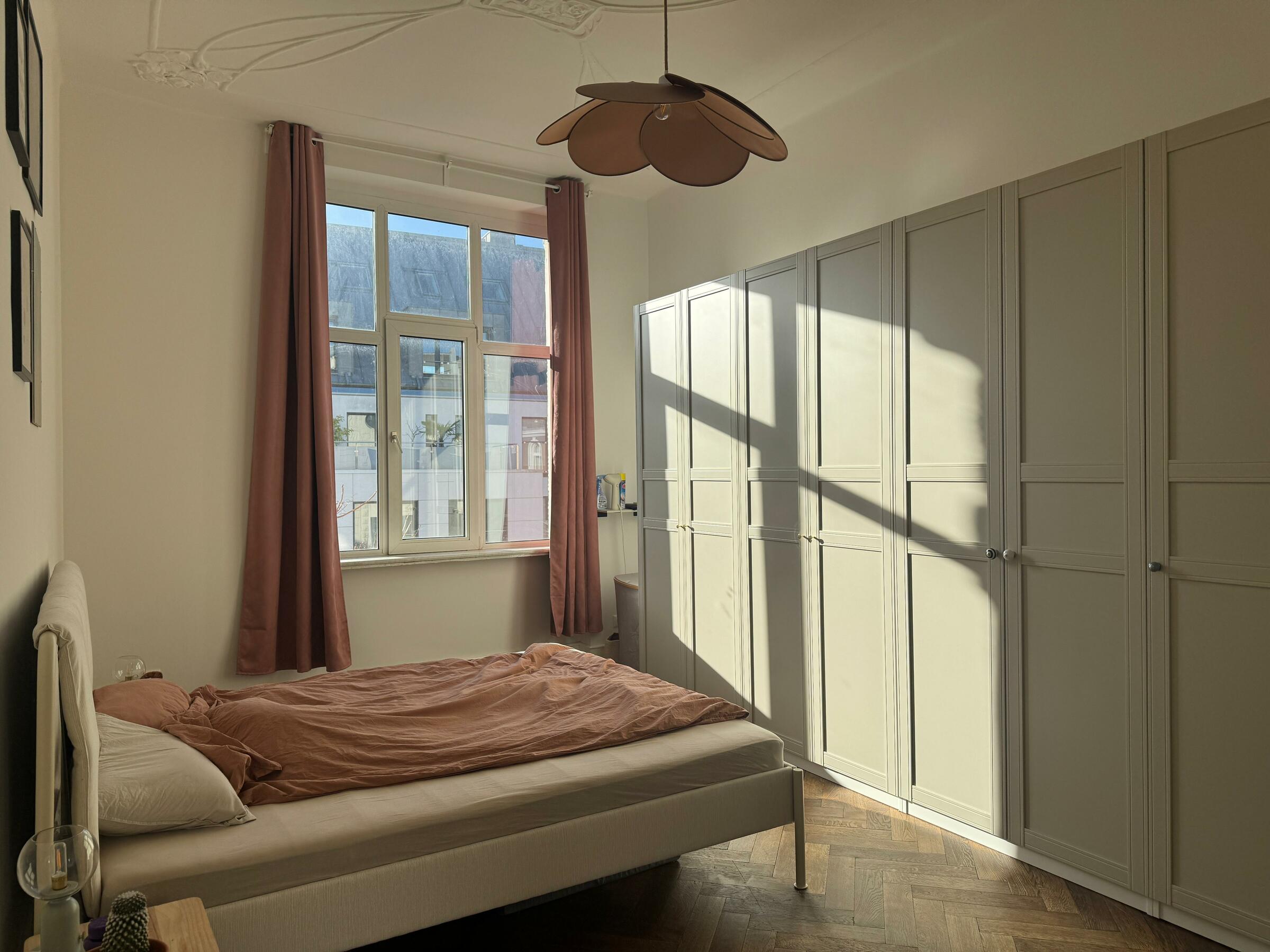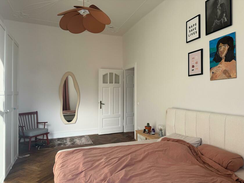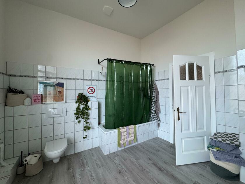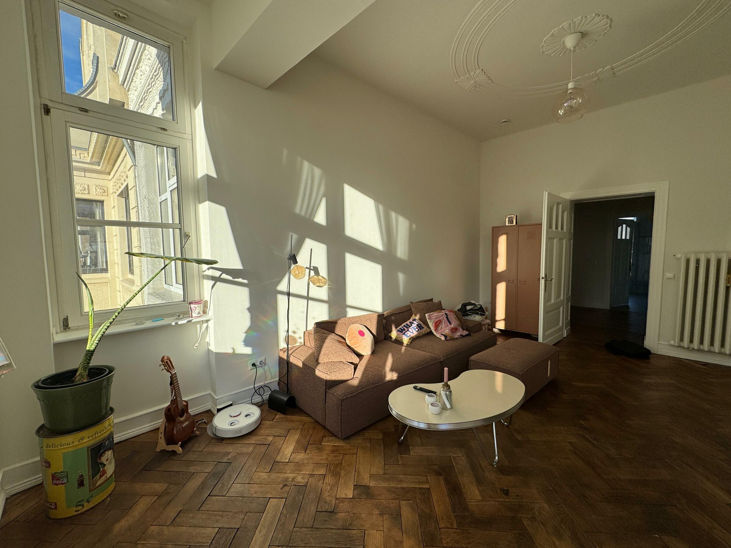 Die Altbauwohnung befindet sich im 3. Obergeschoss eines Wohnhauses in einer ruhigen Umgebung. Die Räume sind zeitgemäß und funktional möbliert und bieten hohe Decken, die teilweise mit Stuck verziert sind. Auf den Böden der Wohnräume ist hochwertiges Fischgrät-Parkett, im Flur Dielen und im Badezimmer Laminat verlegt worden. Die Räume haben große Fenster, die mit Hilfe von Vorhängen verdunkelt werden können. Die Räume dürfen nach Absprache umgestaltet werden. Parkplätze lassen sich an der am Haus vorbeiführenden Einbahnstraße oder im 4 min entfernten öffentlichen Parkhaus finden.