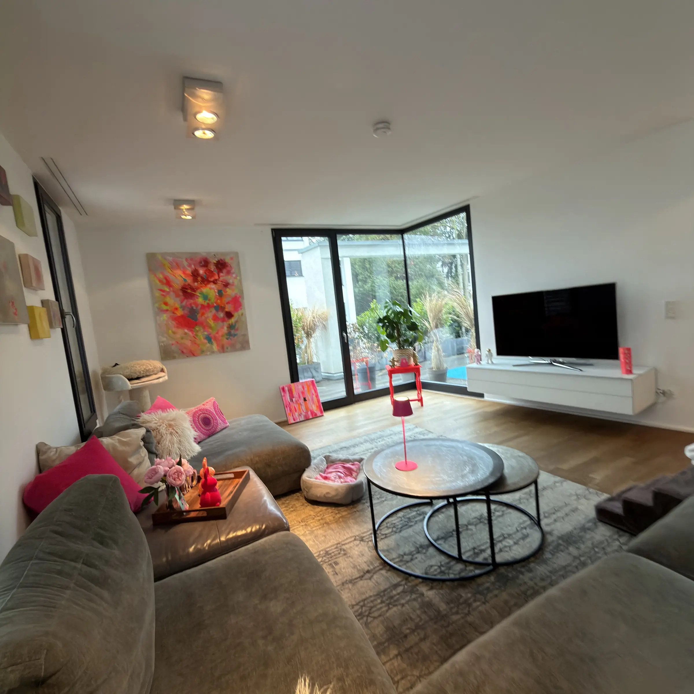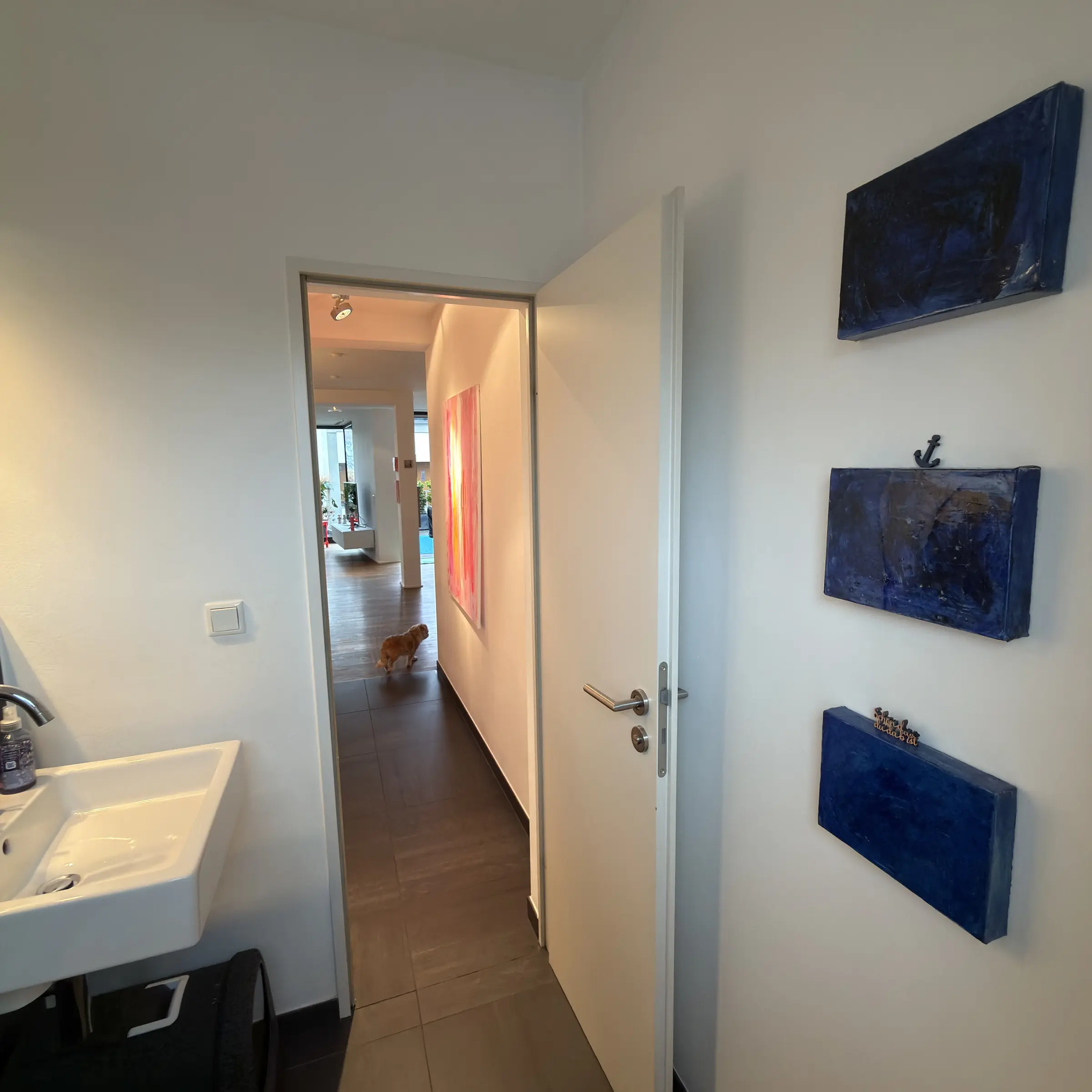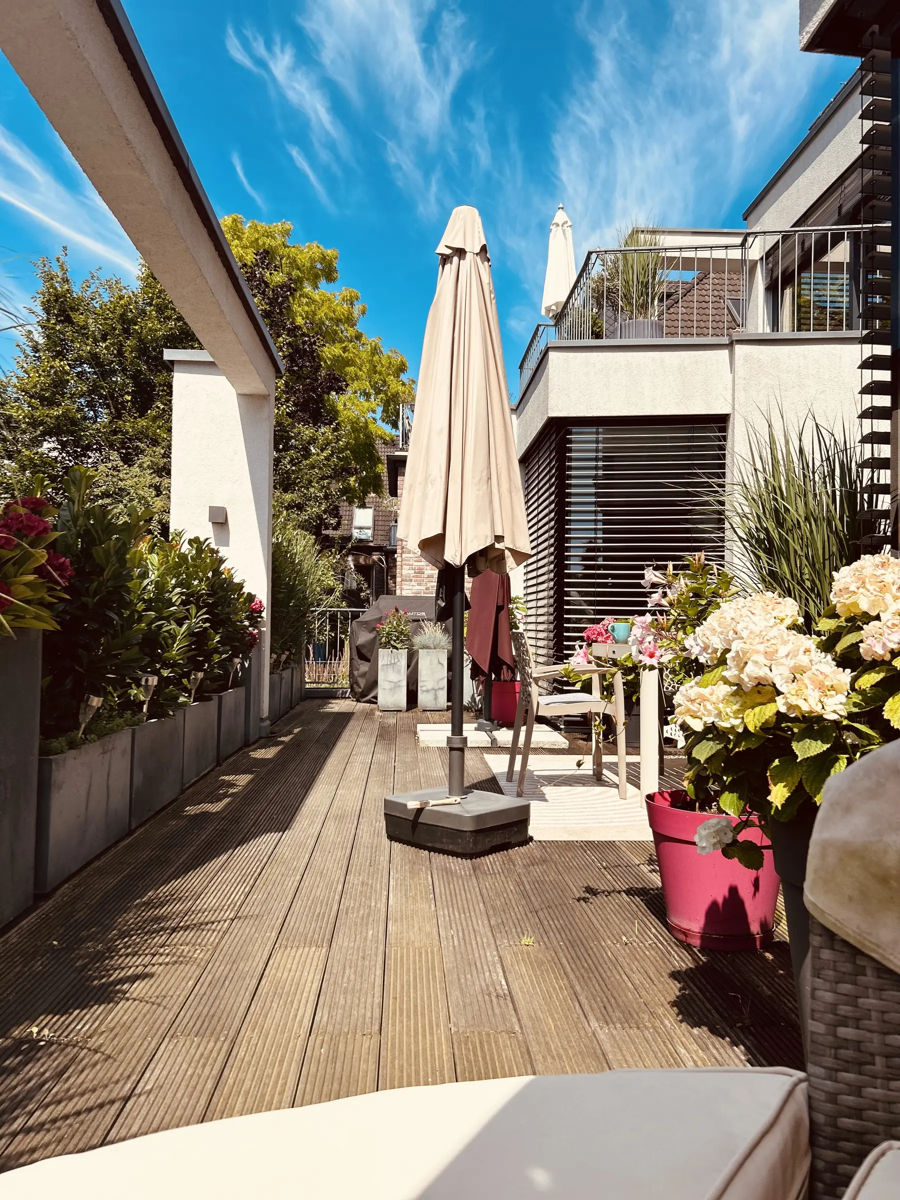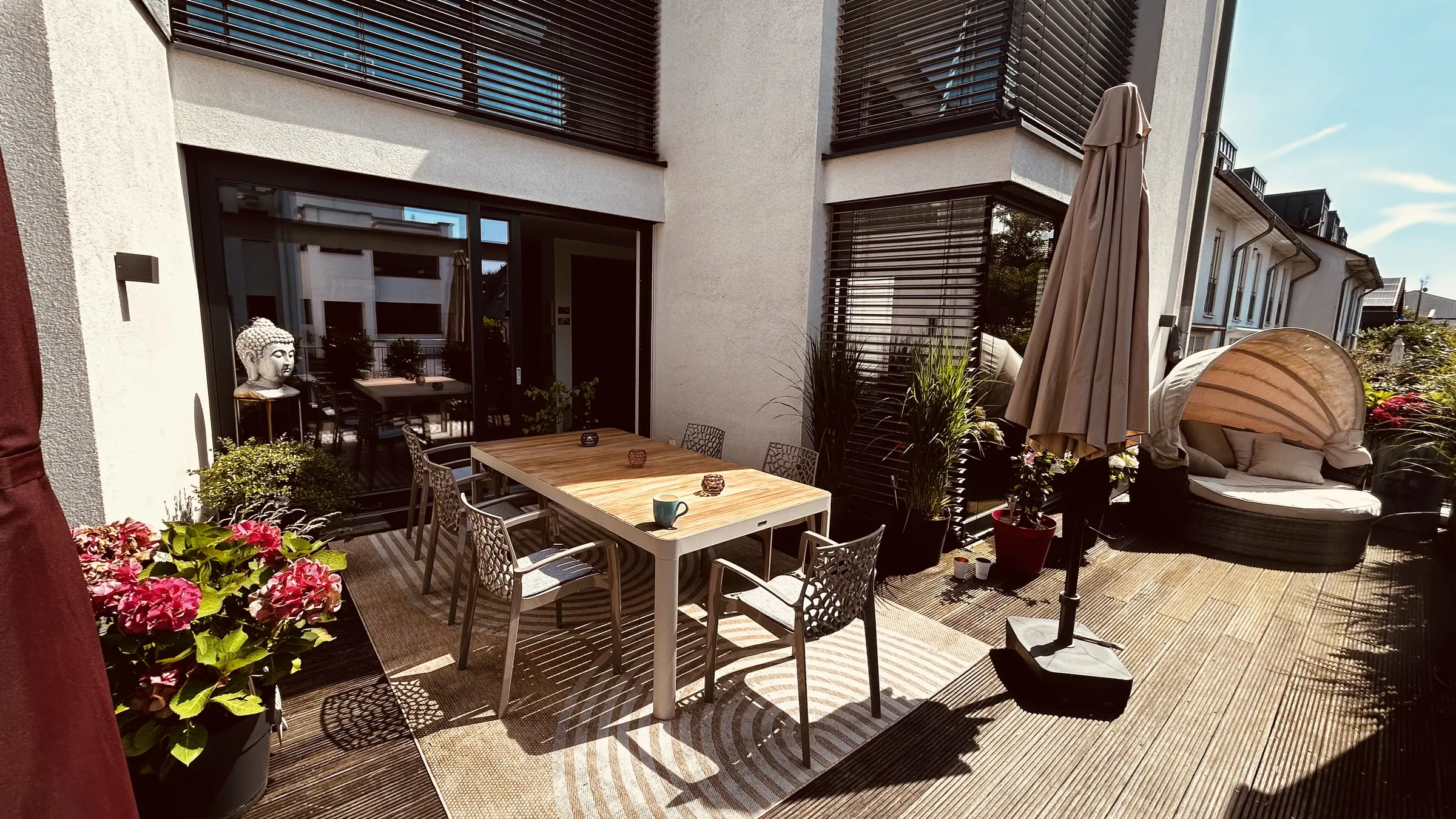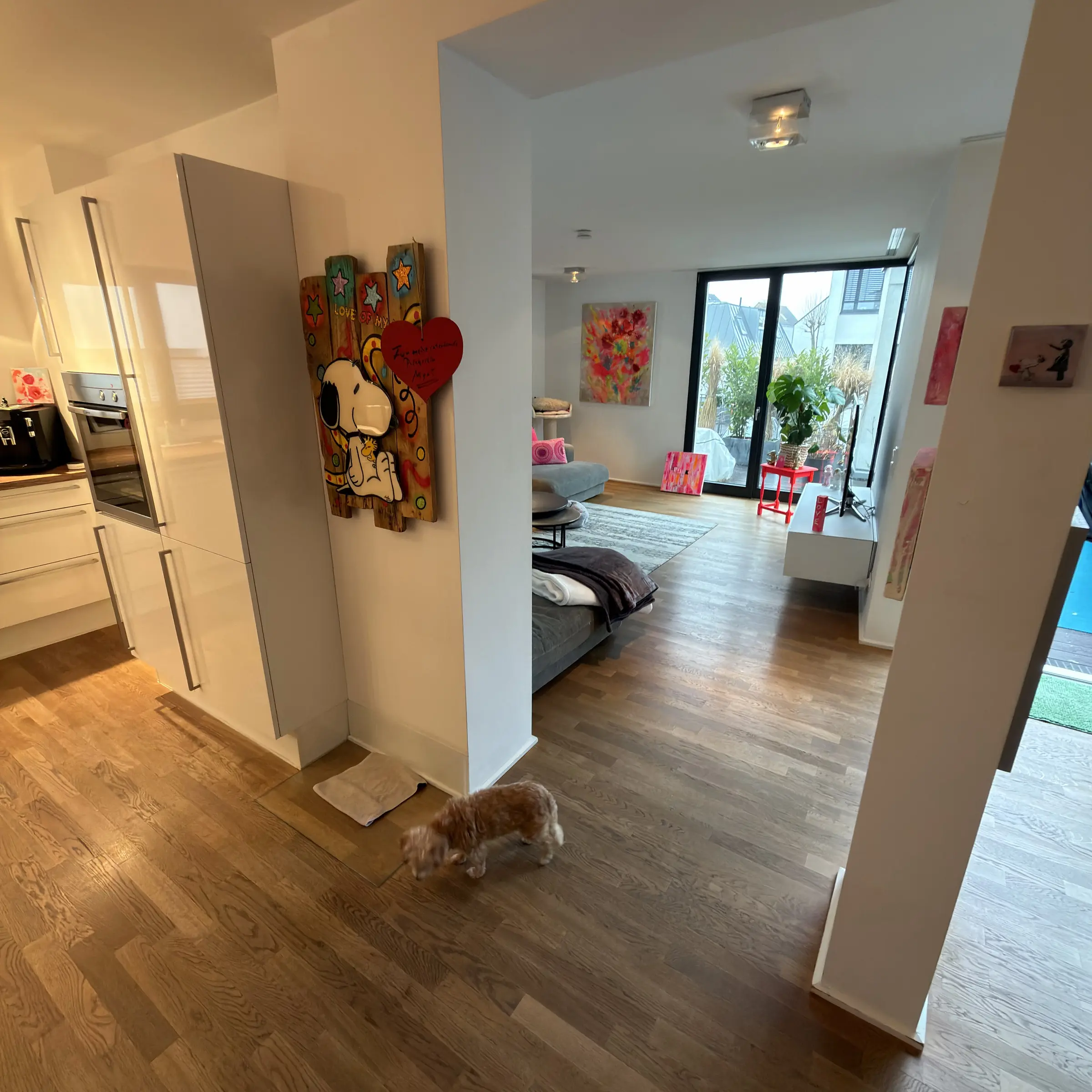 Meine Wohnung befindet sich in einem Wohnhaus im Kölner Süden, in Rheinnähe. Die Wohnung ist modern und hell eingerichtet und gestaltet. Die offene Wohnküche geht fließend in den Essbereich über. Durch die teilweise bodentiefen Fenster fällt viel Tageslicht in die Räume. Die Fenster können mit Jalousien abgedunkelt werden. Das große Bad bietet eine Badewanne und Gäste-WC. Ein Ankleideraum ist ebenfalls vorhanden. Die Räume dürfen nach Absprache umgestaltet werden. Die Wohnung liegt in Hochparterre, mit nur fünf Stufen, was den Transport von Equipment erleichtert. Im Außenbereich steht eine große Terrasse zur Verfügung. Parkplätze gibt es direkt vor dem Haus.