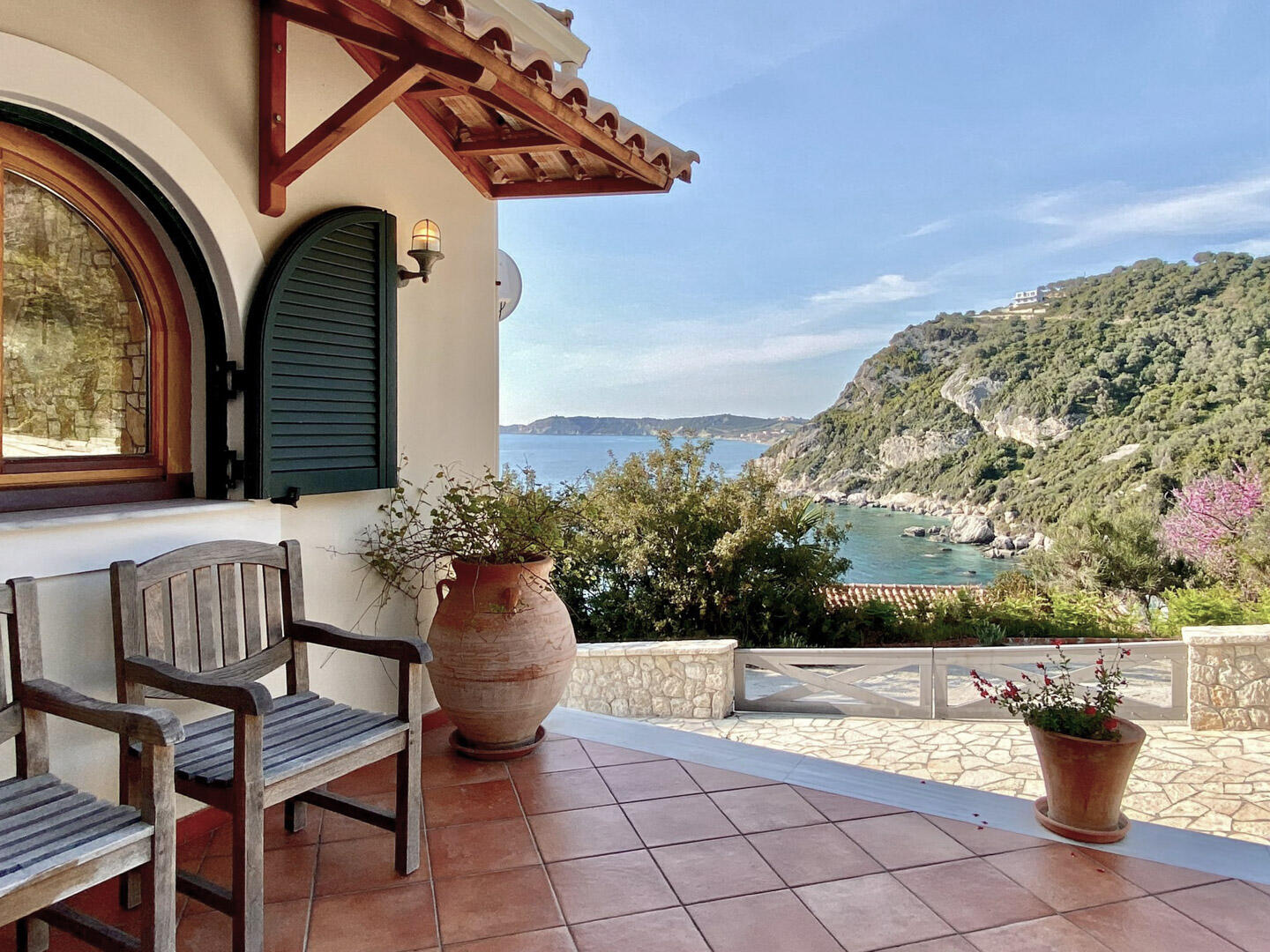 Die Villa befindet sich abseits eines kleinen Bergdörfchens im Nordwesten der Insel Korfu. Die hellen und lichtdurchfluteten Wohnräume des Hauses erstrecken sich über 2 Etagen. Das Haus bietet einen offenen Wohn- und Essbereich der in die offen gestaltete Küche übergeht. Die große Küche verfügt über eine Kücheninsel, eine Theke und Sitzgelegenheiten. In der oberen Etage befinden sich Schlafzimmer mit jeweiliger Veranda. Im Außenbereich bietet das Haus eine großzügige Terrasse und einen Garten. Das Haus bietet in alle Richtungen unverbauten Blick ins Grüne oder direkt aufs Meer. Es sind lediglich ein paar Schritte über das private Gelände und den Felsen bis zum Meer. Über einen unbefestigten Weg gelang man vom Dorf hinunter zur Villa, wo es Parkmöglichkeiten direkt vor den Eingängen gibt. Ein Allradfahrzeug ist empfehlenswert. Vom Flughafen Kerkyra sind es ca. 60 min Autofahrt bis zum Haus.