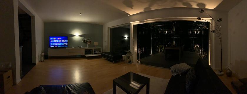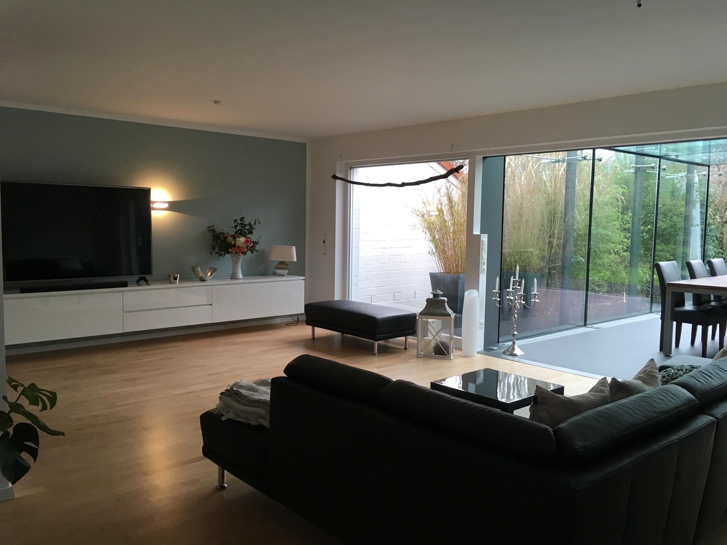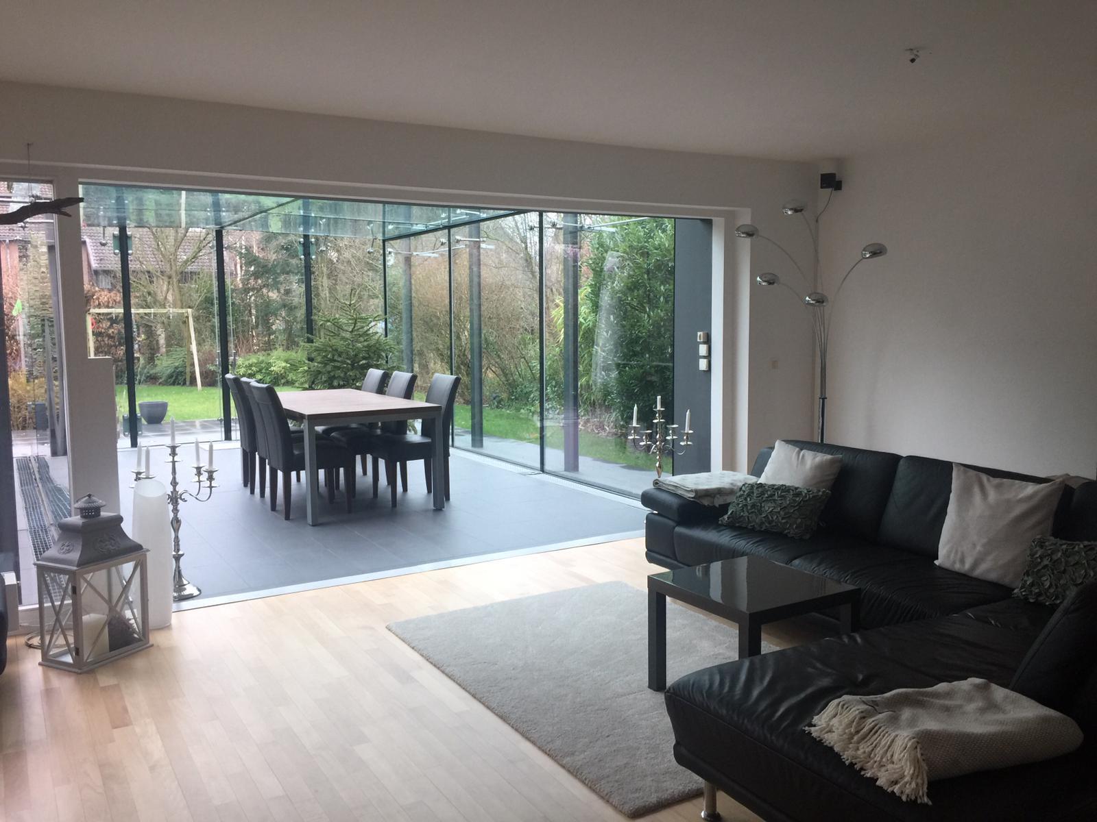 Das große Wohnzimmer bietet ausreichend Platz und durch die gesamte Front zum Garten, ist der Raum tagsüber von Licht durchflutet. Am Abend können die Spotlichter im Wintergarten angeschaltet werden, was einen unglaublichen Effekt hervorbringt.