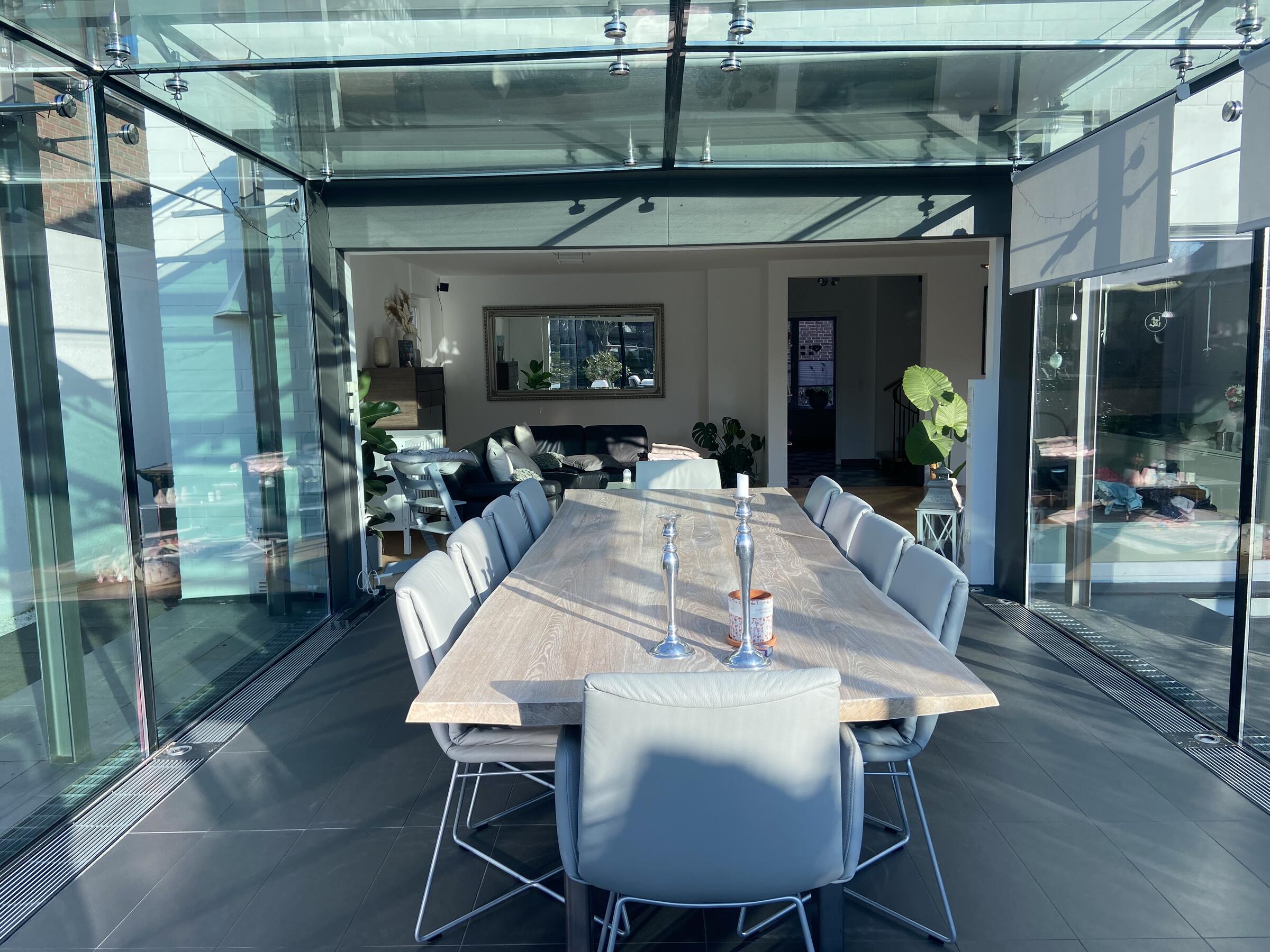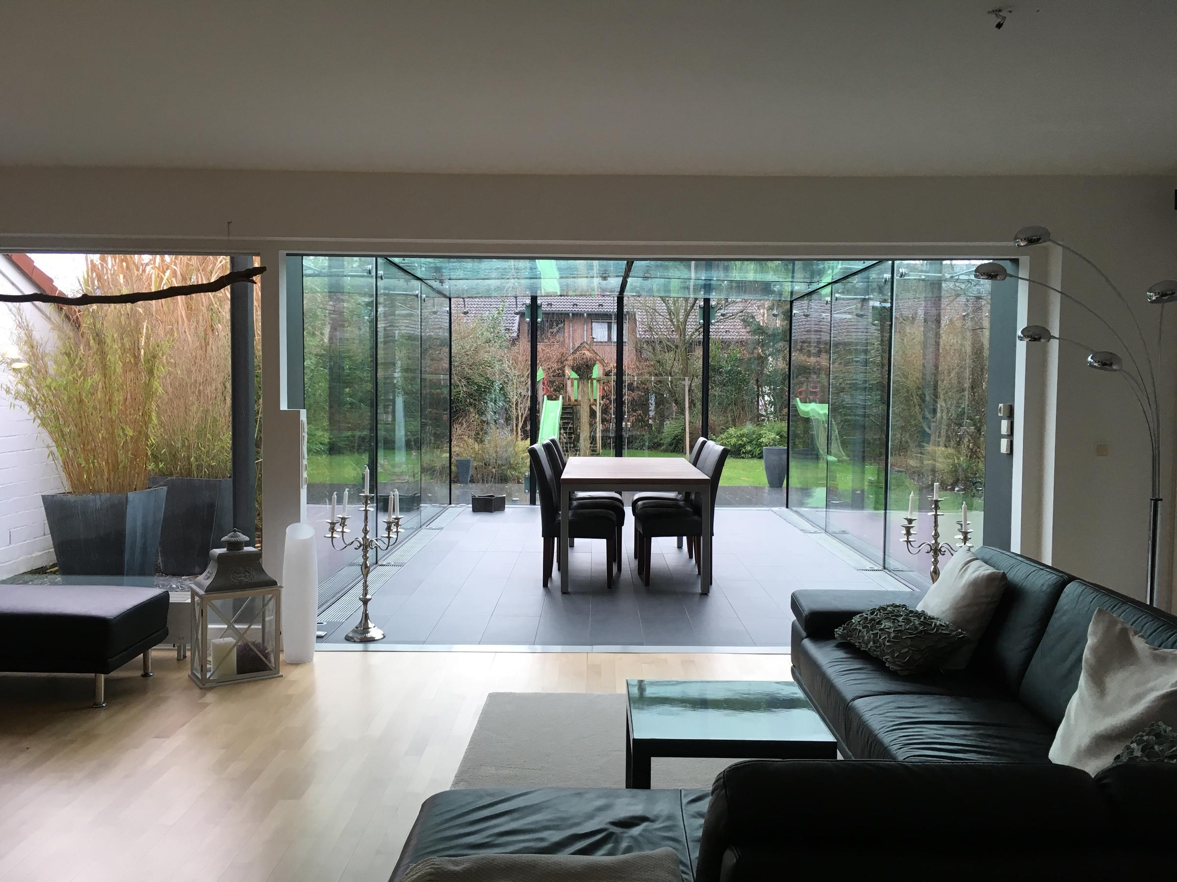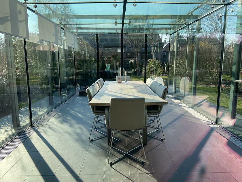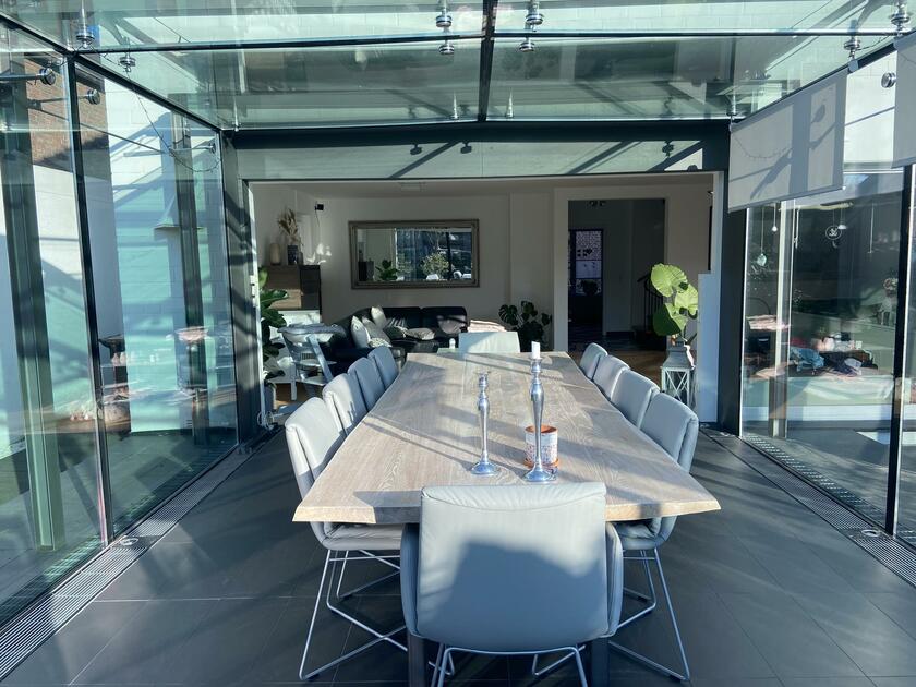 Die puristische Glaskonstruktion des Wintergartens öffnet und erhellt das Wohnzimmer, wo wunderbare Aufnahmen gedreht werden können. Jeweils zwei der Fenster an den beiden Seitenfronten lassen sich elektrisch aufkippen. Zudem gibt es zwei Flügeltüren, die sich zur Terrasse hin öffnen lassen.