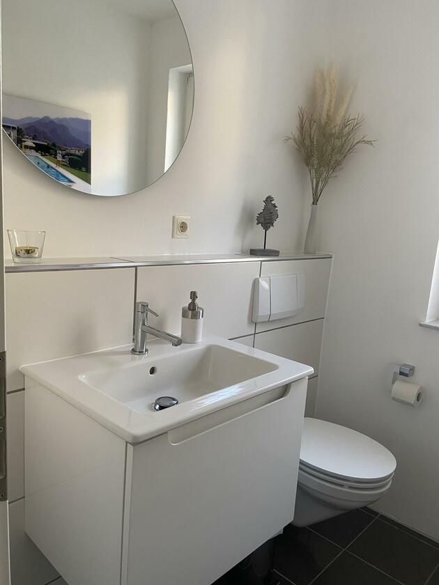 Im ausgebauten Keller befindet sich ein großer Aufenthaltsraum mit einer Einbauschrankwand, wo sich zur Zeit eine Hantelbank und ein Crosstrainer mit einem Fernseher befinden. Desweiteren gibt es hier auch ein kleines abgetrenntes Duschbad. In dem Raum können kann als Teamaufenthalt oder für die Maske verwendet werden. Im Keller gibt es desweiteren einen Heizungsraum und einen Vorratsraum, die als Abstellfläche verwendet werden können.