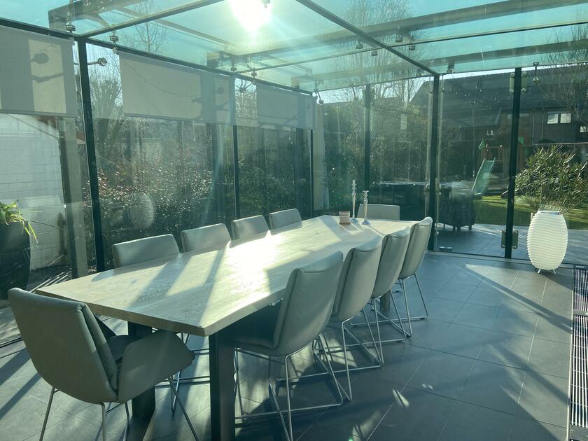 Bei starker Sonneneinstrahlung verhindert ein außenliegender Sonnenschutz die übermäßige Aufheizung. Der Wintergarten hat auch eine Fußbodenheizung.