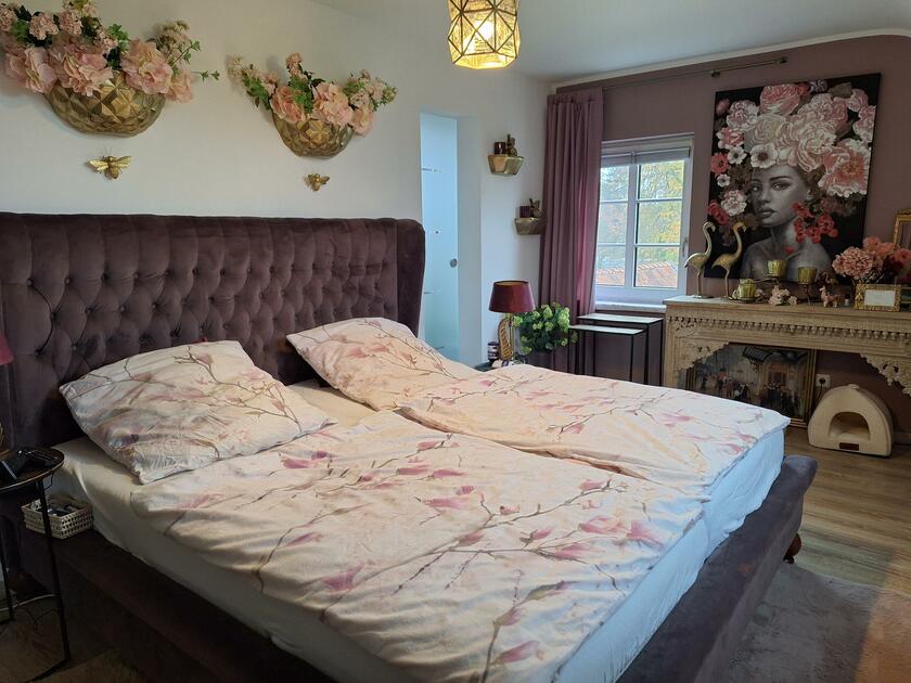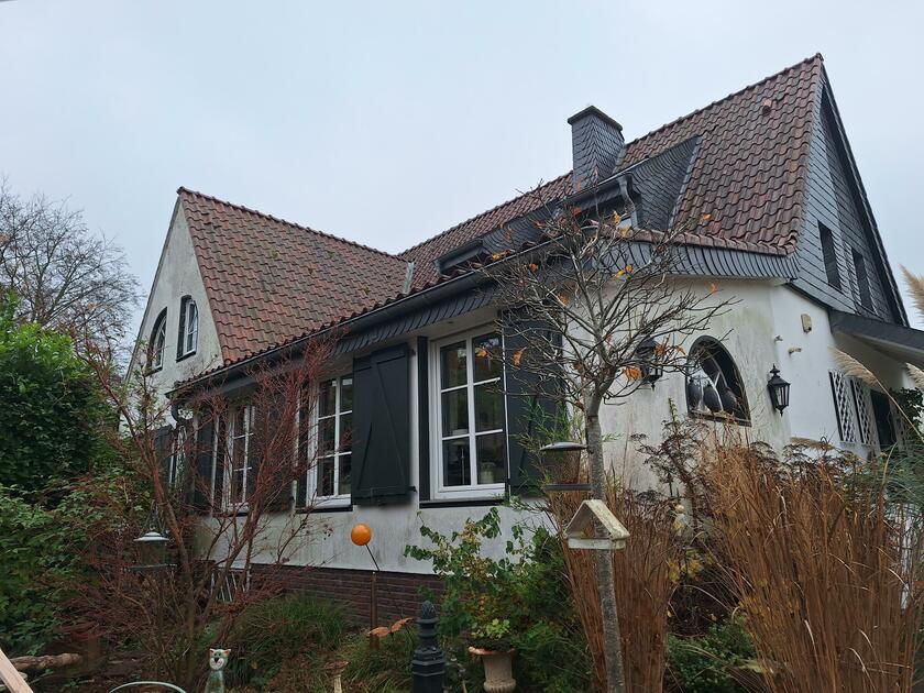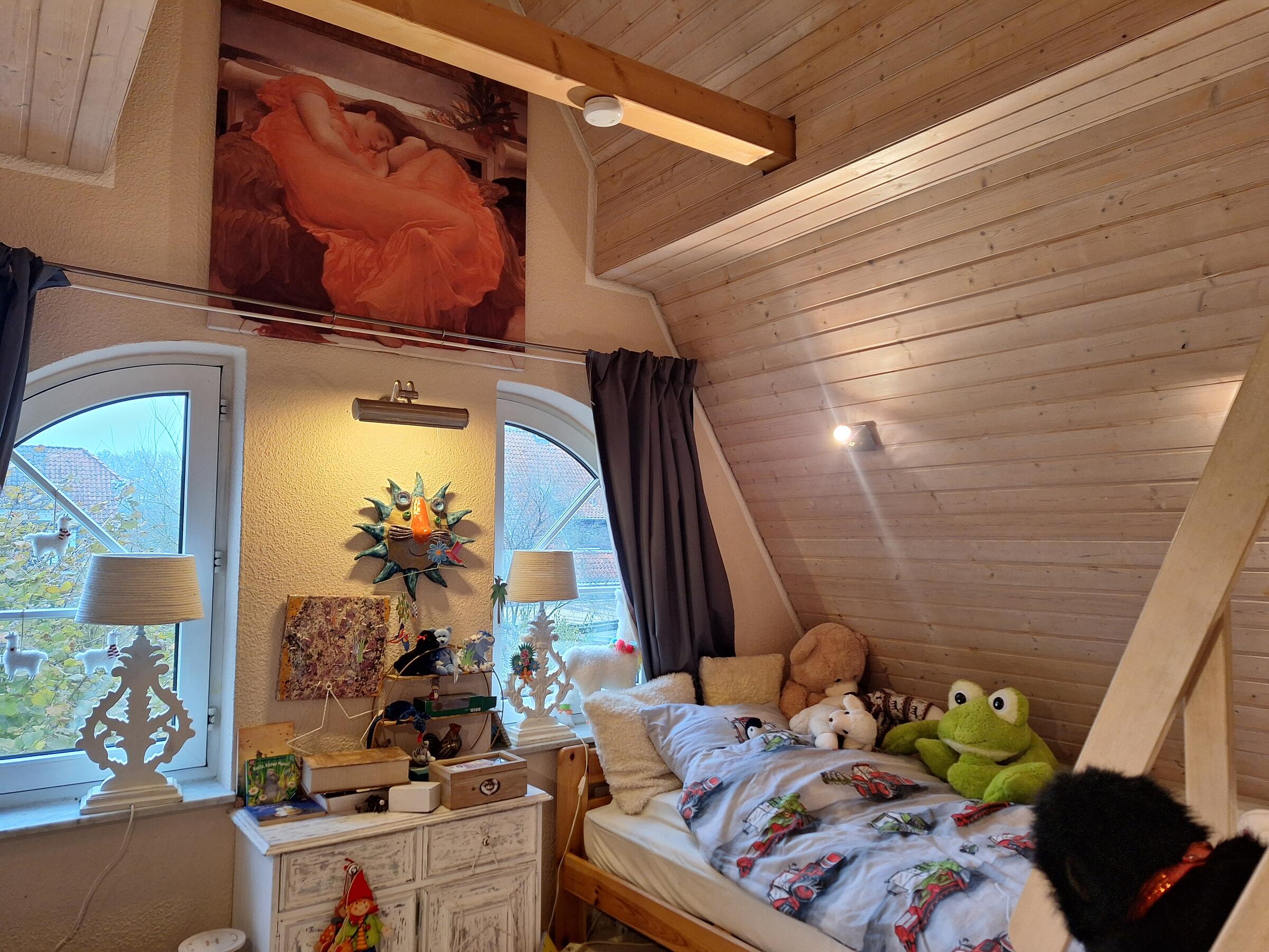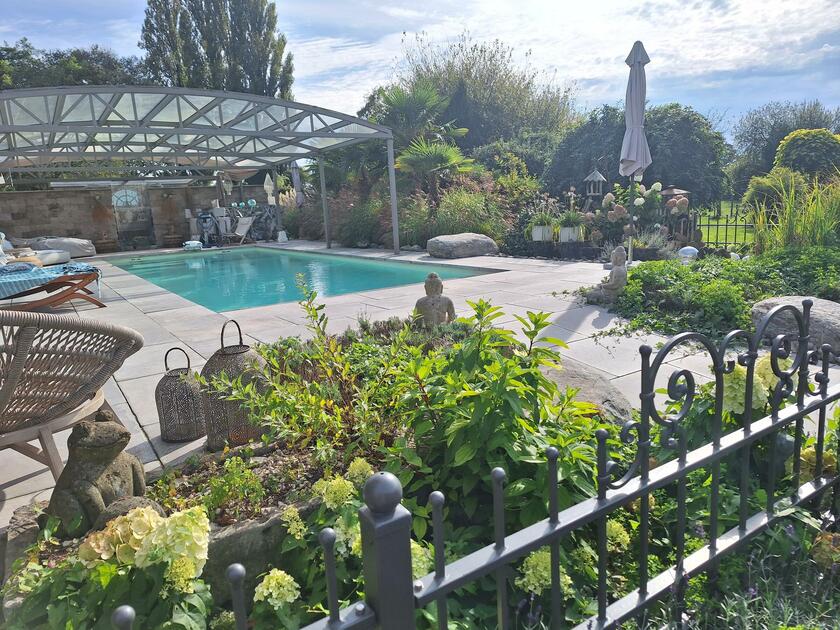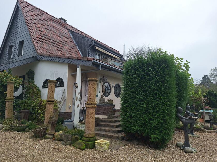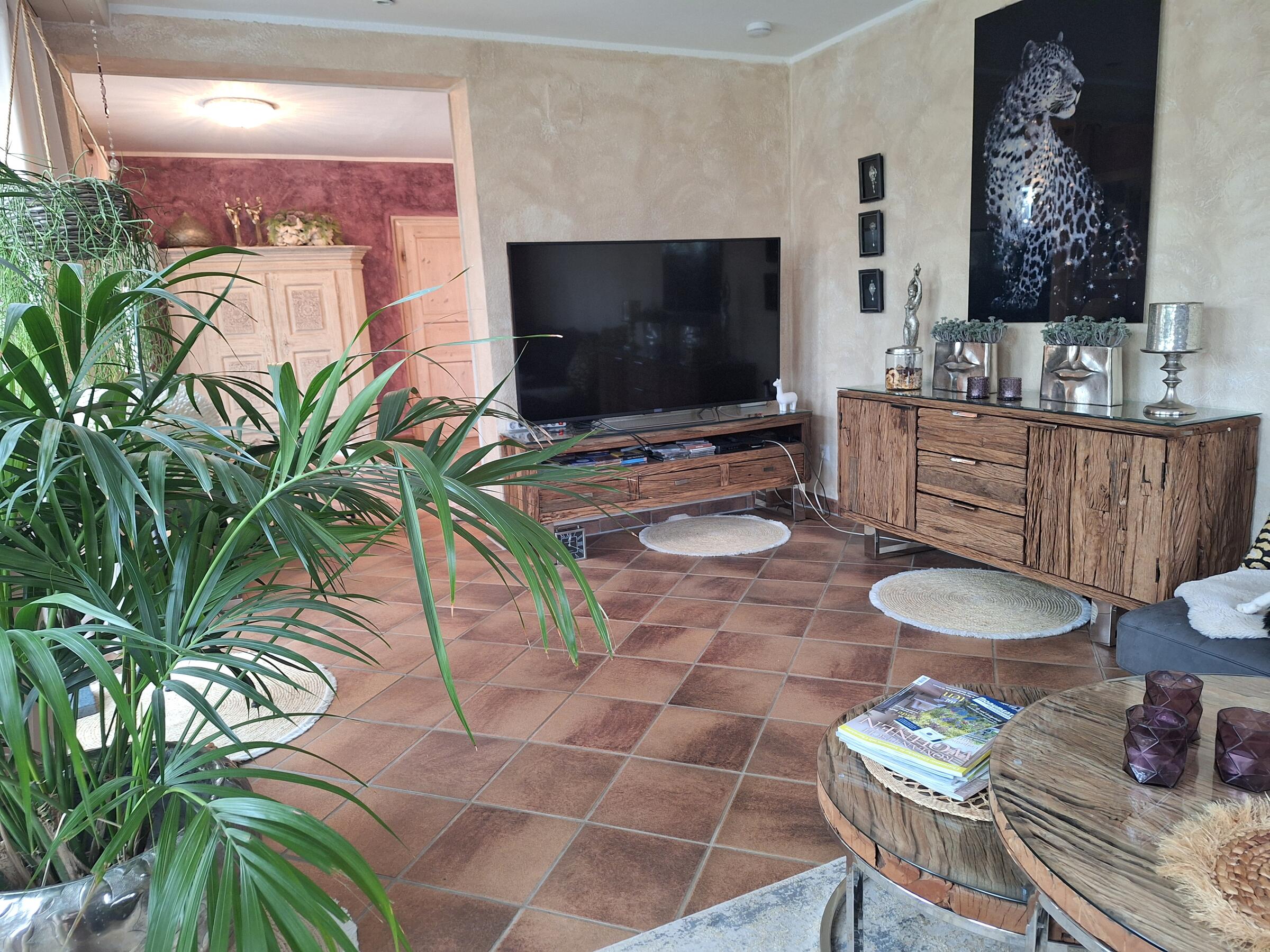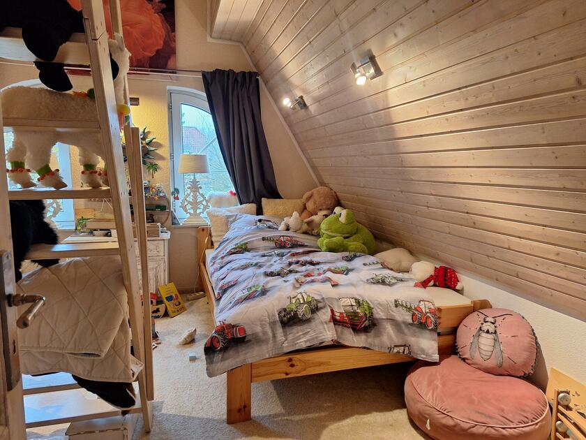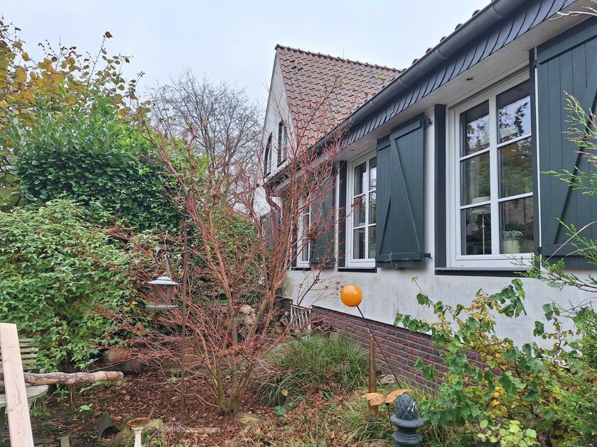 Unser Landhaus befindet sich in einer ruhigen Wohngegend, an einem Landschaftsschutzgebiet und umgeben von Feldern. Durch die teilweise bodentiefen Fenster fällt viel Tageslicht in die Wohnräume. Die Böden der Räume sind gefliest. Die Fenster der Räume können mit Vorhängen und teilweise mit Fensterläden verdunkelt werden. Die Räume dürfen nach Absprache umgestaltet werden. Im Außenbereich stehen der große Garten und der Pool zur Verfügung. Die Auffahrt unseres Grundstückes kann mit Lkw bis zu 7,5 t befahren werden. Mehrere Pkw können ebenfalls auf unserem Grundstück geparkt werden.