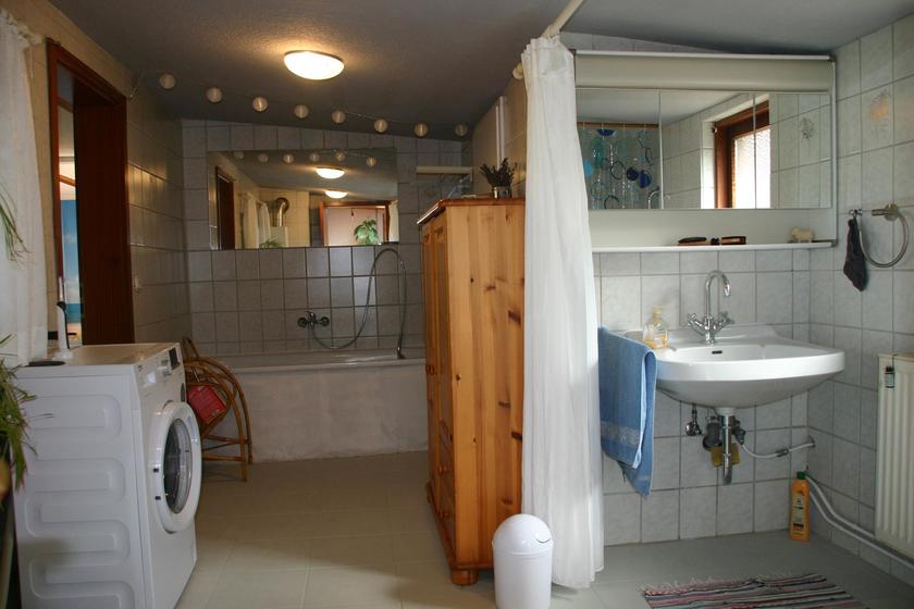 Das Haus ist komplett eingerichtet, das große Bad bietet Platz für die Maske, je nachdem, wo gedreht oder Fotos gemacht werden, eignen sich Schlaf- bzw. Wohnzimmer als Aufenthaltsraum und Garderobe an. Der Dachboden über dem Wohnzimmer ist unverkleidet und derzeit Lagerraum