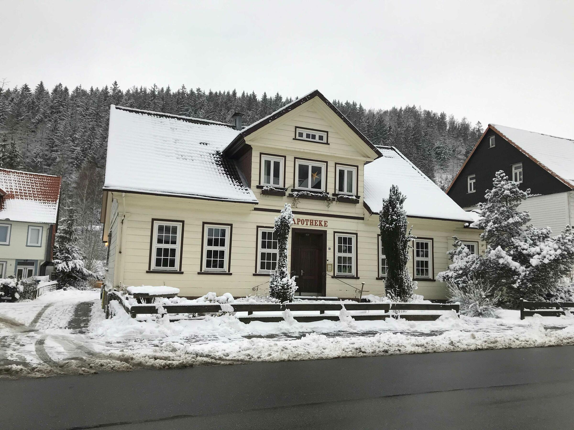 Das Fachwerkhaus mit seiner denkmalgeschützten Fassade ist ein ehemaliges Verwaltungsgebäude, das bis zum Jahr 2010 als Apotheke genutzt wurde. Das Haus wurde ca. 1840 während der Blütezeit des Silberbergbaus in Lautenthal errichtet. Neben den Wohn- und Schlafräumen stehen unter anderem die Küche, zwei Badezimmer, eines mit einer Sauna, der Hauswirtschaftsraum (ehemaliges Labor der Apotheke) und ein alter Gewölbekeller für Produktionen zur Verfügung. Der Hausrückseite ist auf ganzer Länge eine historische Veranda vorgelagert, die teilweise verglast ist. Zahlreiche historische Elemente wie beispielsweise ein Giftschrank und ein Phospor-Tresor sind ebenfalls vorhanden. Der Hausrückseite ist auf ganzer Länge eine historische Veranda vorgelagert, die teilweise verglast ist. Die „Alte Apotheke“ wird von uns als Eigentümer mit Freunden als Wochenendhaus und für Familienfeste genutzt und ist daher außerhalb der Ferien unter der Woche selten bewohnt. Parkplätze sind in unmittelbarer Nähe vorhanden.