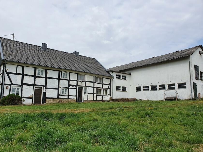 Unser leerstehender und nicht renovierter Bauernhof aus dem 18. Jahrhundert befindet sich auf einer Anhöhe außerorts. Der Hof besteht aus 2 miteinander verbundenen denkmalgeschützten Fachwerkhäusern, einem Stall und einer Scheune. In den nicht bewohnten Häusern stehen viele verschiedene Räume, Dachboden und Keller zur Verfügung. Die Gebäude bieten auch ausreichend Platz für Maske, Garderobe und Technik. Das ca. 3800 m² Grundstück bietet viel Platz und Möglichkeiten für Ihre Produktion. Hinter der Scheune gibt es zudem einen unverbauten Blick über leicht hügeligen Wiesen. Ein schöner Wald mit einem kleinen Bach ist in nur wenigen Gehminuten erreichbar. Die Anlage ist ganzjährig verfügbar. Parkplätze sind in ausreichender Zahl auf dem Hof vorhanden.
