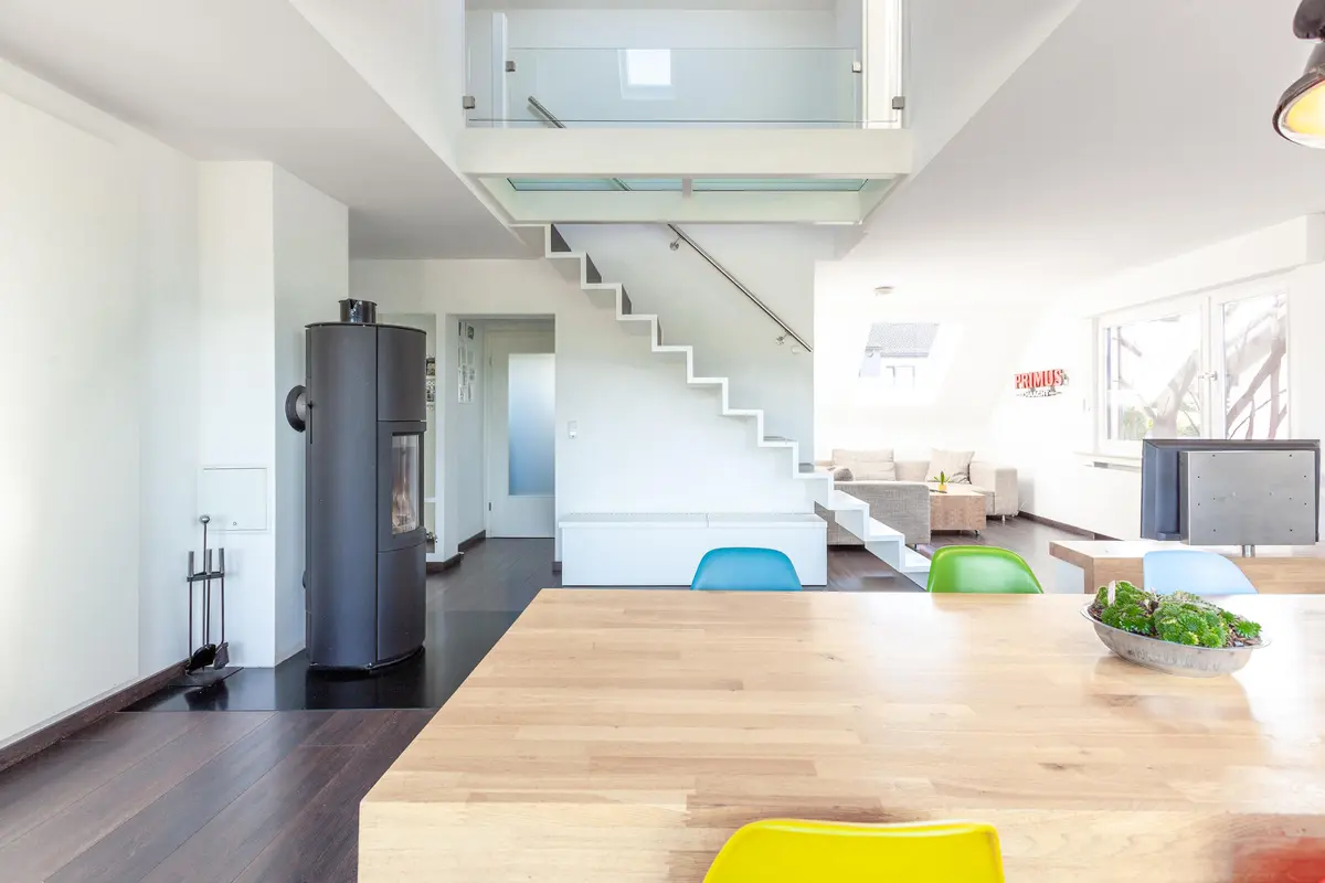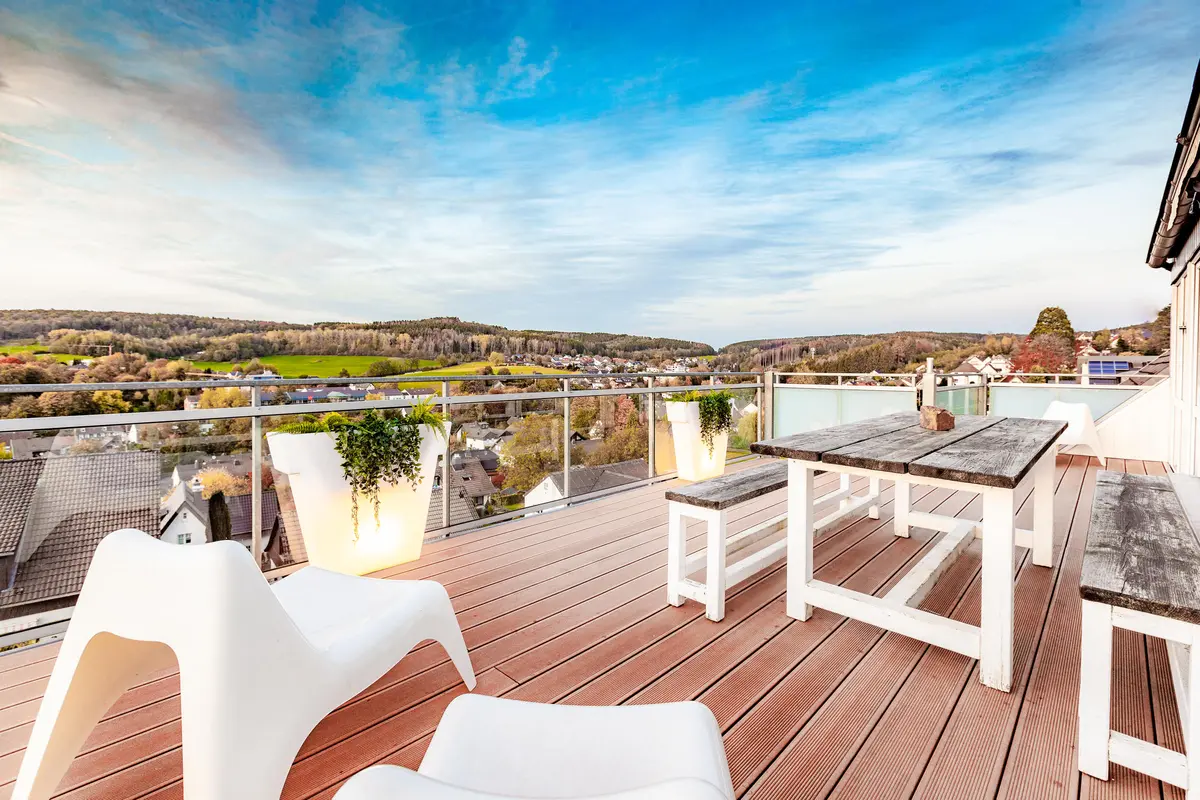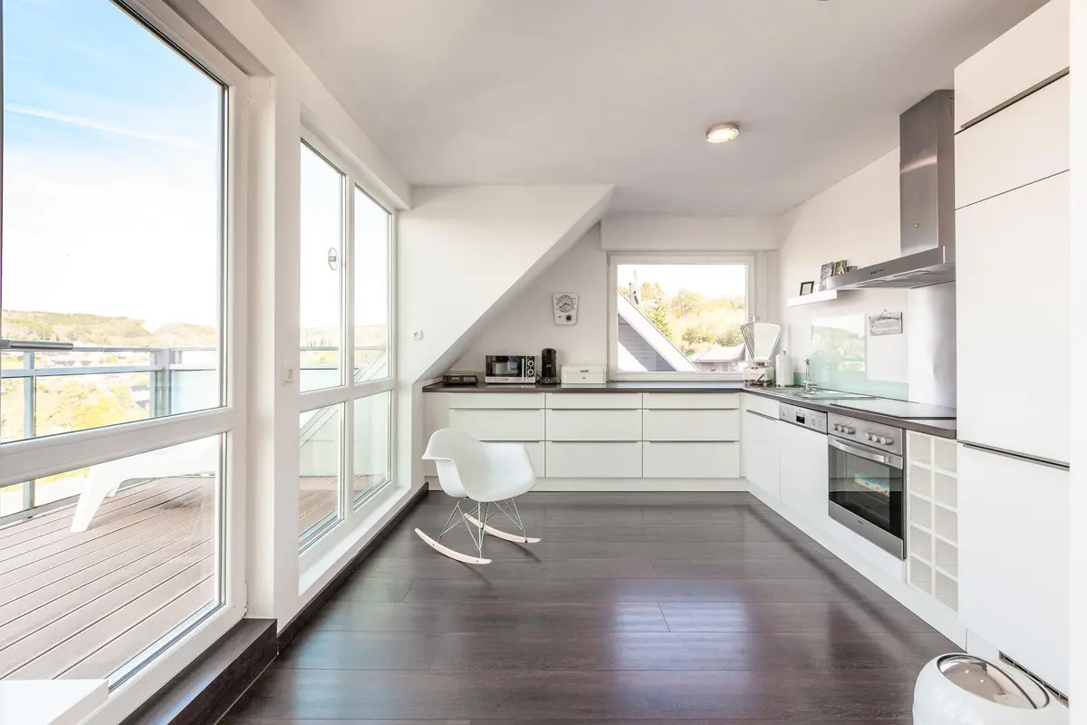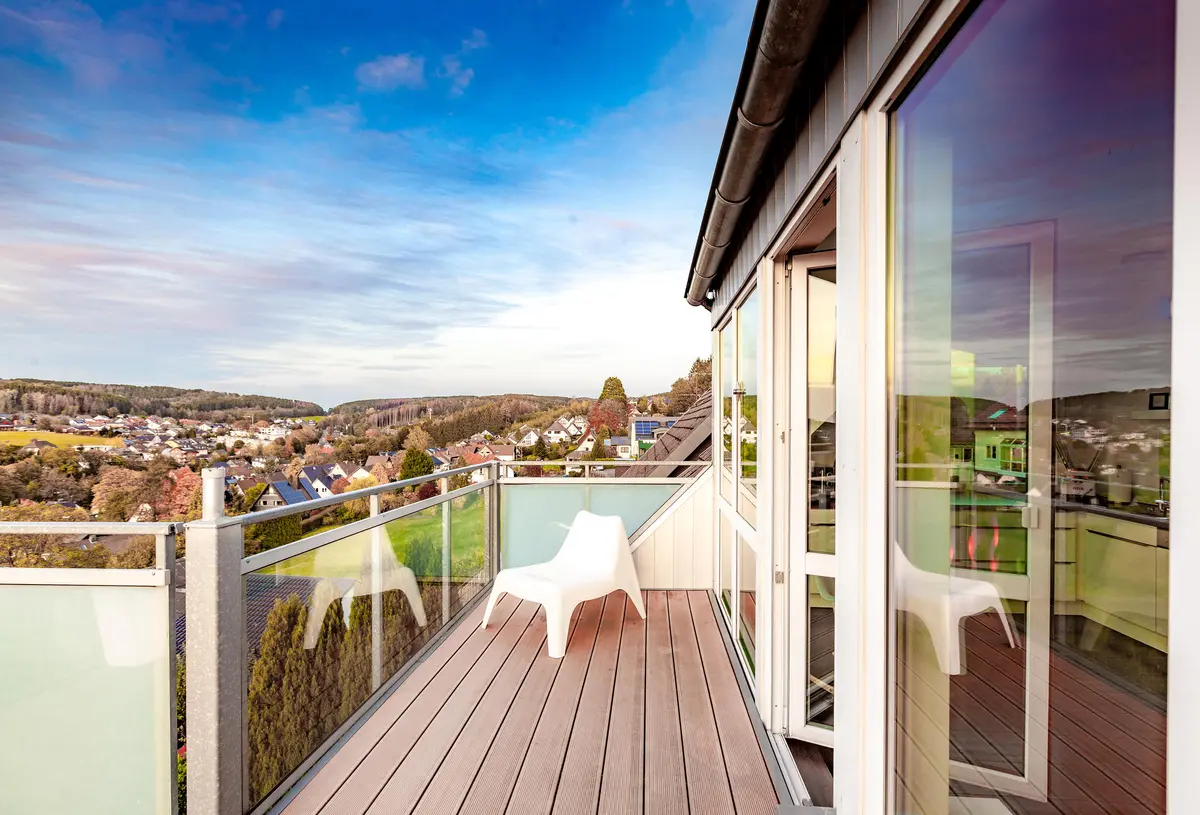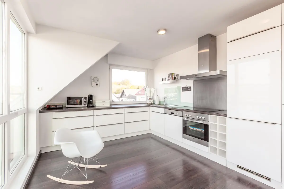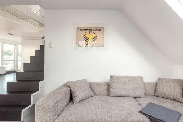 Die Dachgeschosswohnung ist geschmackvoll mit Design-Klassikern möbliert und erstreckt sich über 2 Etagen. Eine begehbare Glasbrücke befindet sich im oberen Bereich der Wohnung. Die Wohnung verfügt über eine moderne Küche und einen Kamin. Der untere Wohnraum ist offen mit Übergängen von Küche zum Essbereich bis zum Wohnzimmerbereich. Das Badezimmer hat eine Dusche. Die überdachte Dachterrasse mit einer 6 m großen Markise bietet die spektakulärste Aussicht der Gemeinde Lindlar. Es stehen 5 Parkplätze kostenfreie Parkplätze zur Verfügung.