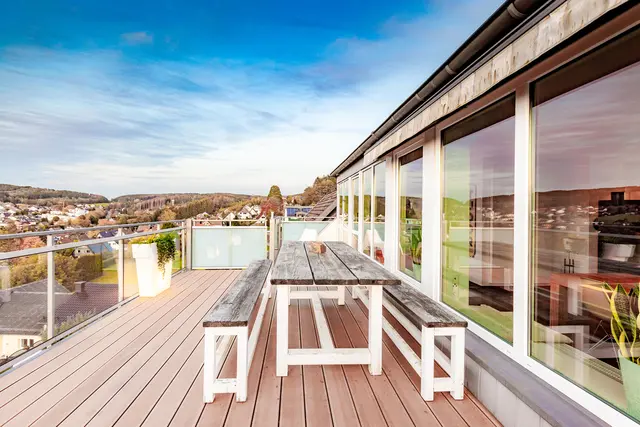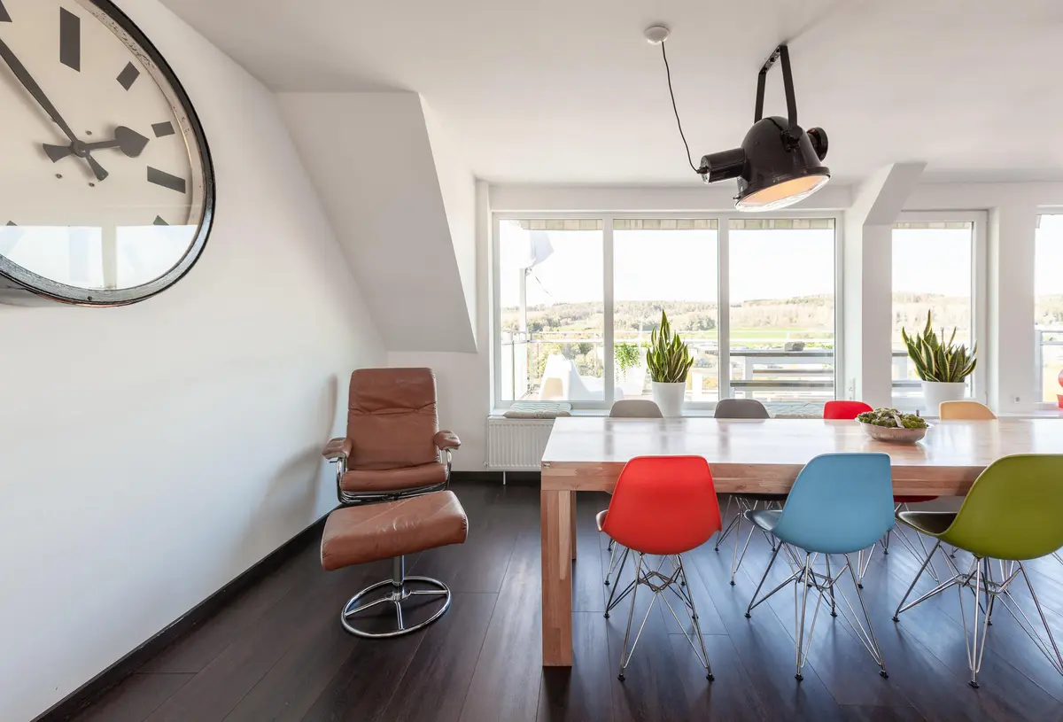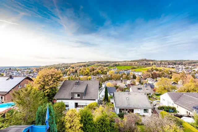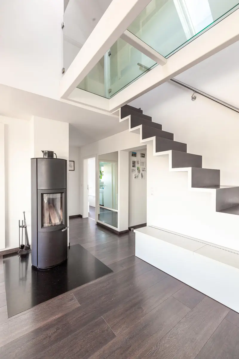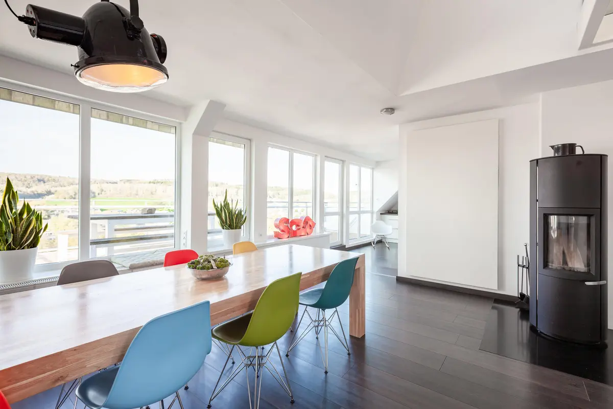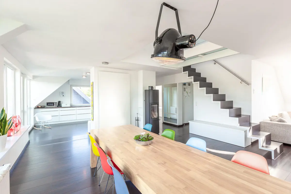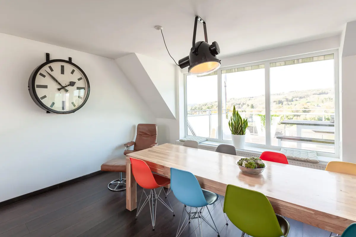 Die Dachgeschosswohnung ist geschmackvoll mit Design-Klassikern möbliert und erstreckt sich über 2 Etagen. Eine begehbare Glasbrücke befindet sich im oberen Bereich der Wohnung. Die Wohnung verfügt über eine moderne Küche und einen Kamin. Der untere Wohnraum ist offen mit Übergängen von Küche zum Essbereich bis zum Wohnzimmerbereich. Das Badezimmer hat eine Dusche. Die überdachte Dachterrasse mit einer 6 m großen Markise bietet die spektakulärste Aussicht der Gemeinde Lindlar. Es stehen 5 Parkplätze kostenfreie Parkplätze zur Verfügung.