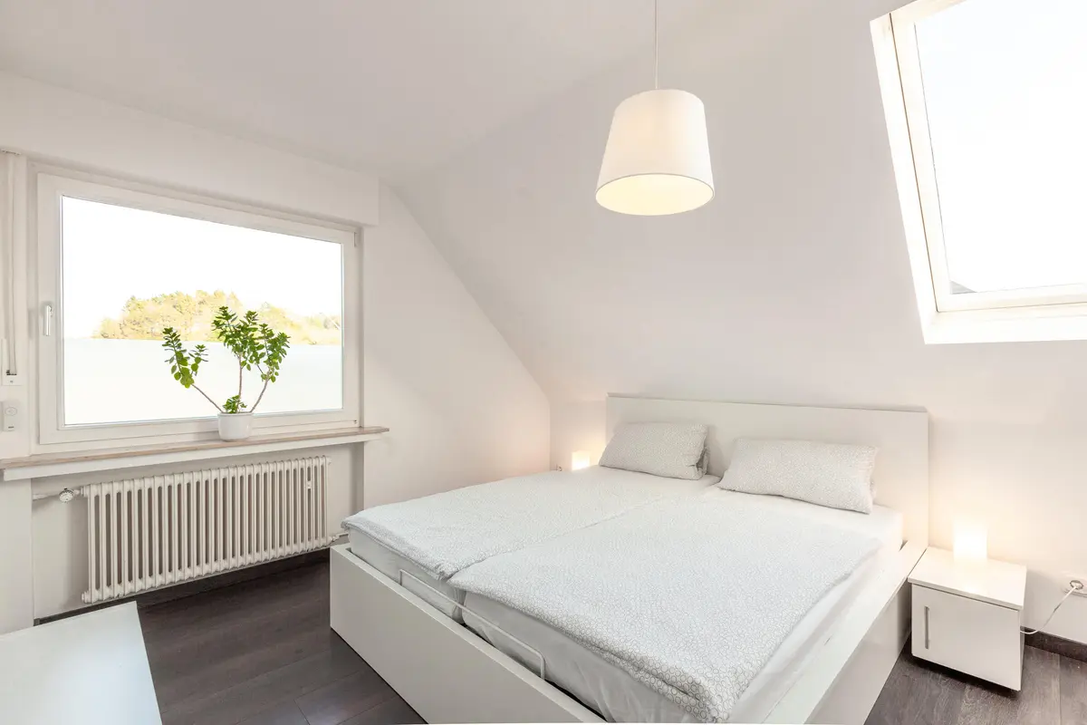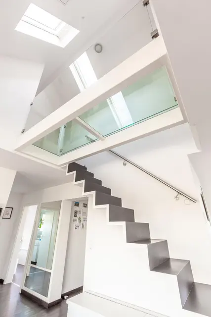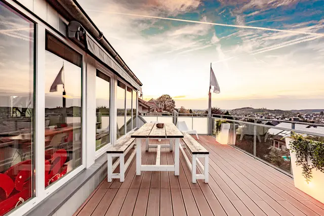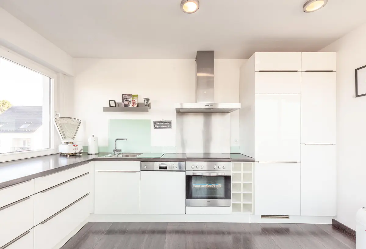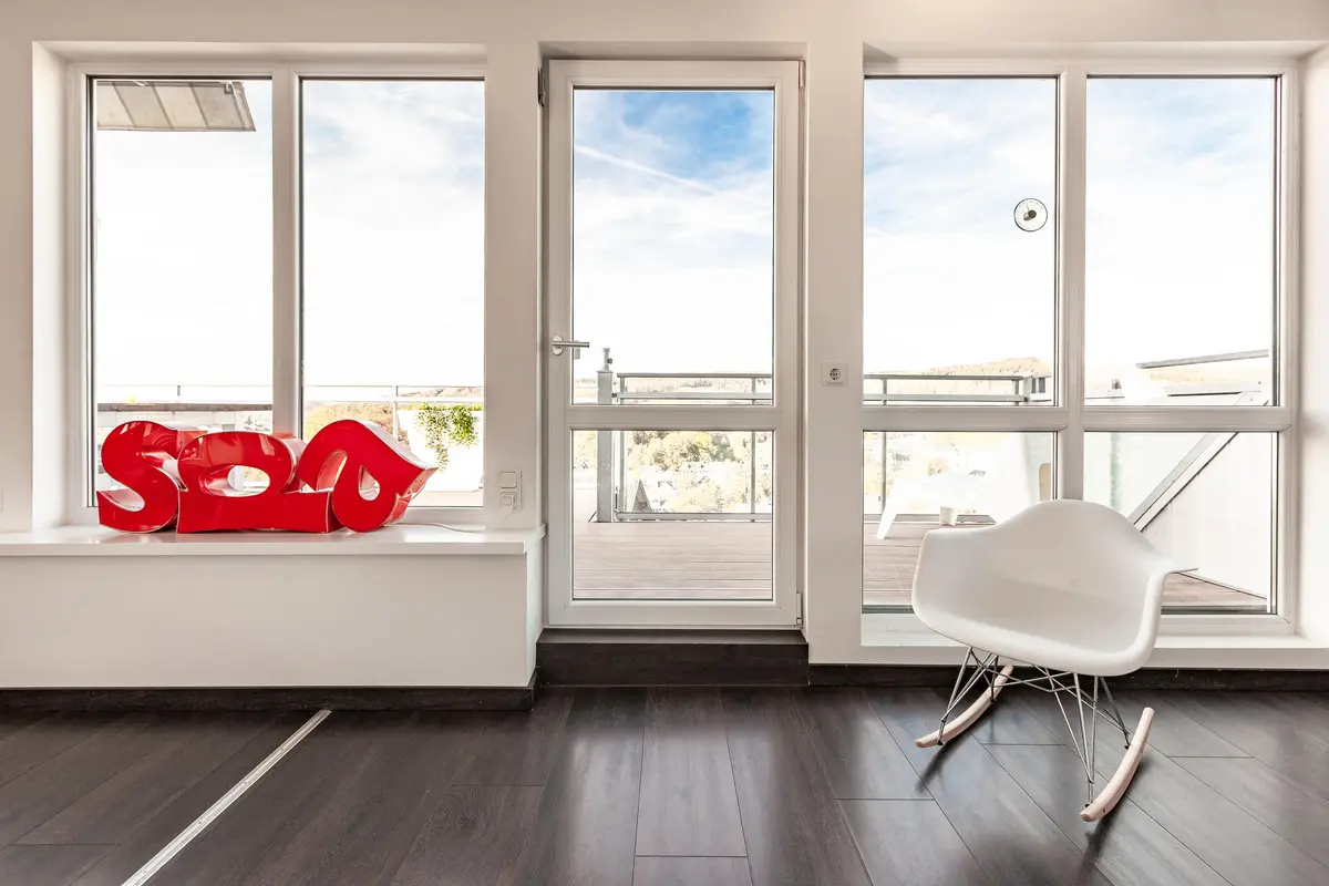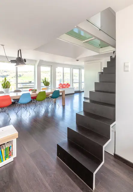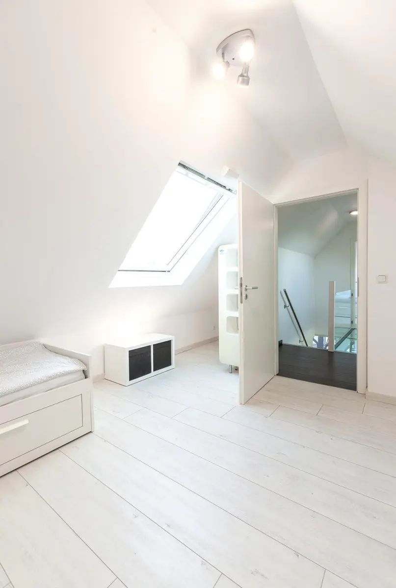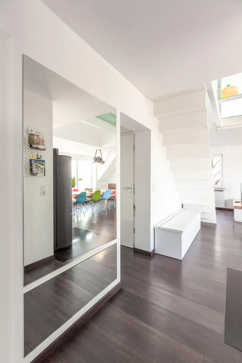 Die Dachgeschosswohnung ist geschmackvoll mit Design-Klassikern möbliert und erstreckt sich über 2 Etagen. Eine begehbare Glasbrücke befindet sich im oberen Bereich der Wohnung. Die Wohnung verfügt über eine moderne Küche und einen Kamin. Der untere Wohnraum ist offen mit Übergängen von Küche zum Essbereich bis zum Wohnzimmerbereich. Das Badezimmer hat eine Dusche. Die überdachte Dachterrasse mit einer 6 m großen Markise bietet die spektakulärste Aussicht der Gemeinde Lindlar. Es stehen 5 Parkplätze kostenfreie Parkplätze zur Verfügung.
