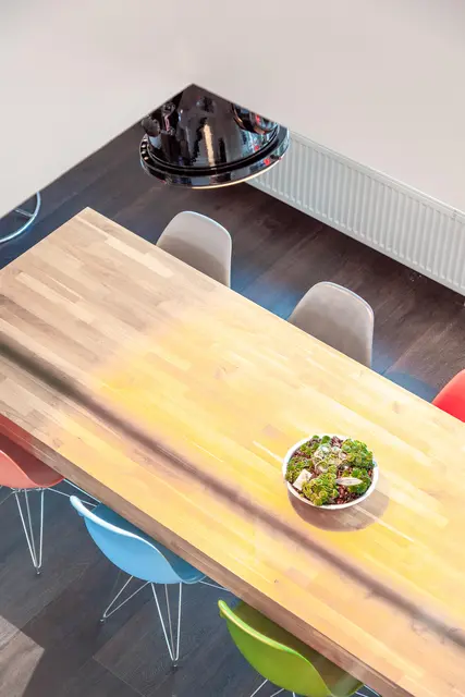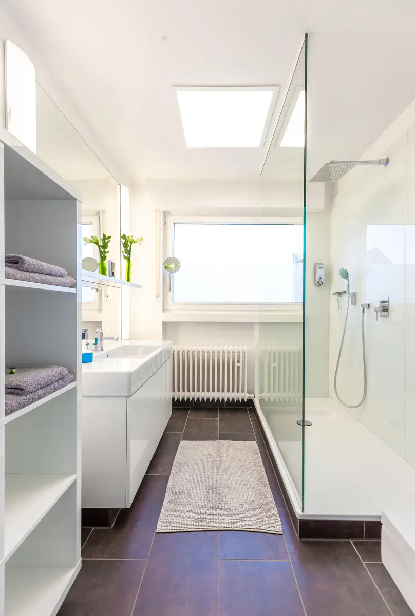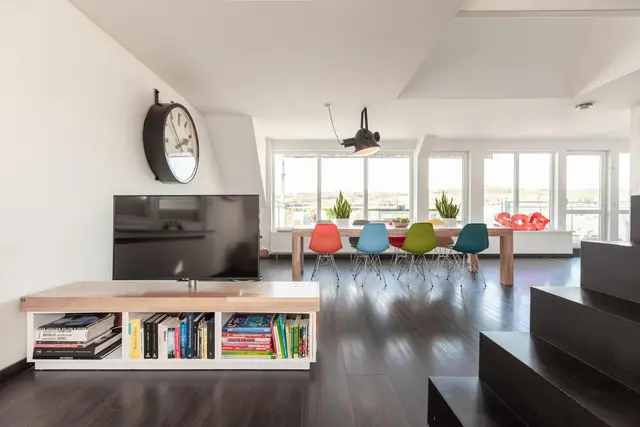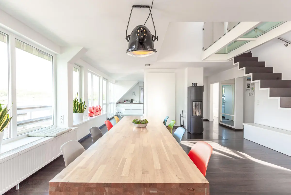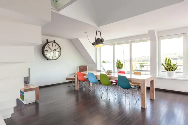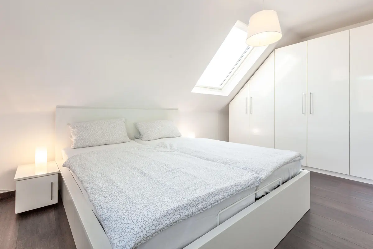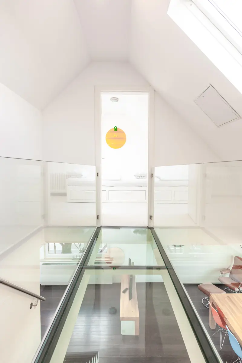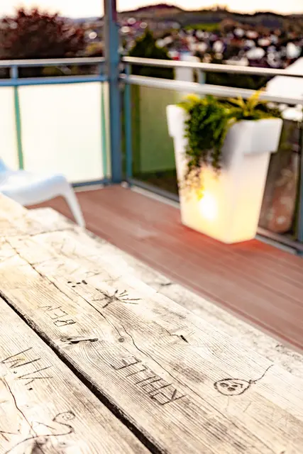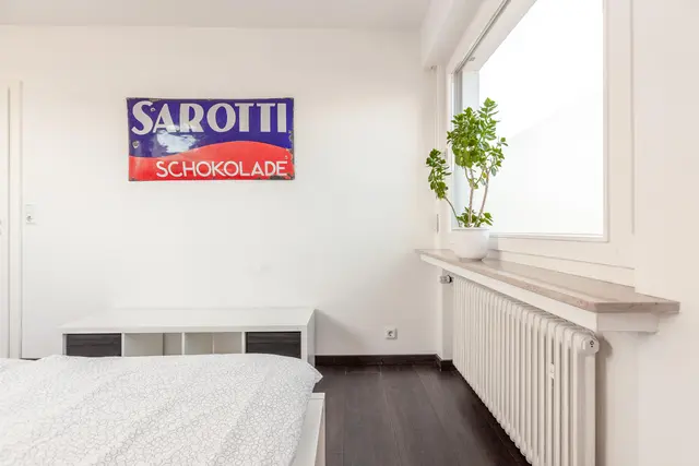 Die Dachgeschosswohnung ist geschmackvoll mit Design-Klassikern möbliert und erstreckt sich über 2 Etagen. Eine begehbare Glasbrücke befindet sich im oberen Bereich der Wohnung. Die Wohnung verfügt über eine moderne Küche und einen Kamin. Der untere Wohnraum ist offen mit Übergängen von Küche zum Essbereich bis zum Wohnzimmerbereich. Das Badezimmer hat eine Dusche. Die überdachte Dachterrasse mit einer 6 m großen Markise bietet die spektakulärste Aussicht der Gemeinde Lindlar. Es stehen 5 Parkplätze kostenfreie Parkplätze zur Verfügung.