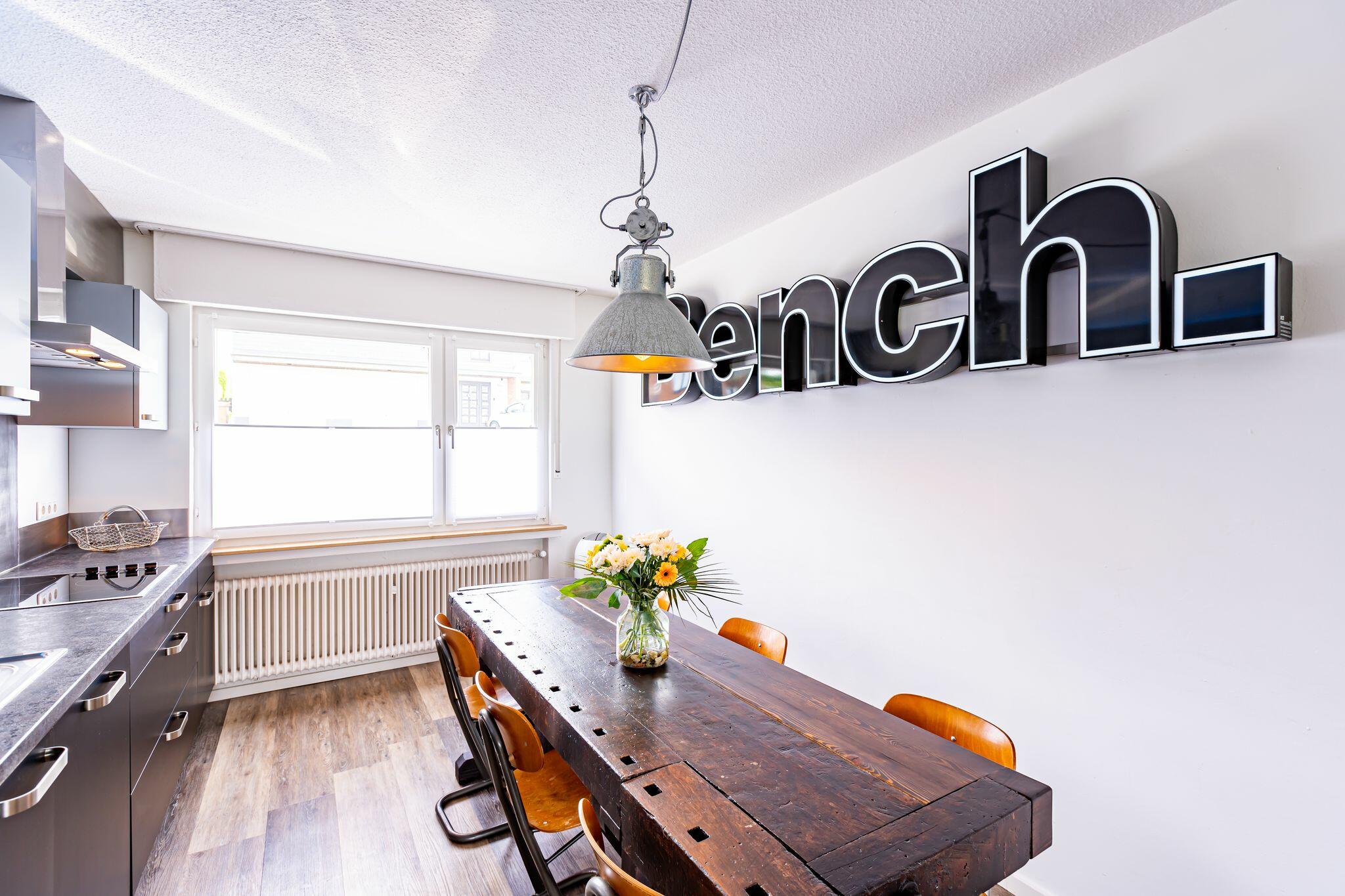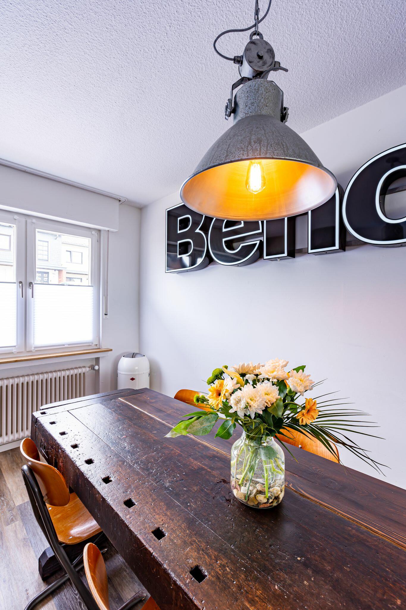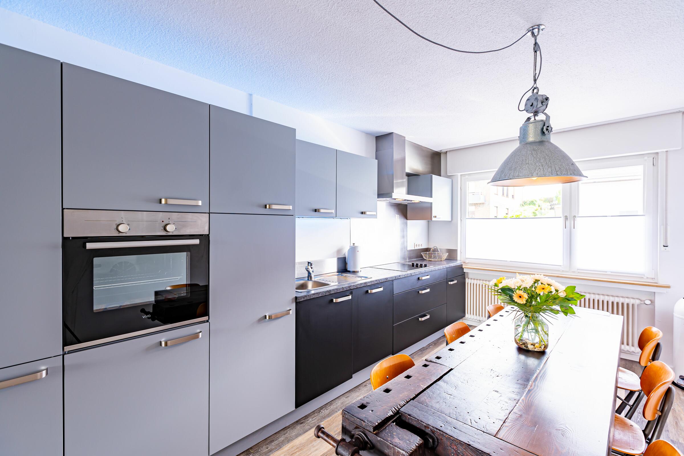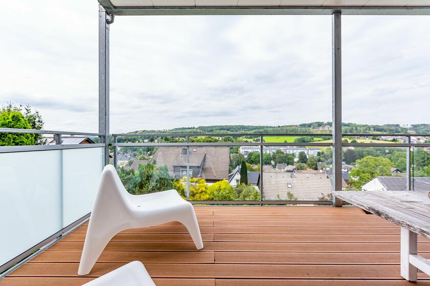 Unsere helle und moderne Architektenwohnung ist geschmackvoll mit Design-Klassikern eingerichtet. Das große und lichtdurchflutete Wohnzimmer bietet viel Platz für Produktionen. In der modern eingerichteten Küche befindet sich ebenfalls ein großer Esstisch, der 8 Personen Platz bietet. Die Fenster aller Räume der Wohnung können mit Rollläden abgedunkelt werden. Die Böden der Räume sind mit hochwertigem Laminat ausgelegt. Die Wände sind alle weiß gestrichen. Die große Terrasse ist vollständig überdacht. Es stehen 3 kostenfreie Parkplätze sowie eine verschließbare Garage für Ihre Produktion zur Verfügung.