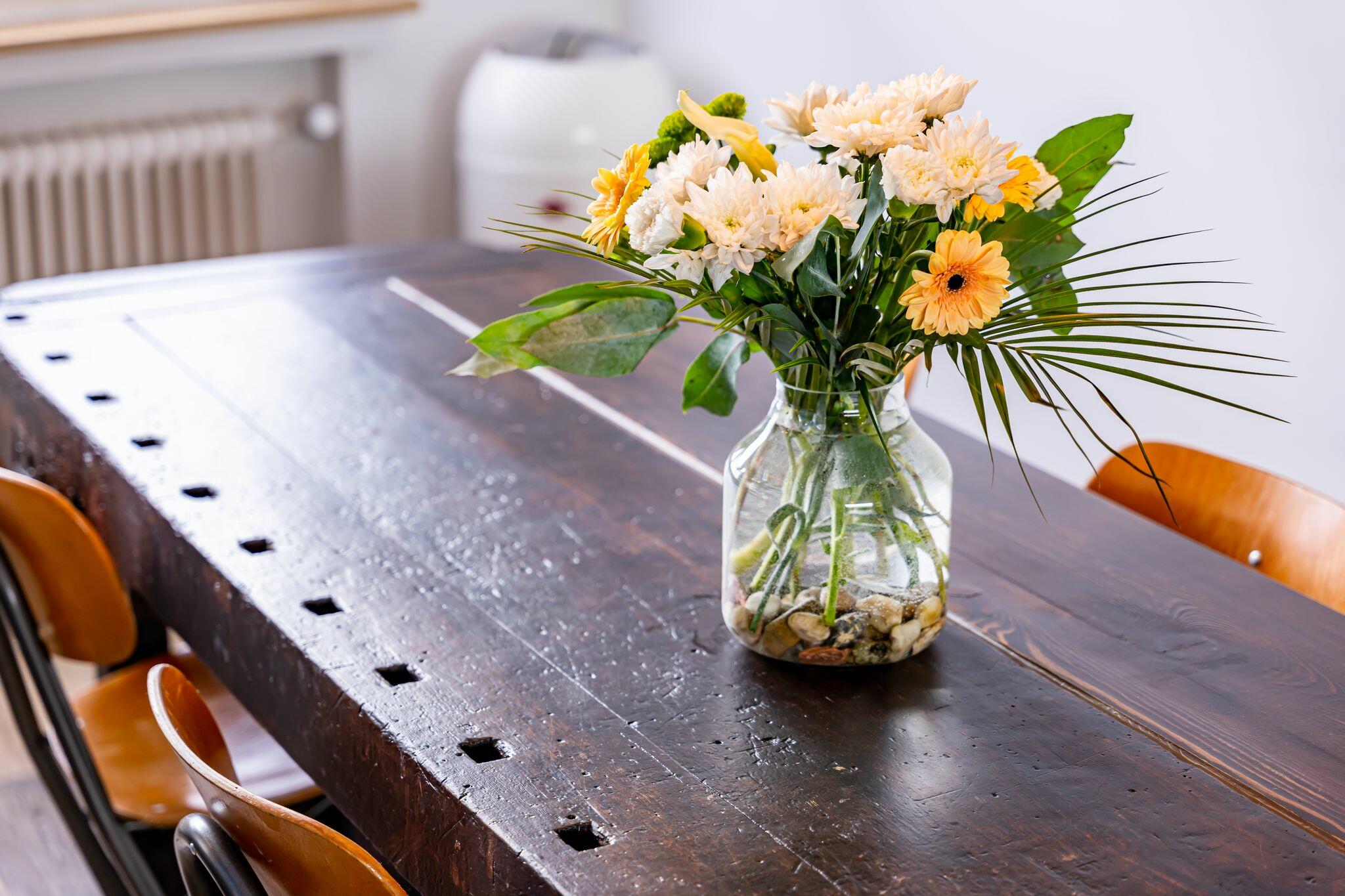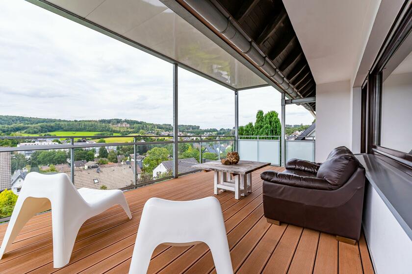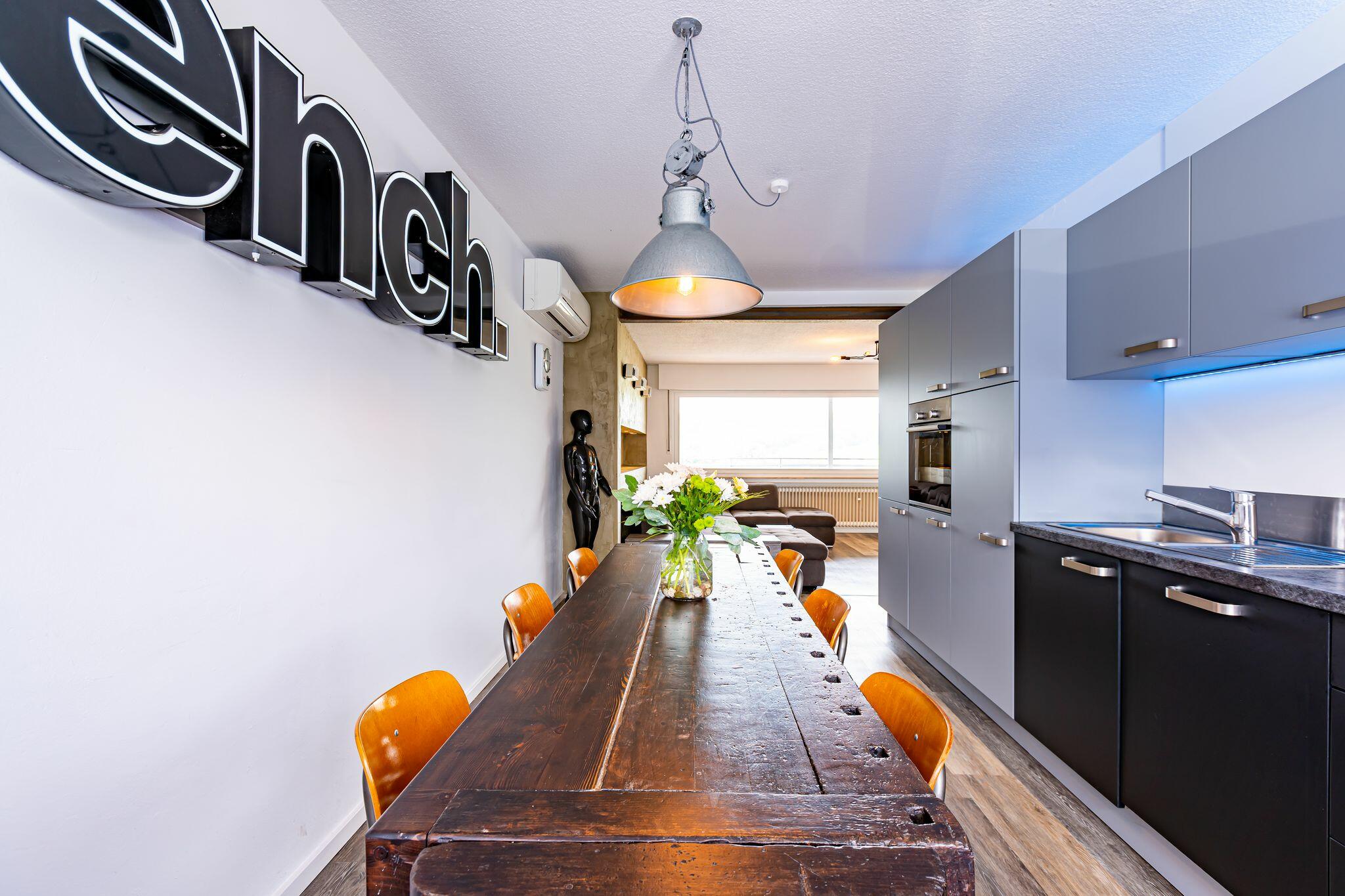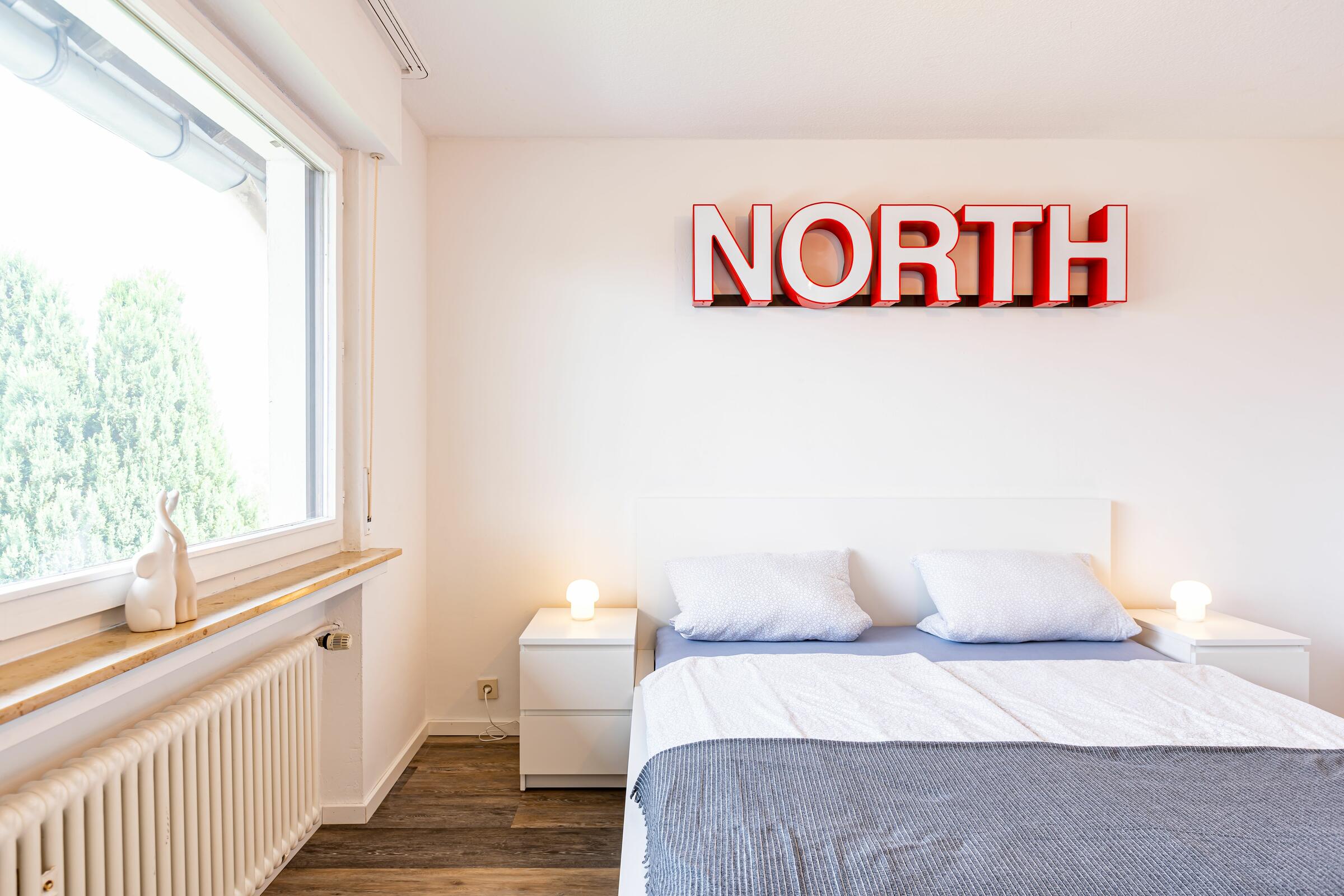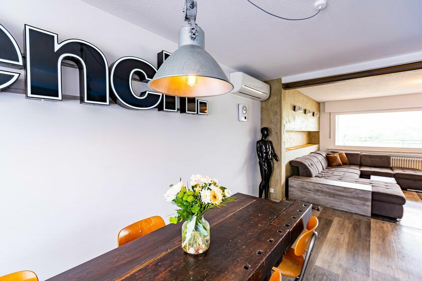 Unsere helle und moderne Architektenwohnung ist geschmackvoll mit Design-Klassikern eingerichtet. Das große und lichtdurchflutete Wohnzimmer bietet viel Platz für Produktionen. In der modern eingerichteten Küche befindet sich ebenfalls ein großer Esstisch, der 8 Personen Platz bietet. Die Fenster aller Räume der Wohnung können mit Rollläden abgedunkelt werden. Die Böden der Räume sind mit hochwertigem Laminat ausgelegt. Die Wände sind alle weiß gestrichen. Die große Terrasse ist vollständig überdacht. Es stehen 3 kostenfreie Parkplätze sowie eine verschließbare Garage für Ihre Produktion zur Verfügung.