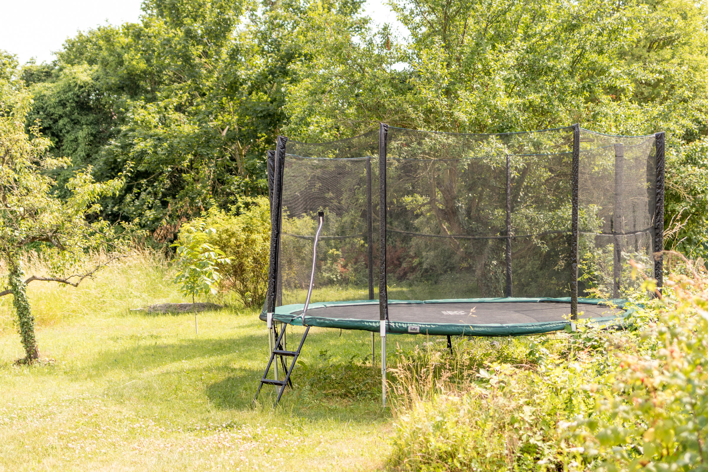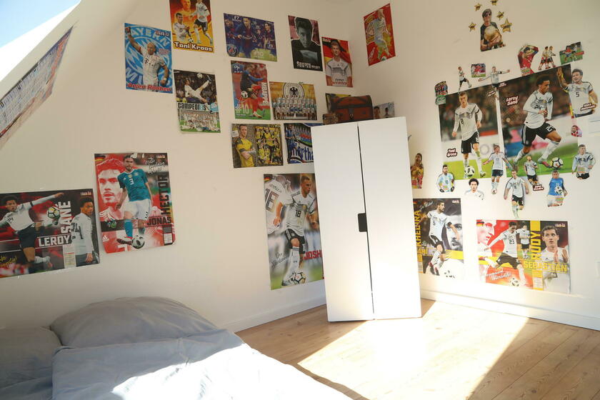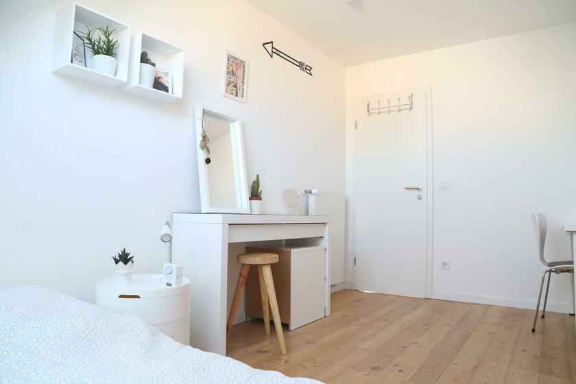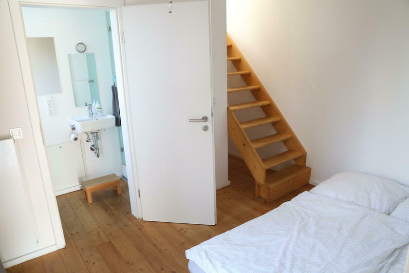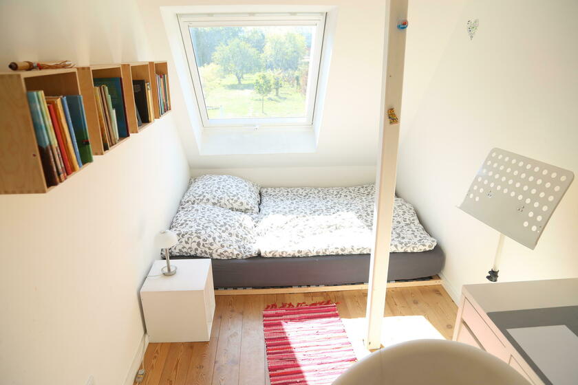 Im "Familienhaus" stehen rund 100 m² Wohnfläche auf zwei Etagen zur Verfügung, hierzu zählt ein Seitenflügel (Westausrichtung) mit Schlafzimmern für Kindergartenkinder sowie Erwachsene. Ein großer Wohn- und Essbereich mit integrierter Wohnküche liegt im Erdgeschoss, vier weitere Kinder- und Jugendzimmer sowie ein modernes Bad mit Wanne findet sich im 1. Obergeschoss des Landhauses. Die Ausstattung der Räume besteht aus geölten Natur-Holzdielenböden und einer stilvollen hellen Möblierung, darunter auch hochwertige Designklassiker wie Arne-Jacobsen-Stühle und Tolomäo-Lampen.