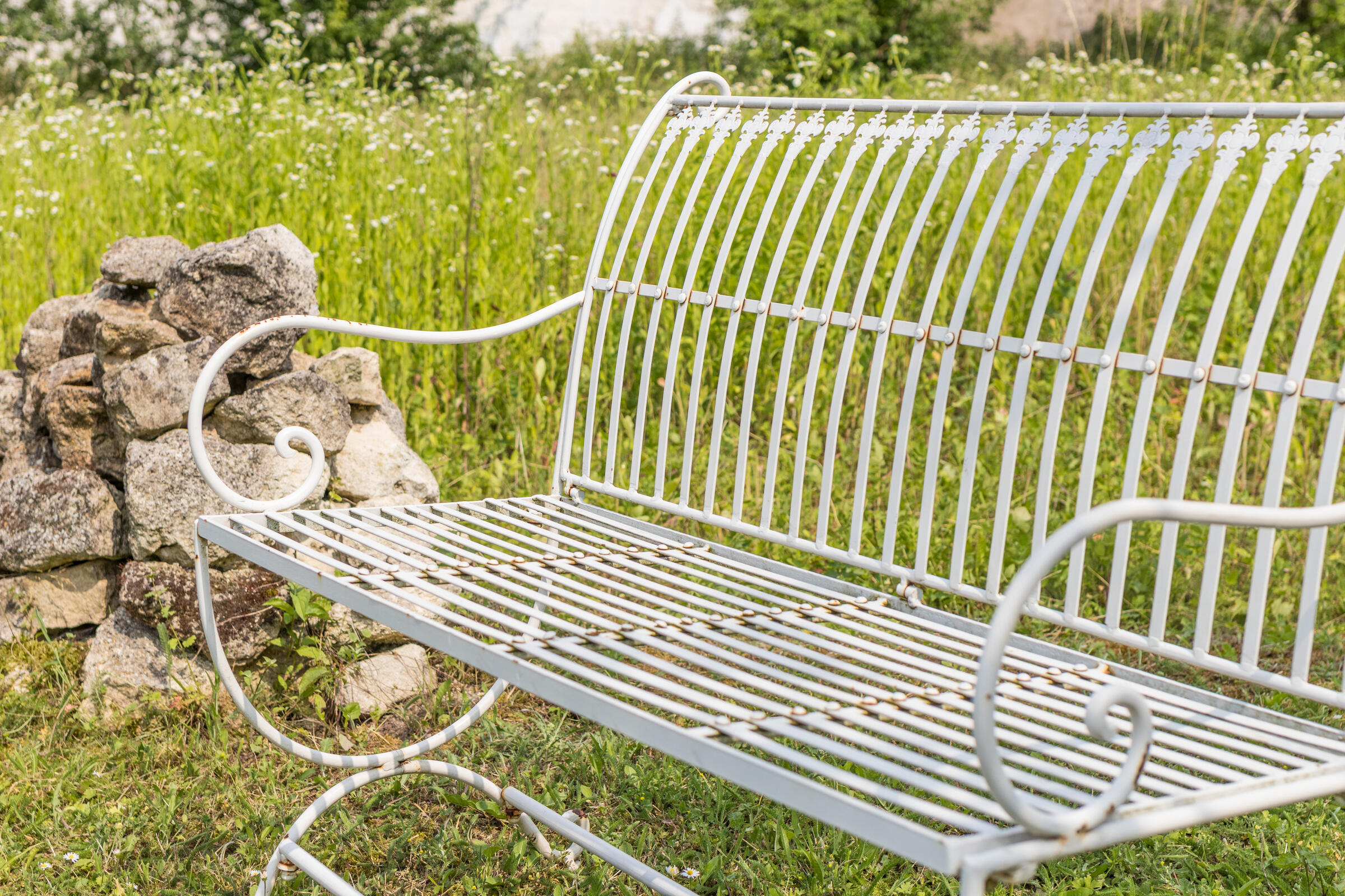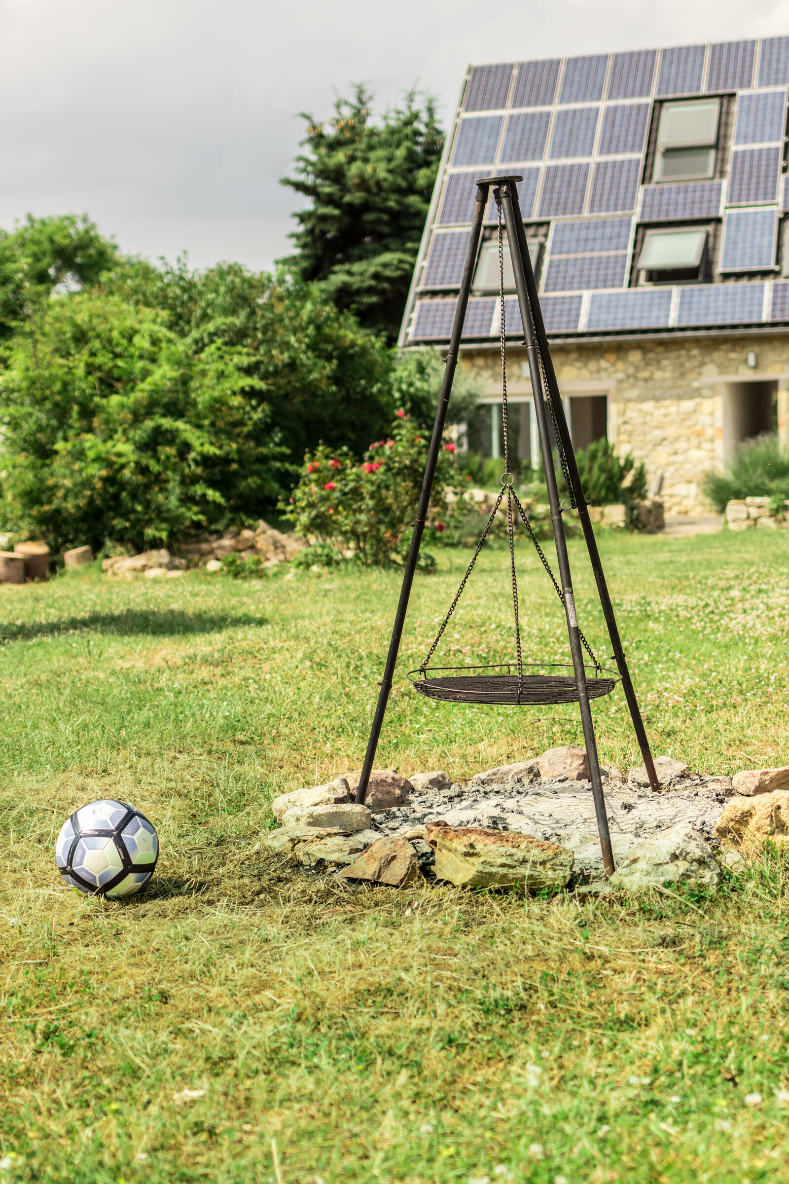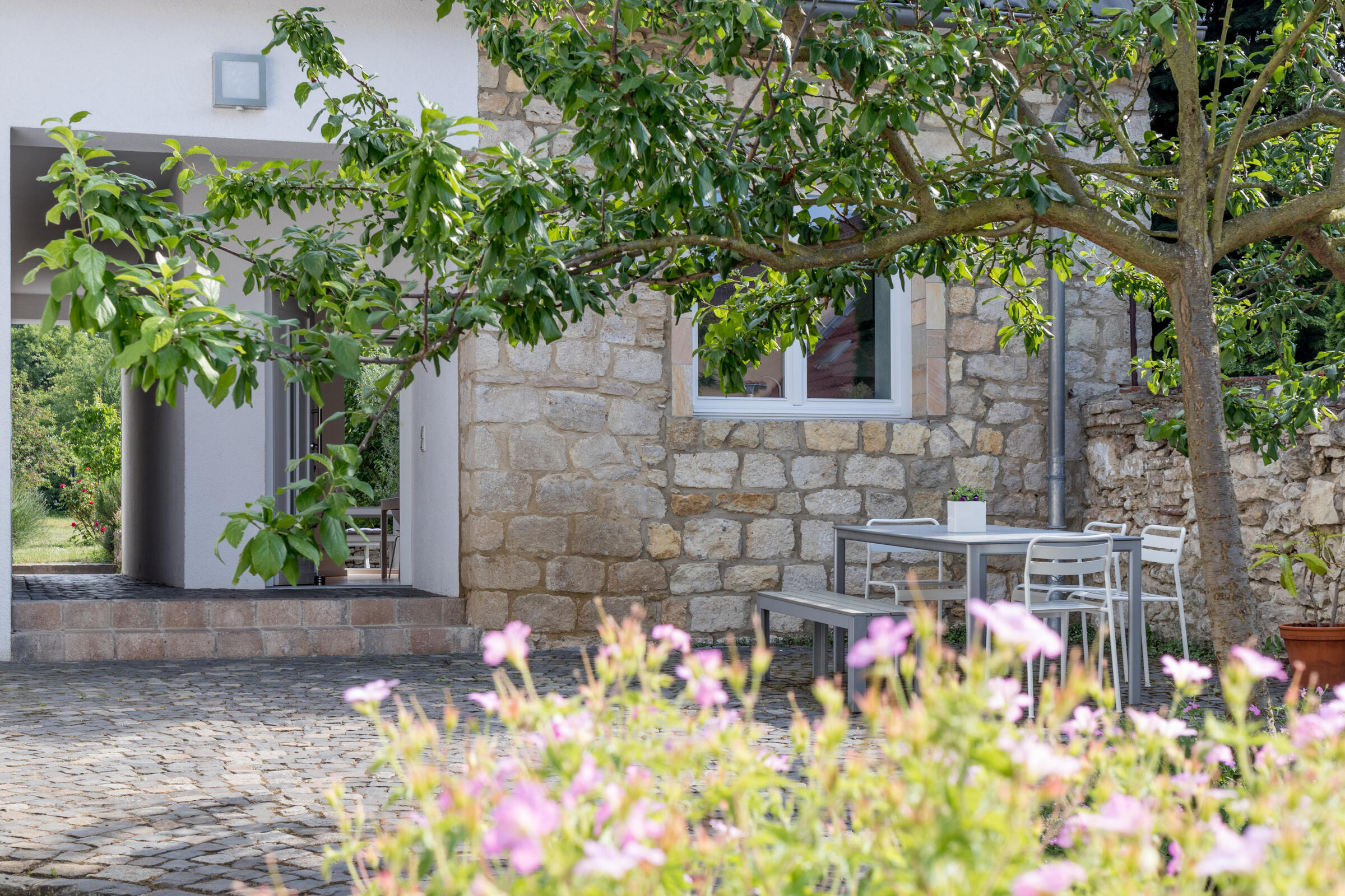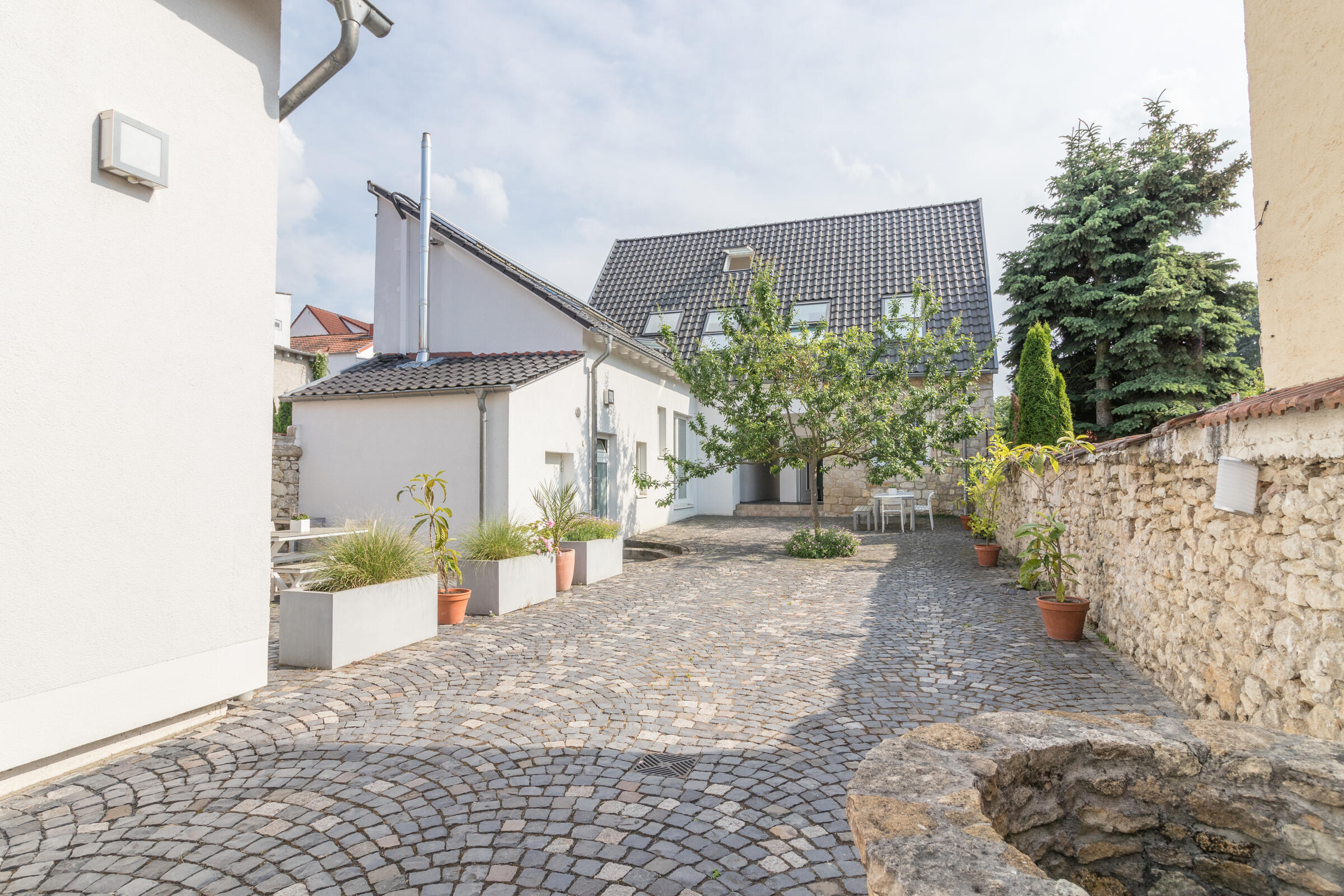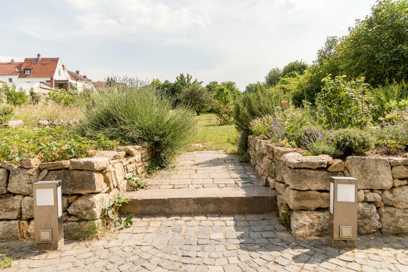 Der große, mediterrane Innenhof mit in Segmentbögen verlegtem Kopfsteinpflaster ist von urigen Bruchsteinmauern eingefasst und bietet zusammen mit der Bepflanzung und der geschmackvollen Möblierung eine hohe Aufenthaltsqualität. Im baulich geschützten Naturgarten gibt es viele alte Obstbäume, Blumenwiesen sowie Rasenflächen. Er ist im Naherholungsgebiet "In der Au" gelegen, durch das auch der Aubach fließt und an dem keine Straßen entlangführen. Die Außenanlagen sind für Film- und Fotoaufnahmen nutzbar.