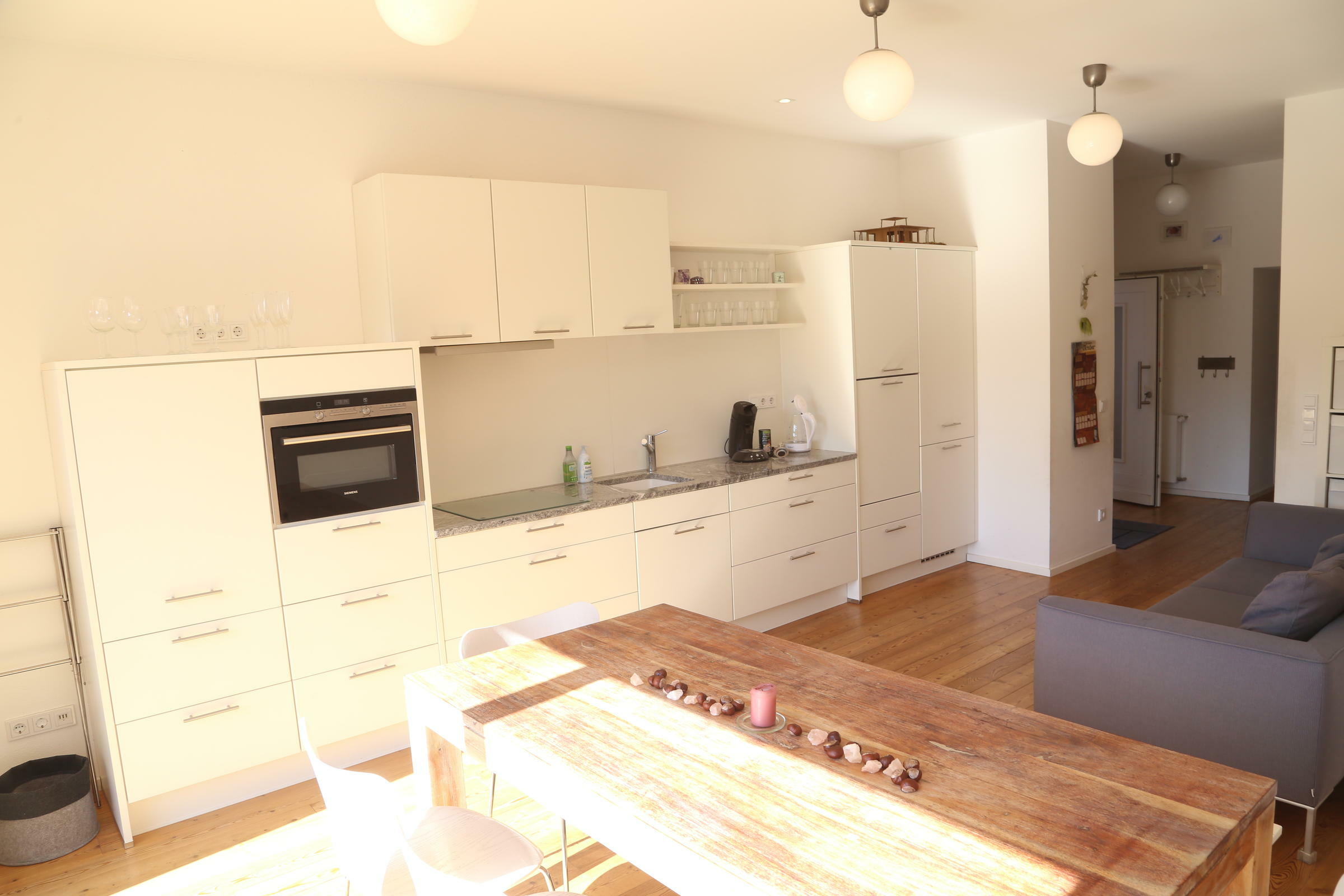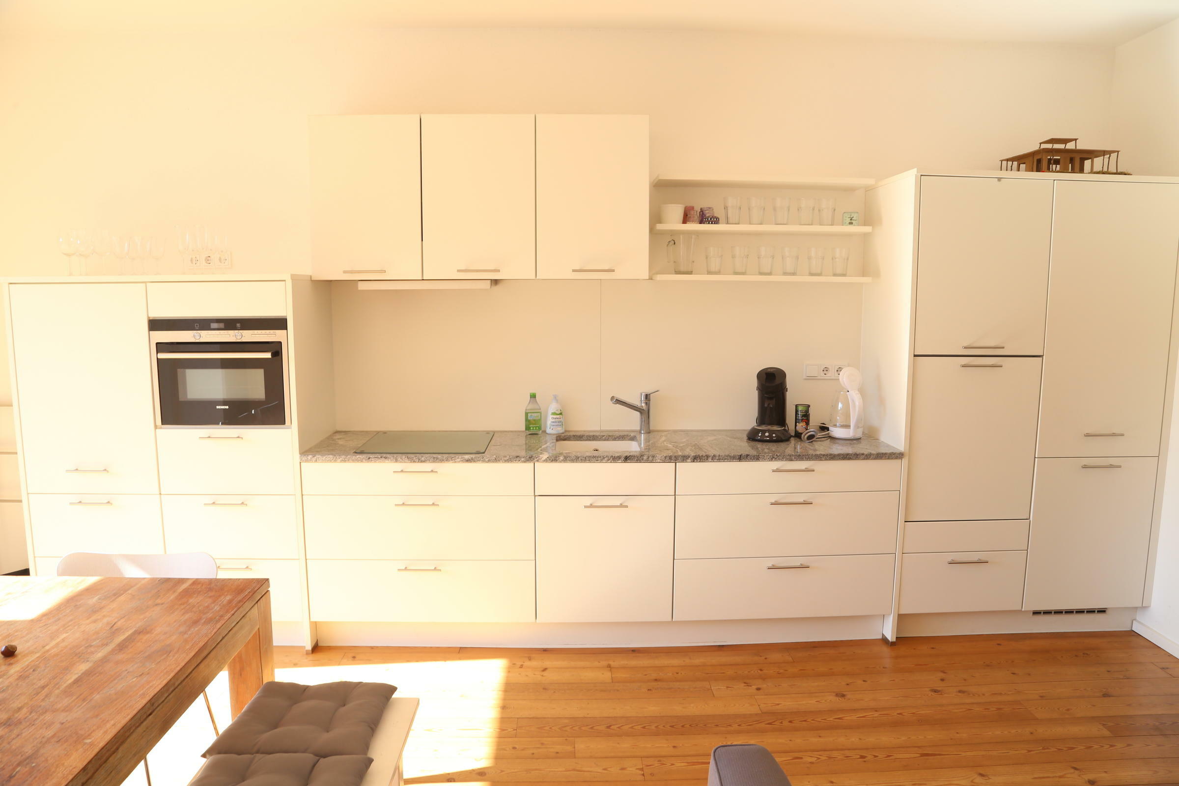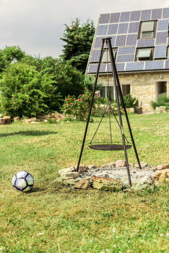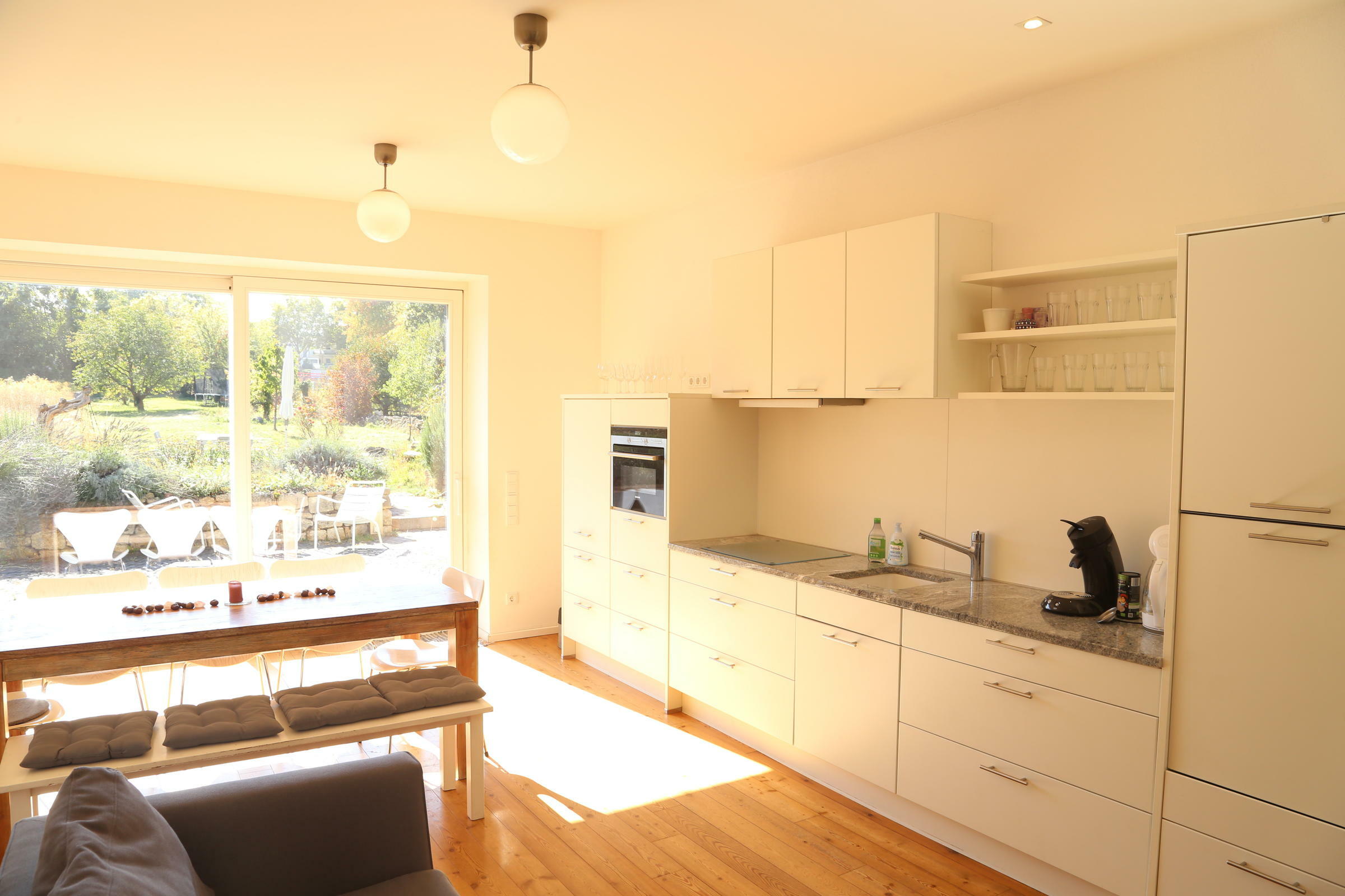 Die Wohnbereiche sind sehr hell, die Möbel weiß oder cremefarben und die Wände mit weißer Bio-Silikat Farbe gestrichen. Mit dem warmen Ton der Böden entsteht ein lichtes, charmantes Ambiente. In allen Schlafzimmer befinden sich Doppelbetten sowie eine Schlafcouch, die Holzbalken der Dachkonstruktion sind freigelegt. In den Schlafzimmern stehen zum Teil Einzelbetten, zum Teil Doppelbetten zur Verfügung. Die Küche ist neu und besitzt alle Geräte. Im Erdgeschoss sind Abstellkammern und Platz für Technik und Logistik. Das ökologisch nachhaltige Gebäude wird von einer Pellet-Heizanlage beheizt, und der Strom kommt vom eigenen Dach. Zum Anwesen gehört außerdem ein alter Gewölbekeller mit Lehmboden, der von außen, über den Hof, erschlossen werden kann.