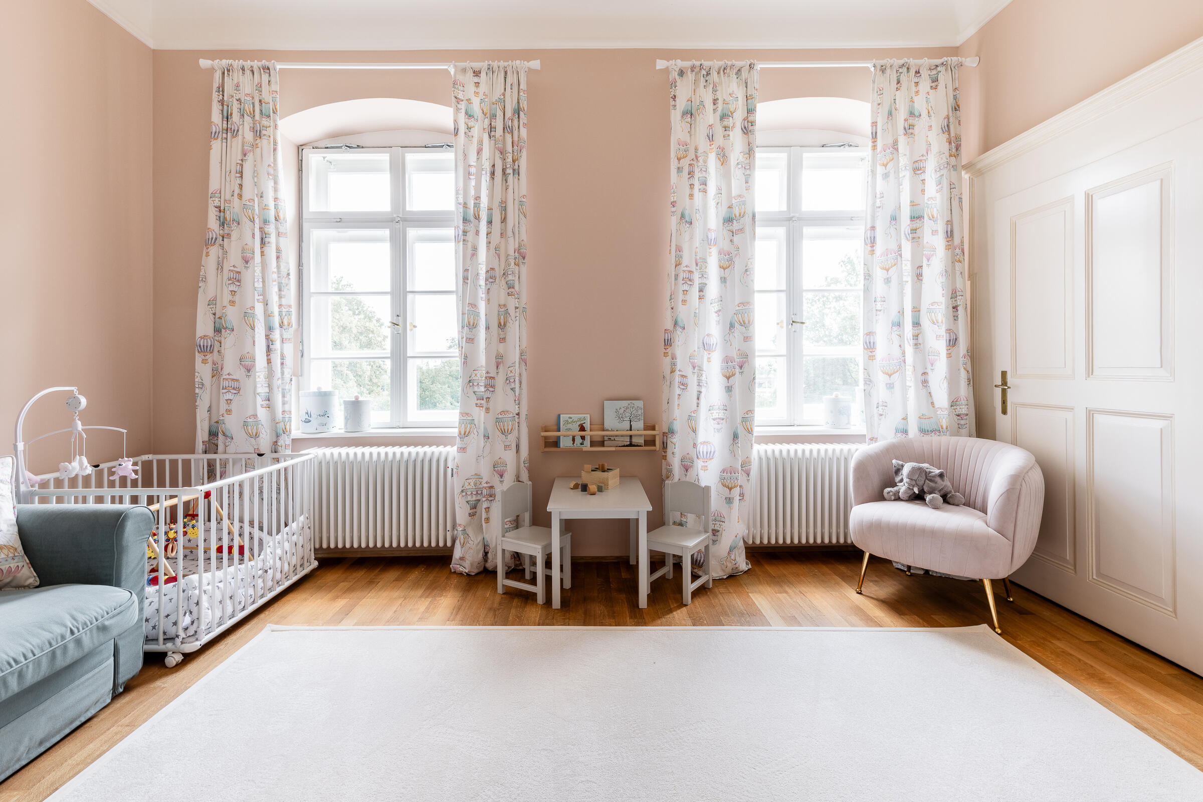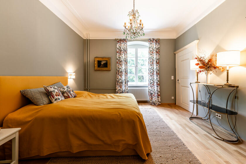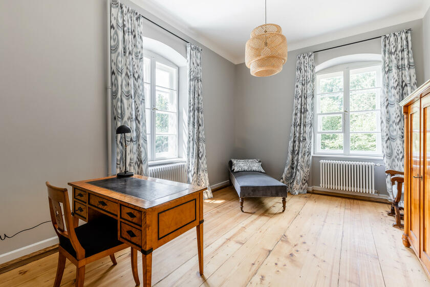 Das Barockschloss wurde im Jahr 1752 als dreigeschossiger Walmdachbau mit acht zu drei Achsen und einem Turm in der Westfassade erbaut. Das Schloss ist von einem 8 ha großem Wald und einem Englischen Park aus dem 19. Jahrhundert umgeben. In die Räume fällt natürliches Sonnenlicht. Die Fenster können mit vorhandenen Vorhängen abgedunkelt werden. Die Räume haben bis zu 3 m hohe Decken und die Böden bestehen aus Holz- und Steinverlegungen. Es sind ebenfalls Räume für Teamaufenthalt, Maske und Garderobe vorhanden. Es sind 8 Parkplätze und eine große Einfahrt vorhanden. Energieabrechnung erfolgt bei Produktionen nach genauem Stromzählerstand.